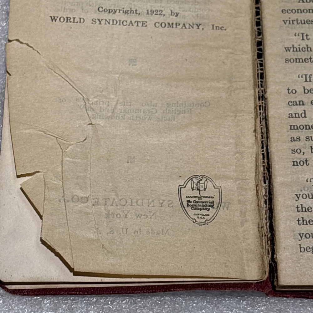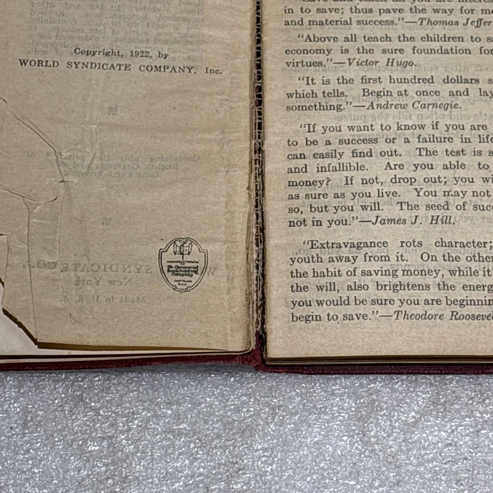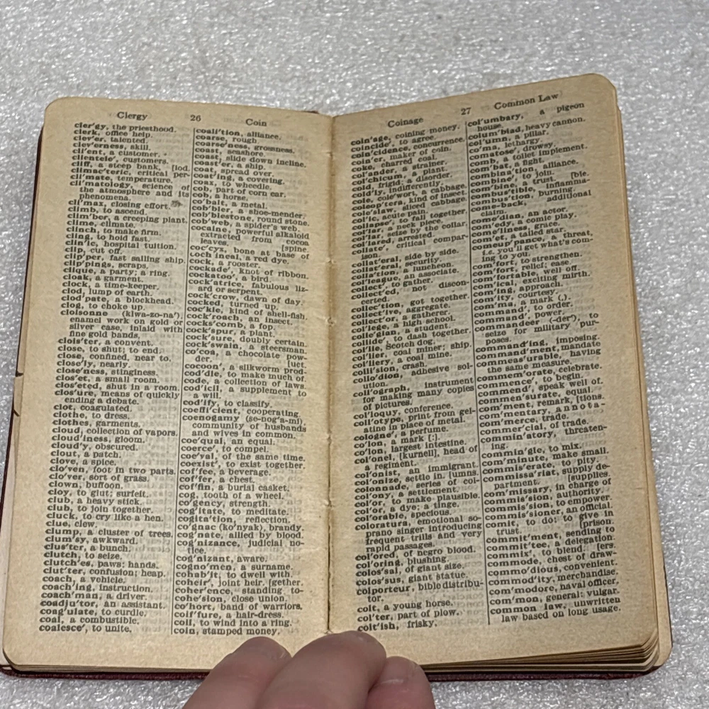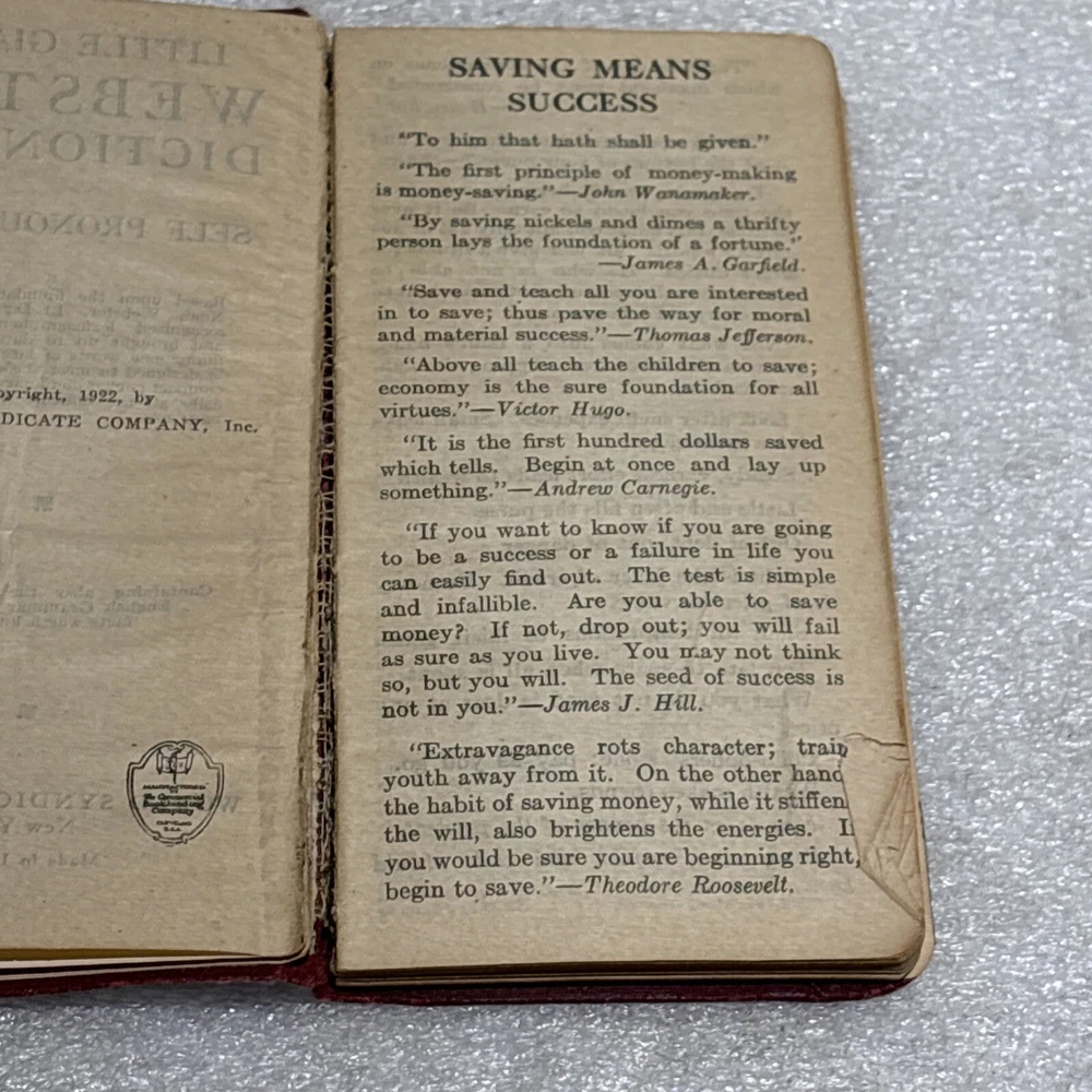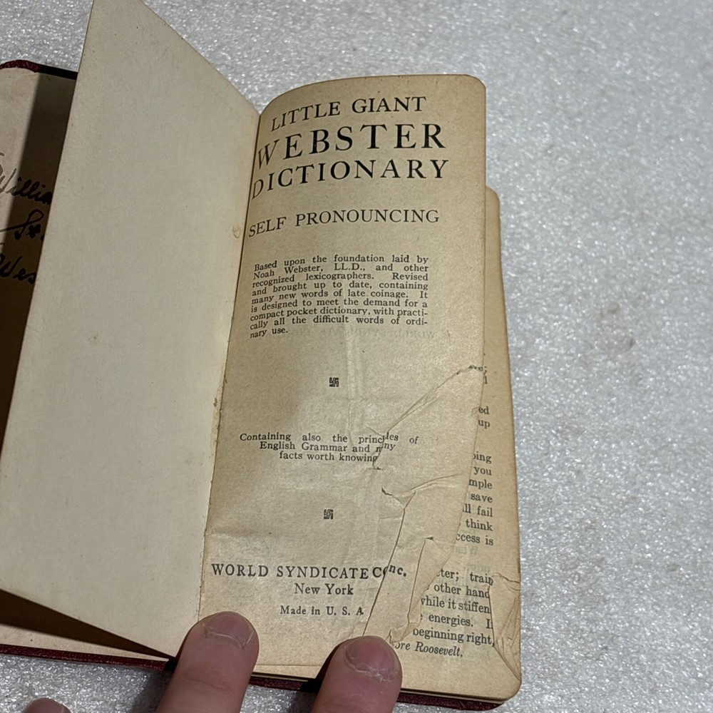 The product is a vintage Little Giant Webster Dictionary from 1922, designed as a self-pronouncing pocket-sized edition. It features a leather binding and is written in English, making it a unique and collectible piece for those interested in dictionaries and thesauri from North America. This original edition would be a valuable reference tool for language enthusiasts or individuals seeking a historical perspective on language usage from the early 20th century. Bin: A