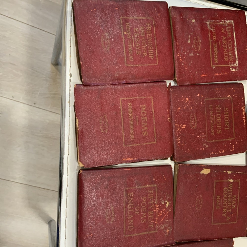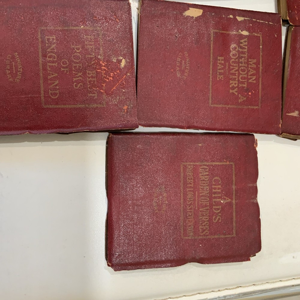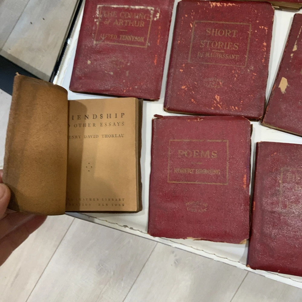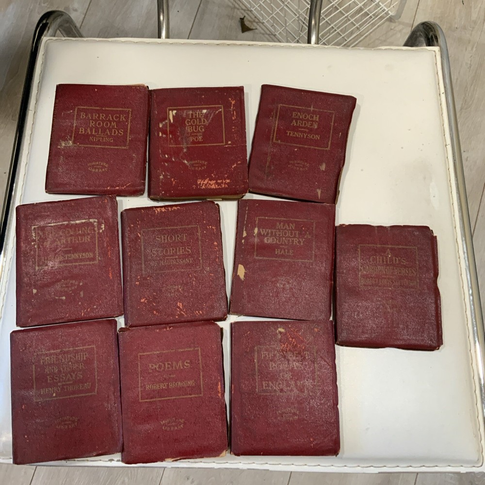 Vintage/Antique Little Leather Library lot of 14 Mini Books. All in various conditions see photos List if books is in same order as photos SHORT STORIES DE MOPASSANT MAN WITHOUT THE COUNTRY HALE FRENDSHIP AND OTHER ESSEYS HENRY THOREAU POEMS ROBERT BROWNING FUFTY BEST POEMS OF ENGLAND A CHILDS GARDEN OF VERSES ROBERT LOUIS STEVENSON The Coming of Arthur Barrack Room Ballads Enoch Arden The Gold Bug Smoke Free Home
