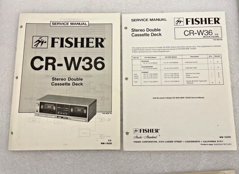 Original OEM service manual, includes, part numbers, schematics, diagrams, charts ect.. . MODEL - Vintage Original Fisher CR-W36 Stereo Double Cassette Deck Service Manual Repair Condition :This is an ORIGINAL manual, not a photocopy, reprint or digital version. They may show some wear since most of these are vintage. Some have writing and notes written on the inside and outside of the manuals, mostly useful info. Some manuals have creases and edge wear due to storage. I'm currently in the process of listing an entire electronics repair shops, collection of vintage service manuals. Please click on my eBay store as I will be listing these manuals over the next several months or years!!!!! Thanks for your time and feel free to ask questions if needed. Please see all pictures for detailed description. We use the Ebay Global Shipping program for all International sales, Ebay sets the cost of global shipping, International shipping cannot be combineIf free or flat rate shipping is offered it is to the continental U.S only. All others will be calculated by zip code.We will ship to PO BOXES, APO, FPO, DPO, Puerto Rico, US Virgin Islands but buyer must contact us first as the item will need to go USPS and will more then likely occur an extra charge. Purchase limited to size and weight the USPS allows. Free Pick up is an option but payment must be made in cash upon pick up. Once payment is made we cannot cancel the order . We ship only FED EX, UPS or USPS priority Some Items may require a signature at delivery. All used items are sold AS-IS As described. We do our very best to describe the item listed. 4-002