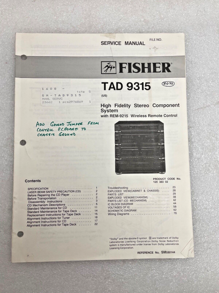Original OEM service manual, includes, part numbers, schematics, diagrams, charts ect.. . MODEL Vintage Original Fisher TAD-9315 Hi-Fi Stereo System Service Manual Repair Condition :This is an ORIGINAL manual, not a photocopy, reprint or digital version. They may show some wear since most of these are vintage. Some have writing and notes written on the inside and outside of the manuals, mostly useful info. Some manuals have creases and edge wear due to storage. I'm currently in the process of listing an entire electronics repair shops, collection of vintage service manuals. Please click on my eBay store as I will be listing these manuals over the next several months or years!!!!! Thanks for your time and feel free to ask questions if needed. Please see all pictures for detailed description. We use the Ebay Global Shipping program for all International sales, Ebay sets the cost of global shipping, International shipping cannot be combineIf free or flat rate shipping is offered it is to the continental U.S only. All others will be calculated by zip code.We will ship to PO BOXES, APO, FPO, DPO, Puerto Rico, US Virgin Islands but buyer must contact us first as the item will need to go USPS and will more then likely occur an extra charge. Purchase limited to size and weight the USPS allows. Free Pick up is an option but payment must be made in cash upon pick up. Once payment is made we cannot cancel the order . We ship only FED EX, UPS or USPS priority Some Items may require a signature at delivery. All used items are sold AS-IS As described. We do our very best to describe the item listed. 4-40