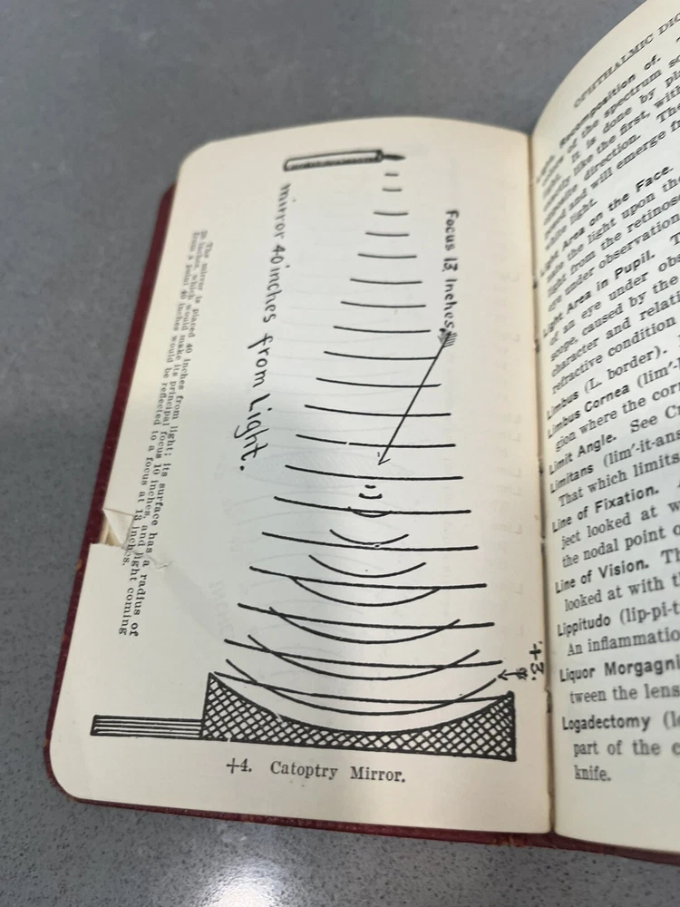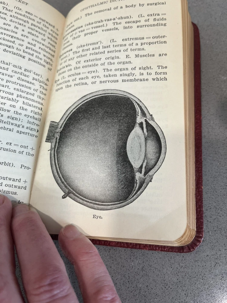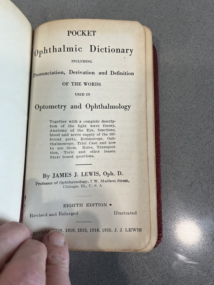 Vintage Pocket Ophthalmic Dictionary and Encyclopedia by Lewis, eighth edition, is a leather-bound book in English focusing on science and medicine. It serves as a comprehensive resource for ophthalmo...