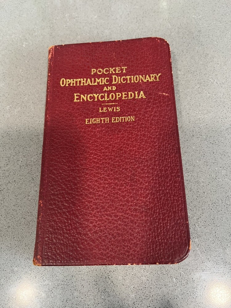 Vintage Pocket Ophthalmic Dictionary and Encyclopedia by Lewis, eighth edition, is a leather-bound book in English focusing on science and medicine. It serves as a comprehensive resource for ophthalmology terms and knowledge.