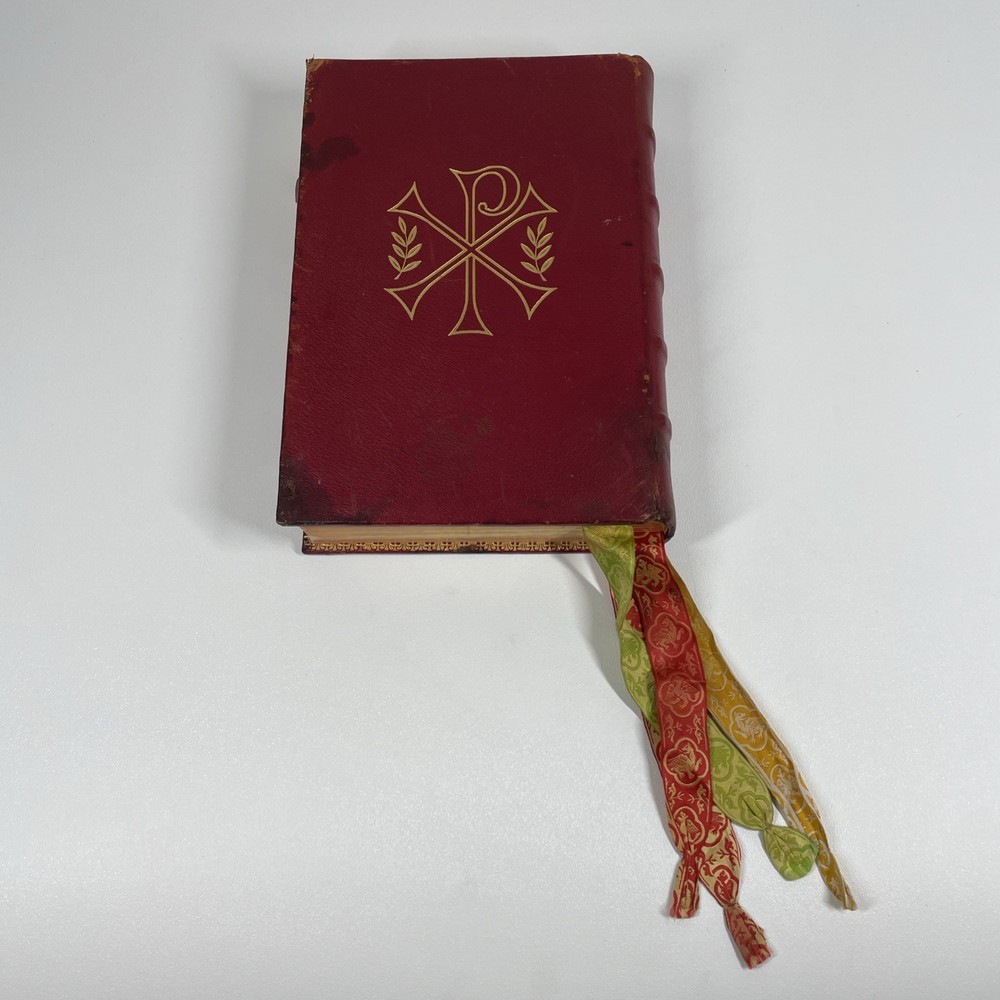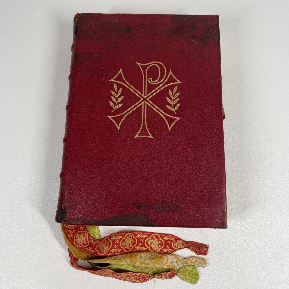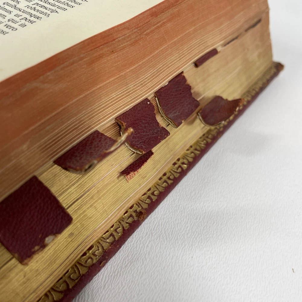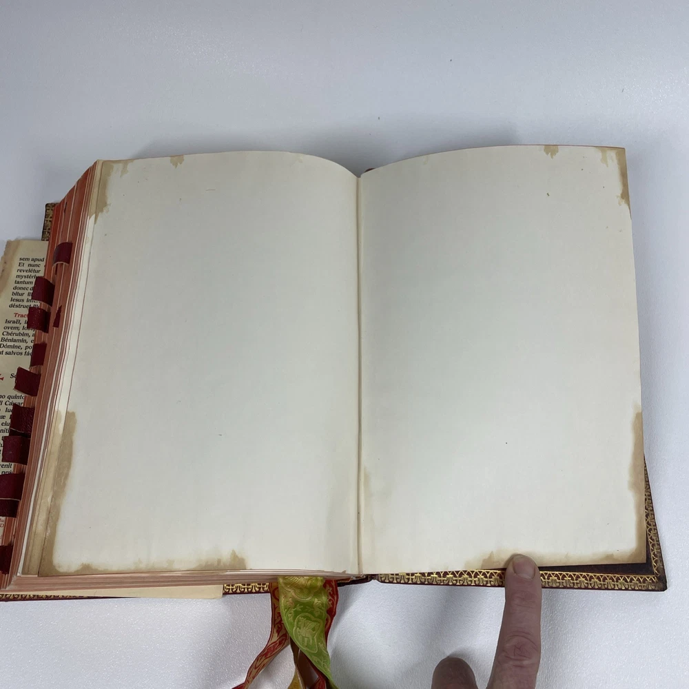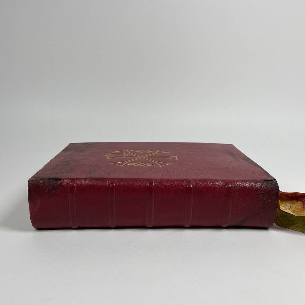 Vintage Roman Missal Red Leather LATIN Catholic Prayer Book Reference Religious Fair. Stains, small tears, rubs, scratches. Significant water marks, especially at beginning and end. A few reference tabs are broken off. Spine is intact.