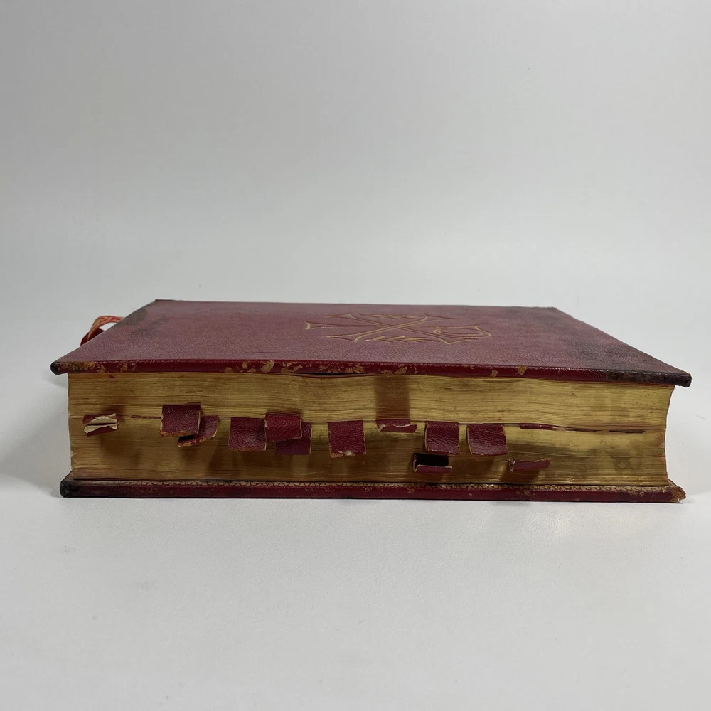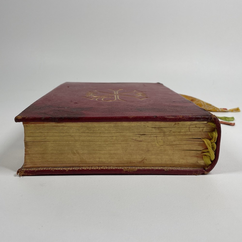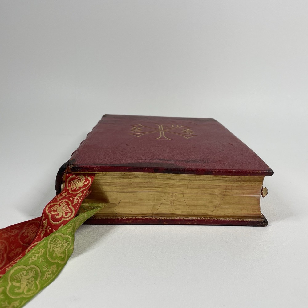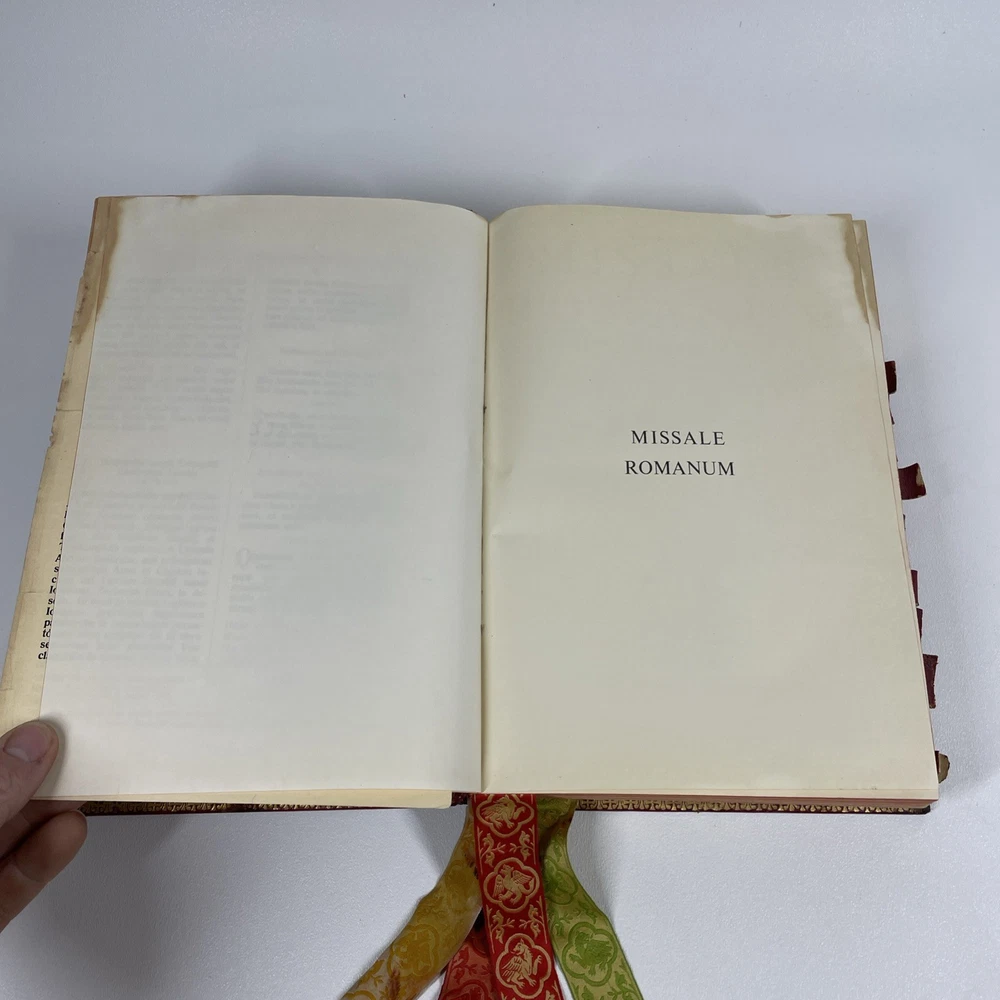 Vintage Roman Missal Red Leather LATIN Catholic Prayer Book Reference Religious Fair. Stains, small tears, rubs, scratches. Significant water marks, especially at beginning and end. A few reference tabs are broken off. Spine is intact.