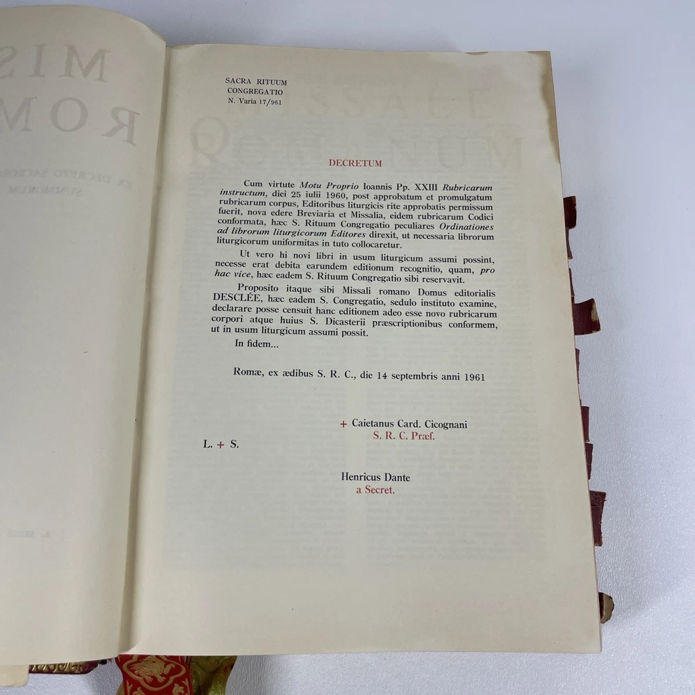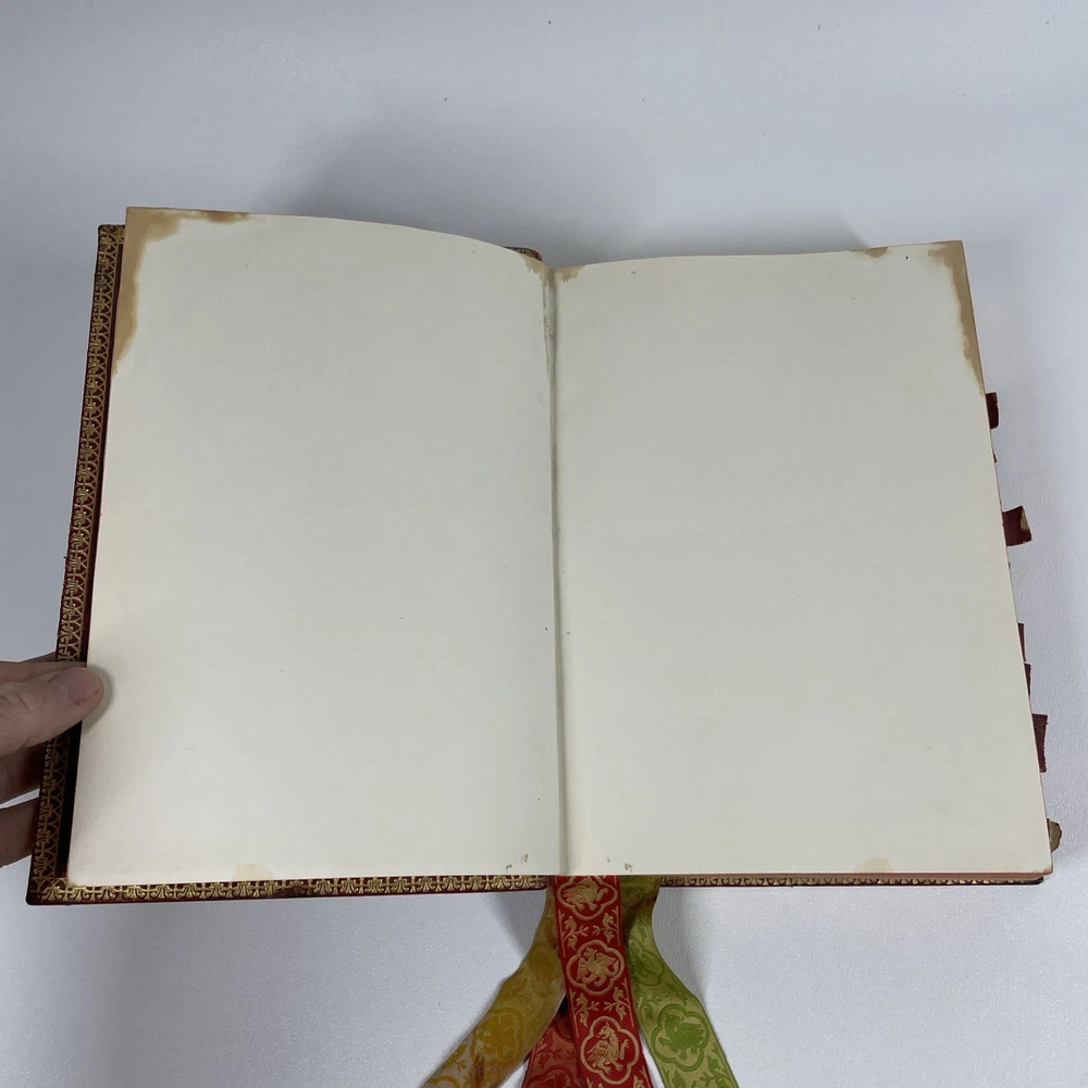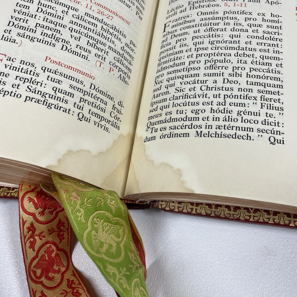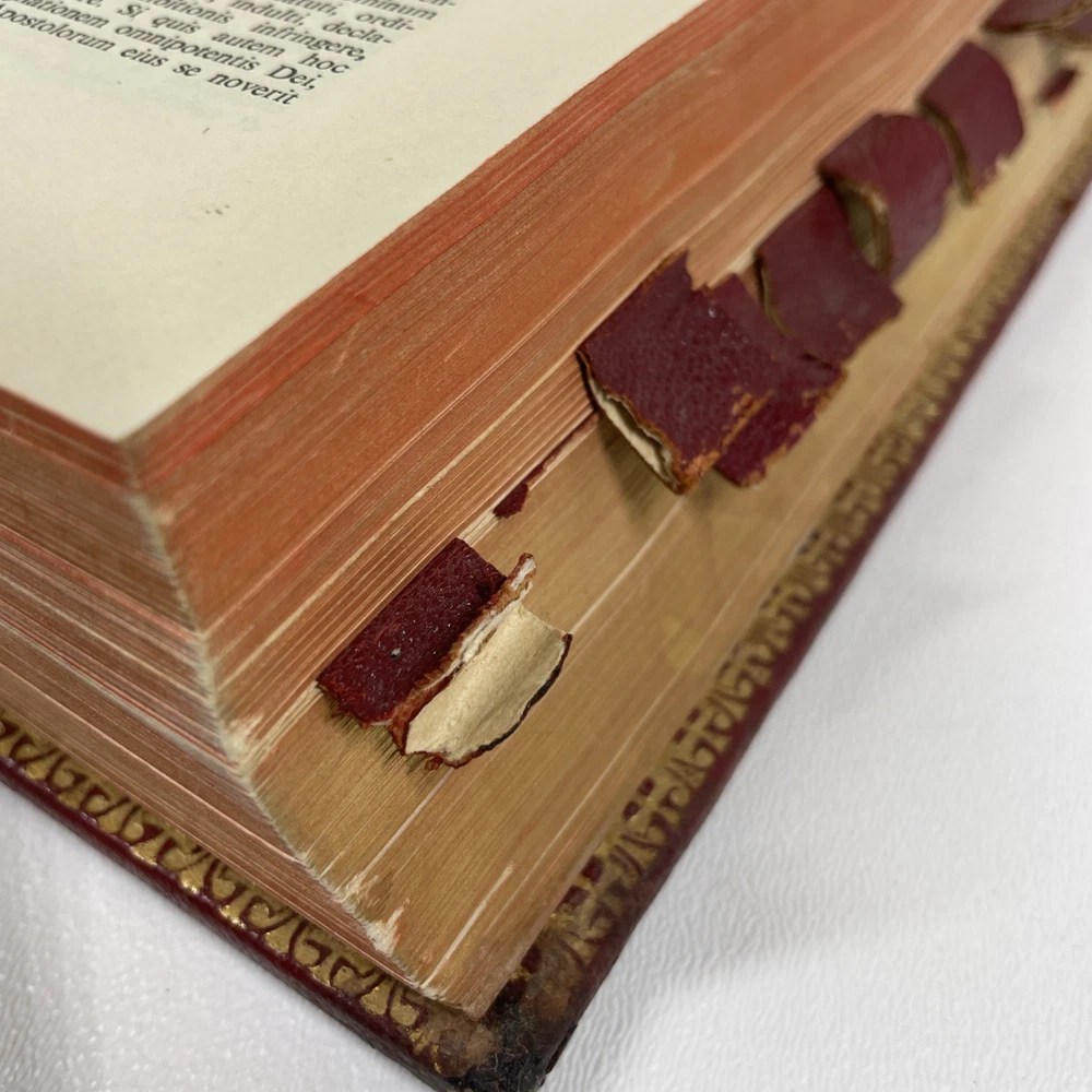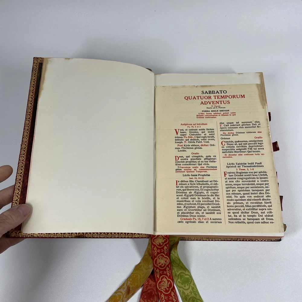 Vintage Roman Missal Red Leather LATIN Catholic Prayer Book Reference Religious Fair. Stains, small tears, rubs, scratches. Significant water marks, especially at beginning and end. A few reference tabs are broken off. Spine is intact.