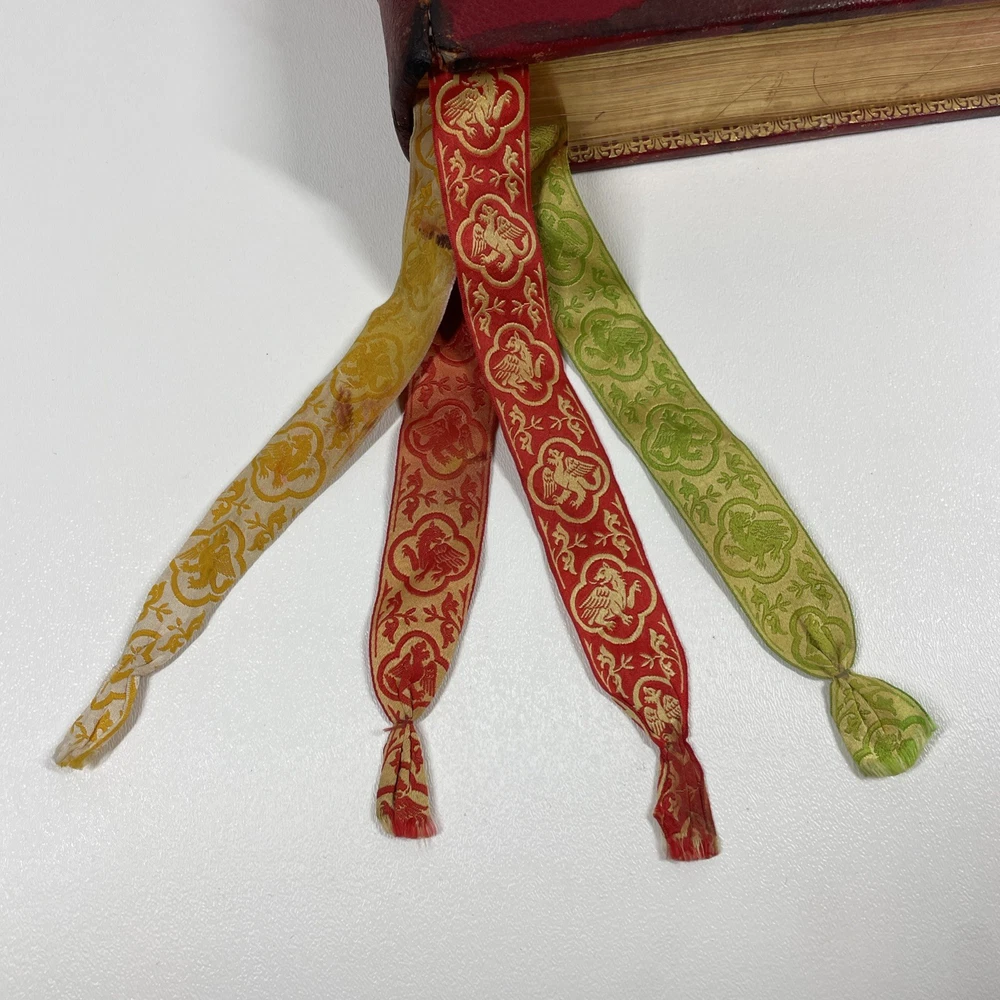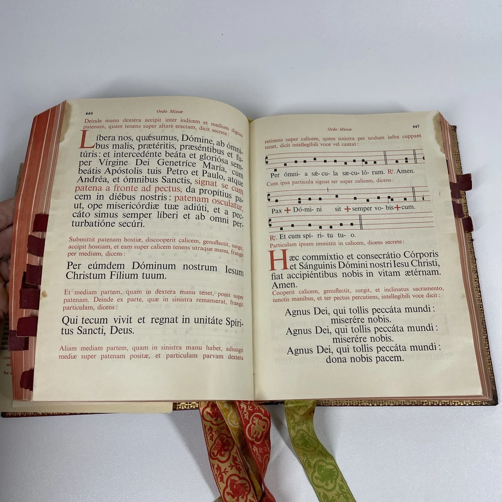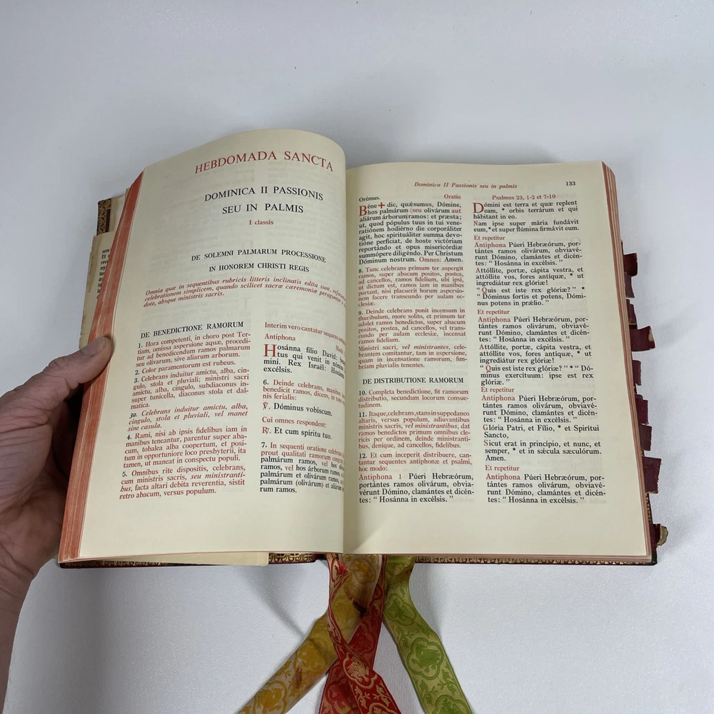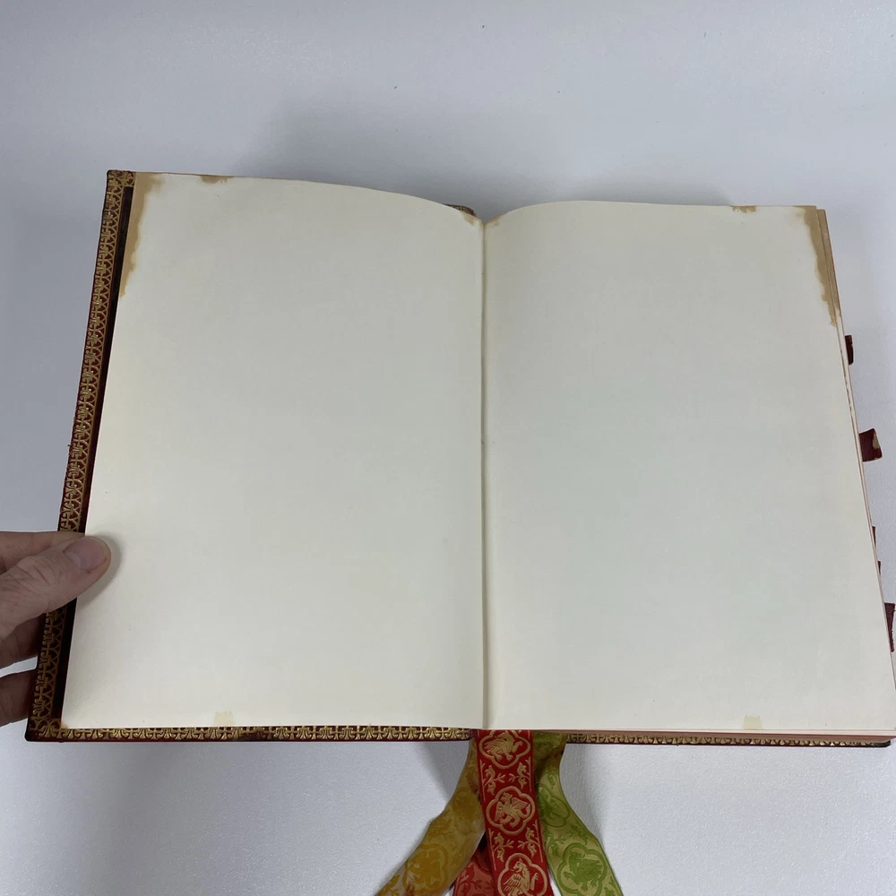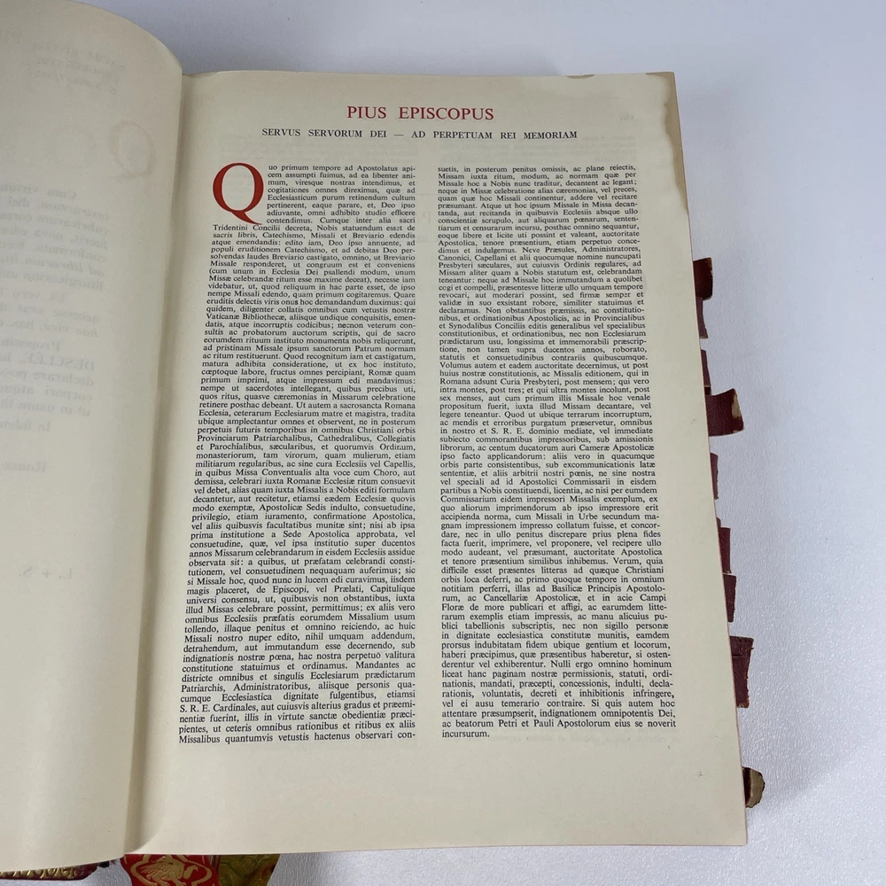 Vintage Roman Missal Red Leather LATIN Catholic Prayer Book Reference Religious Fair. Stains, small tears, rubs, scratches. Significant water marks, especially at beginning and end. A few reference tabs are broken off. Spine is intact.