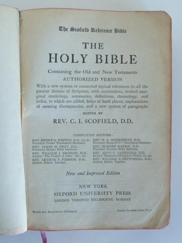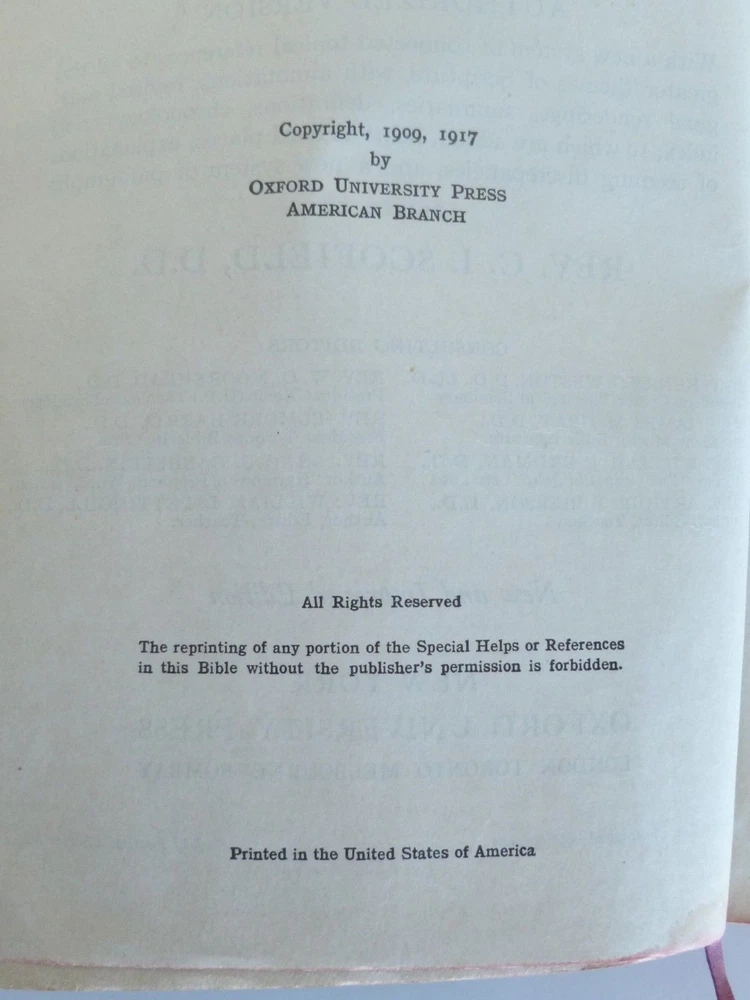 Vintage Scofield Reference Bible 1917 Oxford Black Leather Softcover Acceptable condition. Measures approximately 8 1/4" Long, 6" Wide & 1 1/2" Deep. Acceptable condition. Spine binding is strong. Pages have no writing, highlights or underlining. At least one page has marking on it. Cover has wear and tear and some markings. Some creased pages. Some small dog-eared pages. One page has been torn and tape repaired (as seen in last two pictures). Book marker is loose and has fraying on both ends. Please see pictures for more details. Please See Pictures For More Details. Pictures are of actual item(s). Please let me know if you have any questions. Shipping: We will only ship to eBay/PayPal verified addresses. We ship in the USA. Outside the USA we only ship through eBay’s Global Shipping Program. We do not combine shipping with certain items. Thank you, whitechocolate2014