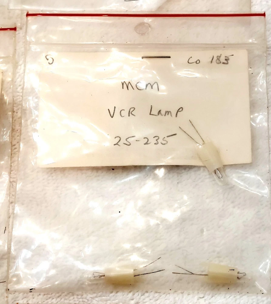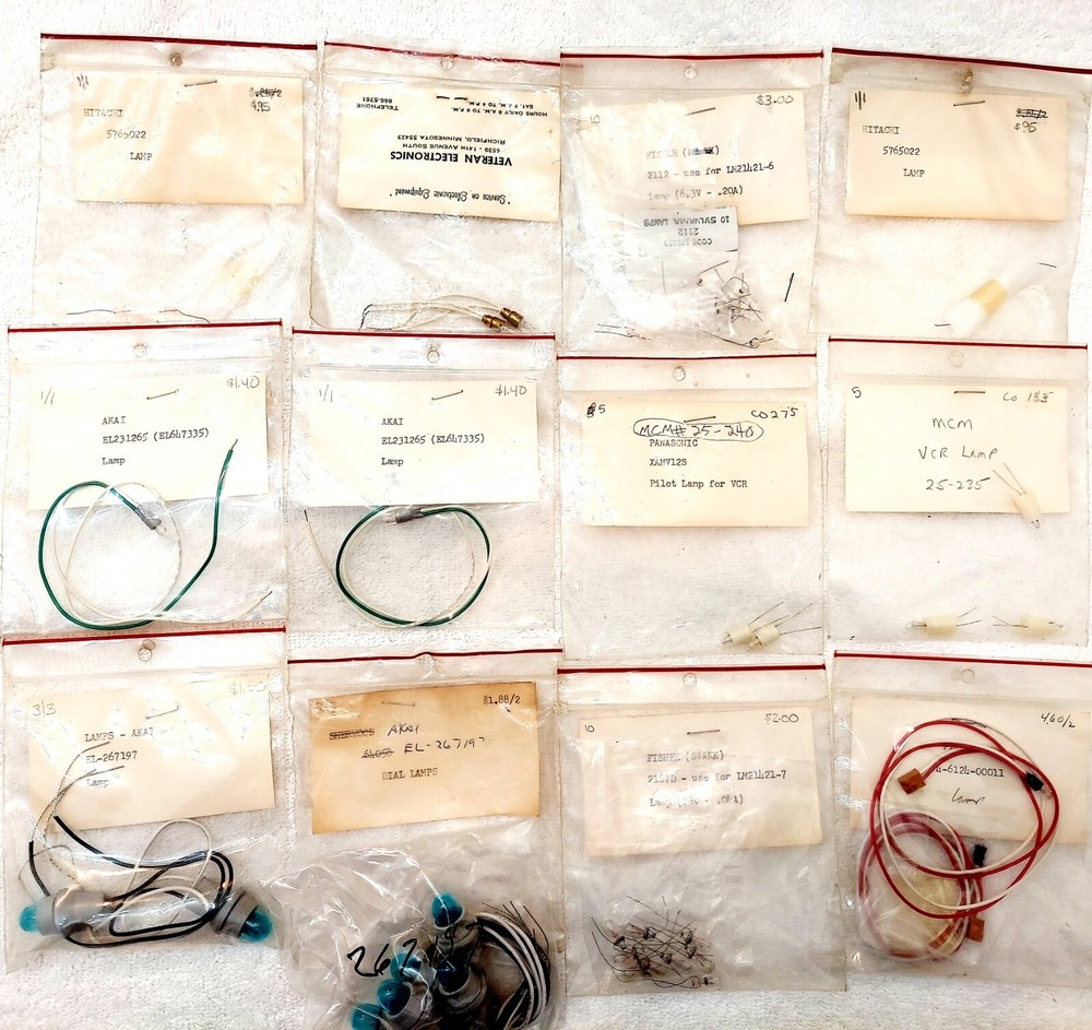 12 packages of vintage new old stock stereo reciever, tape deck and vcr replacement lamps. Replacements for brands like Fisher, Akai, Hitachi, Panasonic and MCM VCR's. Please refer to the photos as they provide the most detailed description. I'm always willing to answer any questions you may have. Thank you.