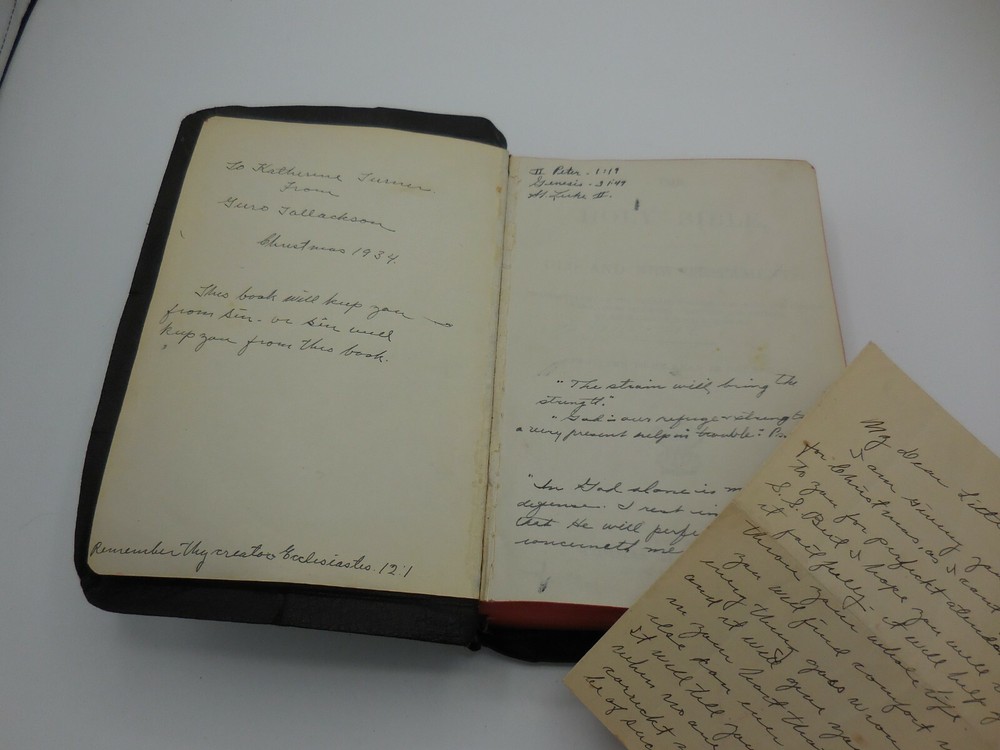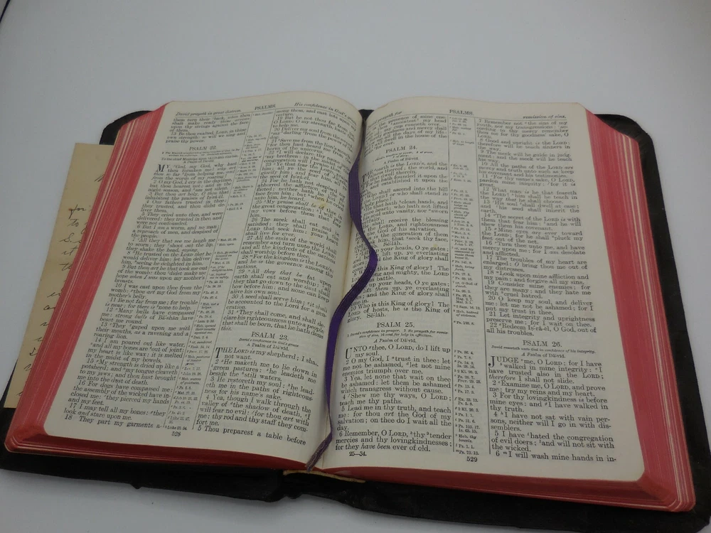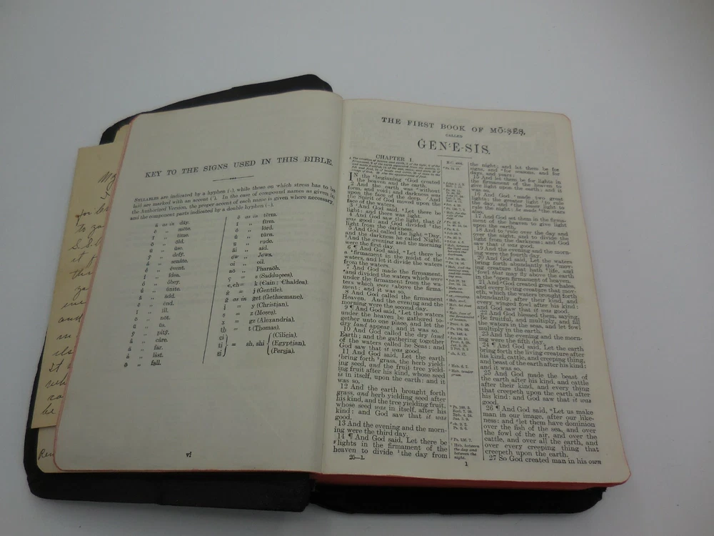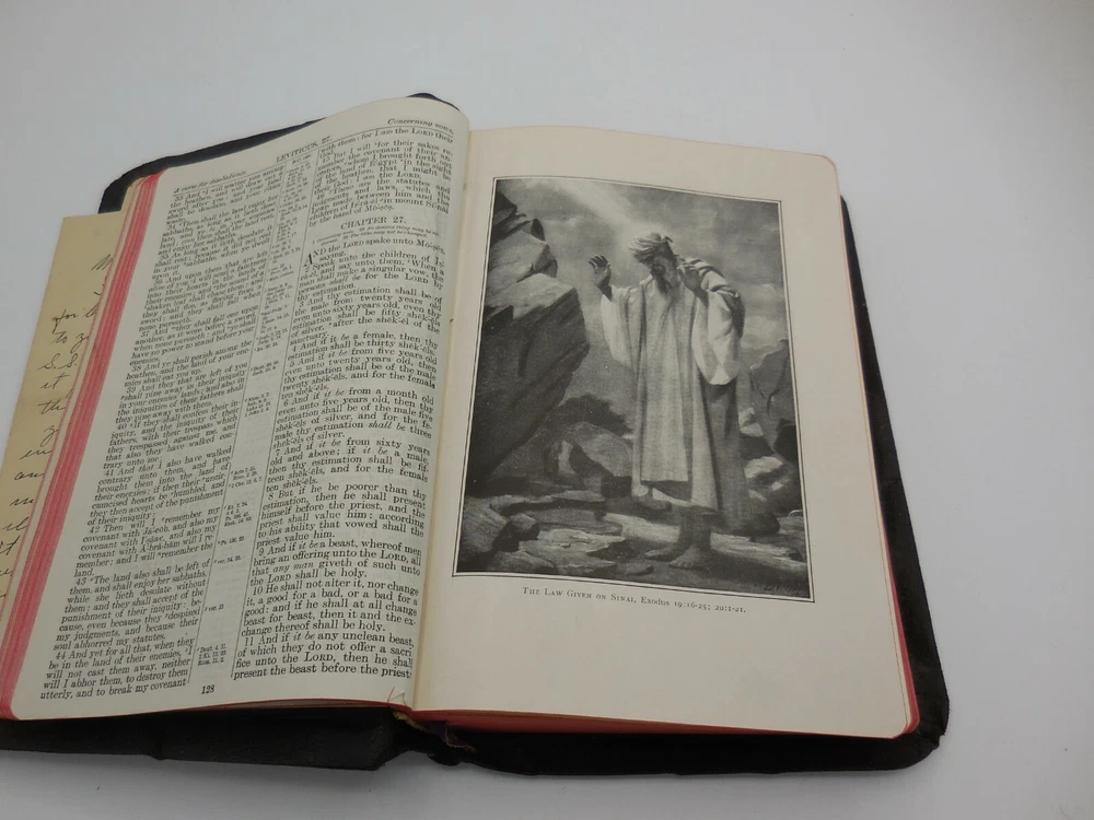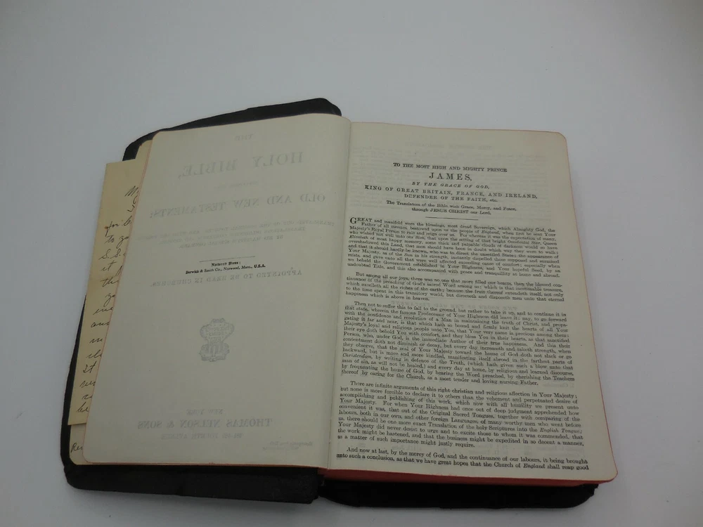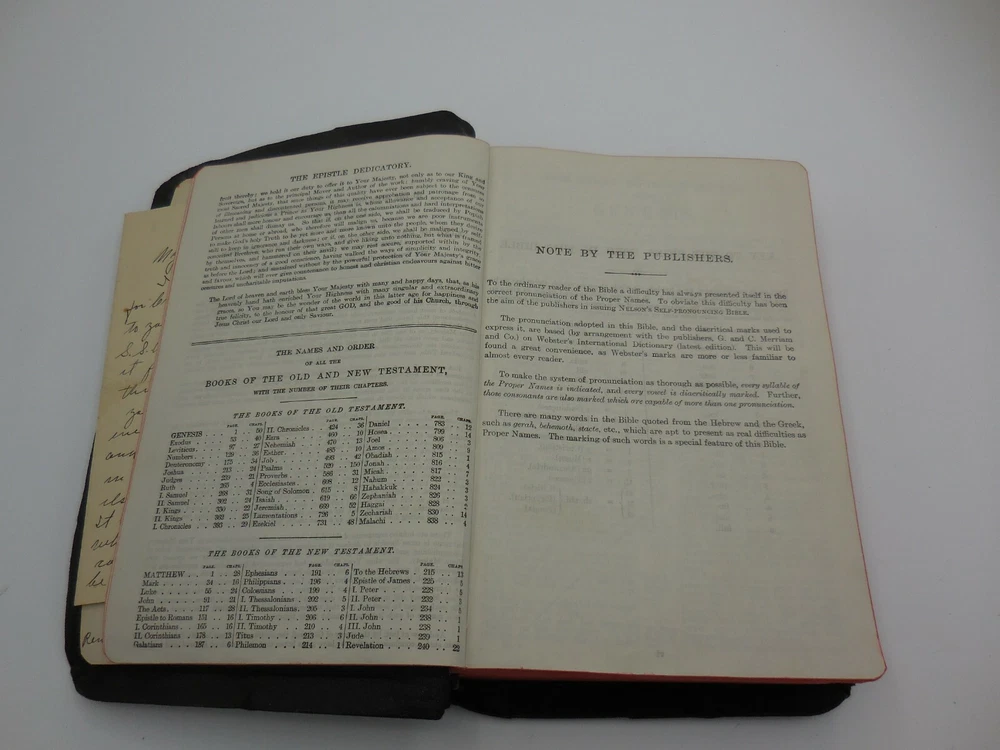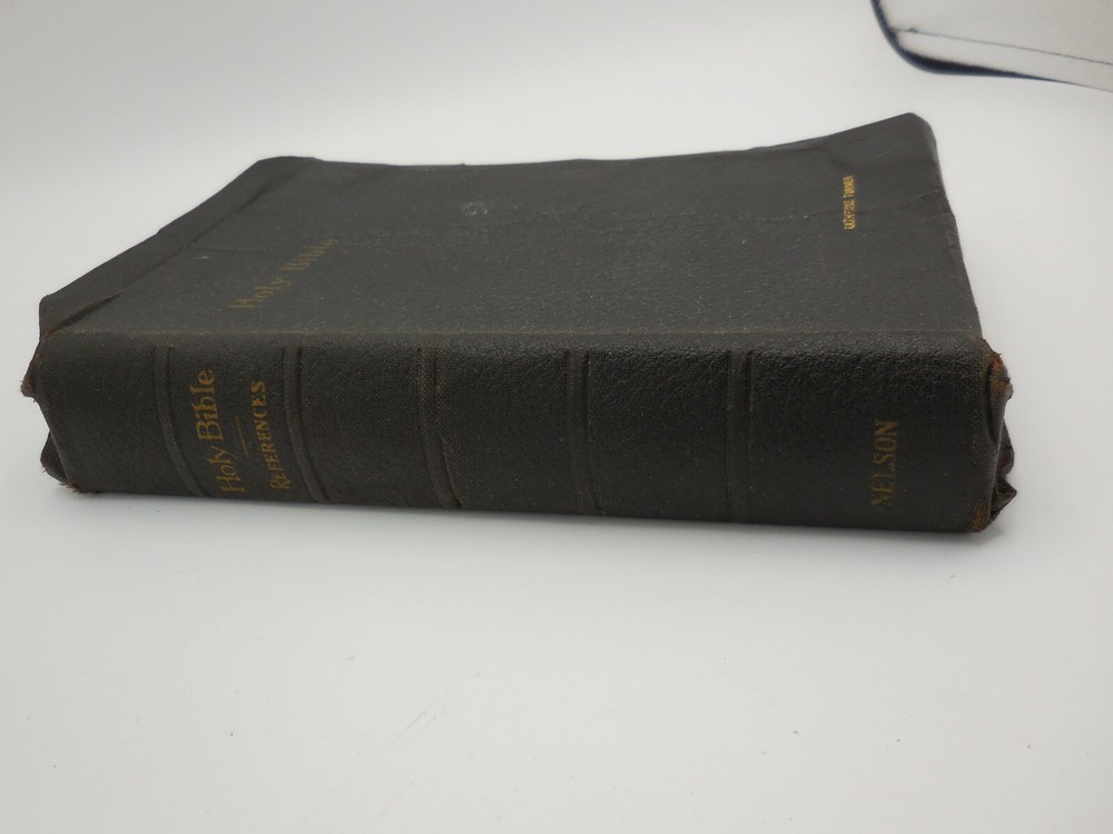 Vintage The Holy Bible References containing the Old and New Testaments: Translated out of the original tongues: and with the former translations diligently compared and revised, by his majesty's special command. Appointed to be read in churcheschruches. Nelson's series Thomas Nelson & Sons King James Pronunciation and diacritical marks Red edge pages, purple ribbon book mark, illustrated black and white and color, color maps This has an inscription dated Christmas 1934 and includes a personal note that came with the gift.