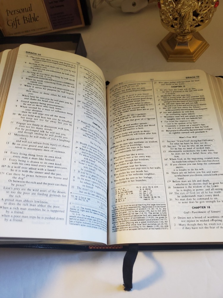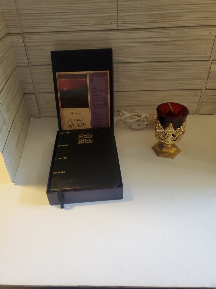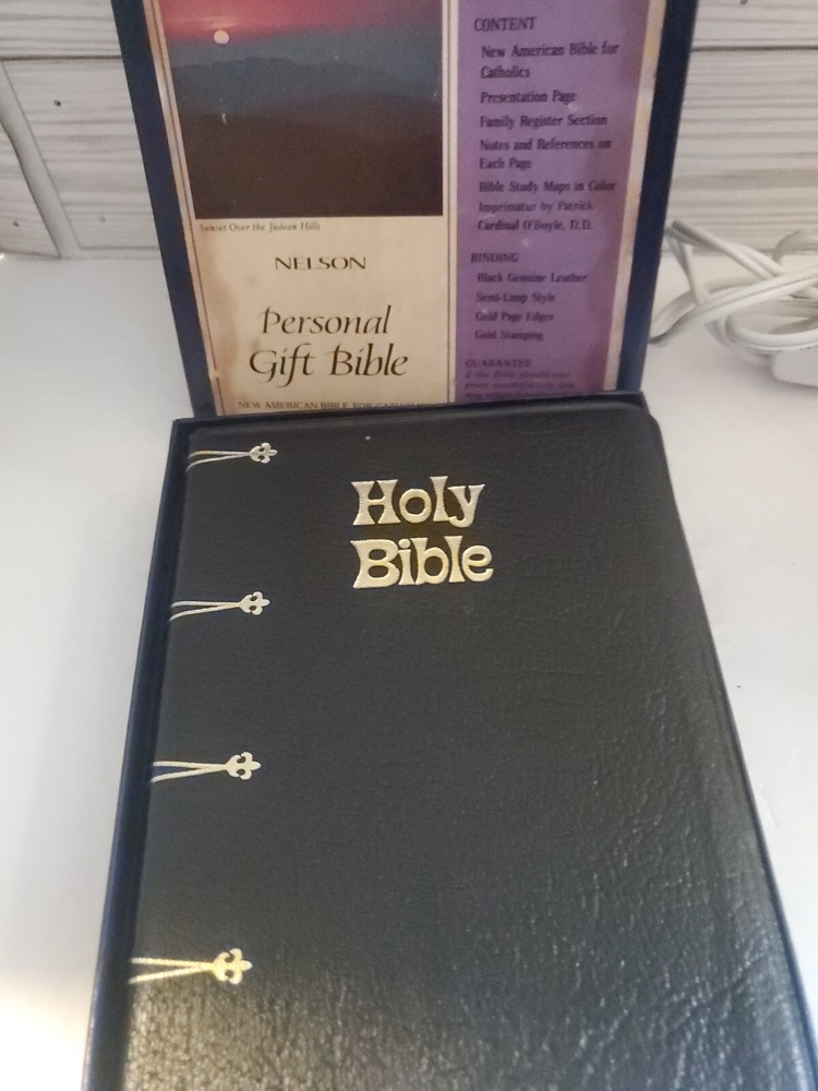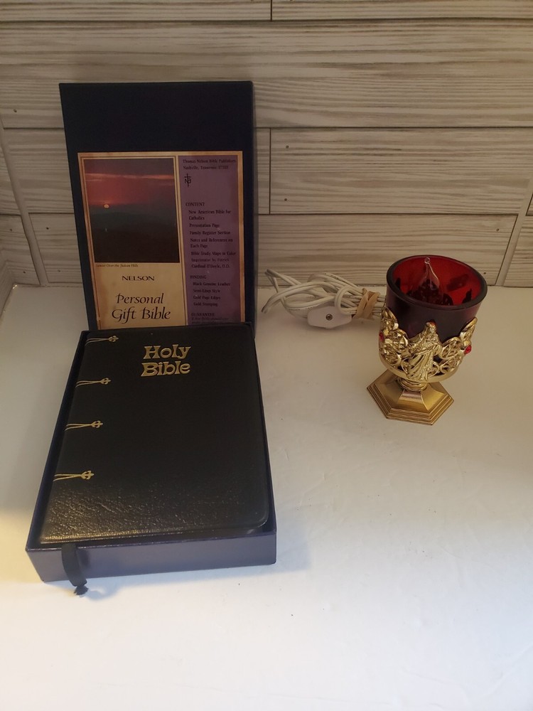 This vintage Thomas Nelson New American Bible is a beautiful addition to any collection. The black leather cover and gilded pages make it a special item for young adults and adults alike. With 1366 pages, this first edition activity book is a reference guide for those interested in Christianity and Jesus Christ. The book is in excellent shape and has been well-preserved, making it a great find for collectors. It is not personalized or inscribed, but it does come with a prayer lamp. The narrative type is nonfiction and the intended audience is both young adults and adults. This Holy Bible is a must-have for anyone interested in religious and spiritual topics.