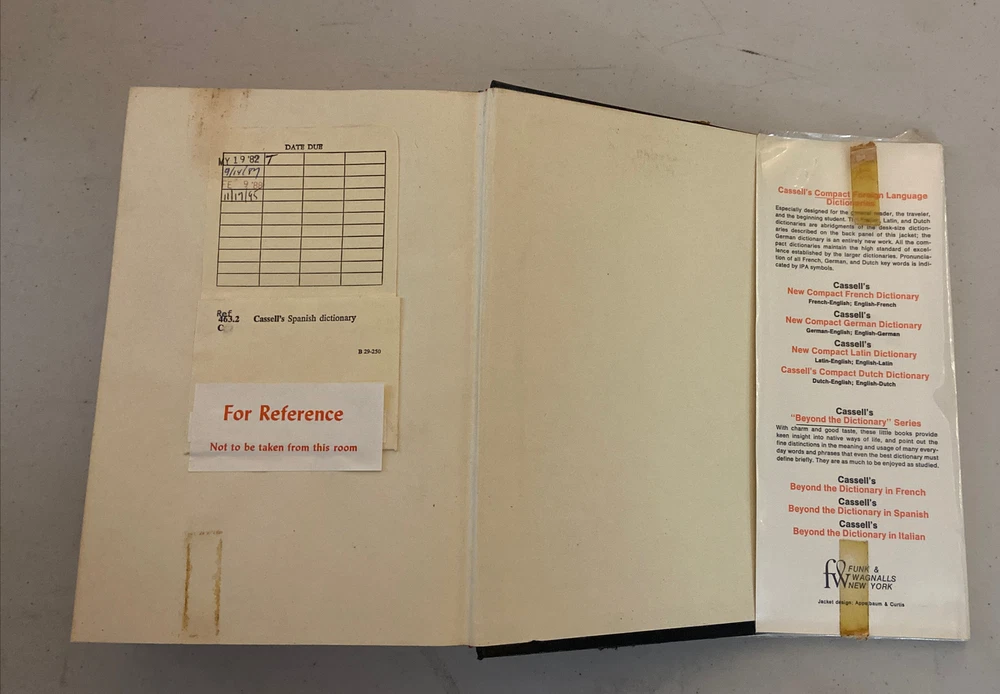 Vintage 1968 CASSELL’S SPANISH-ENGLISH DICTIONARY Funk & Wagnalls ExLibris This is a former school library book. This was a reference book that was hardly ever used! ***Make me an offer*** Marking all books as acceptable, they are usually in better shape. Pages may or can have notes, writing, marks or highlighting. Spine does not show signs of wear. Still has original dust jacket and cellophane library wrapping. This is stamped as discarded. This need a good home! Smoke free home! Will be mailed in a bubble mailer. Please no low ball offers. I feel starting offer is fair. If you want this make a real offer. You never know I may accept. PLEASE REVIEW ALL PICTURES CAREFULLY! Being sold “AS IS” NO RETURNS ALL SALES FINAL