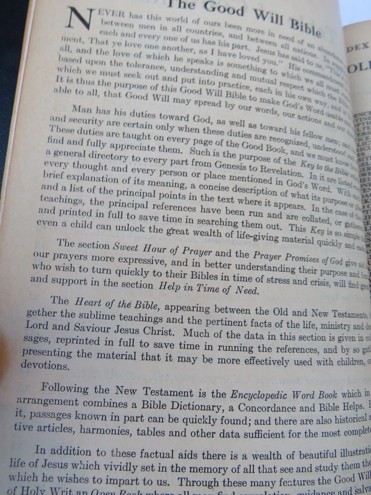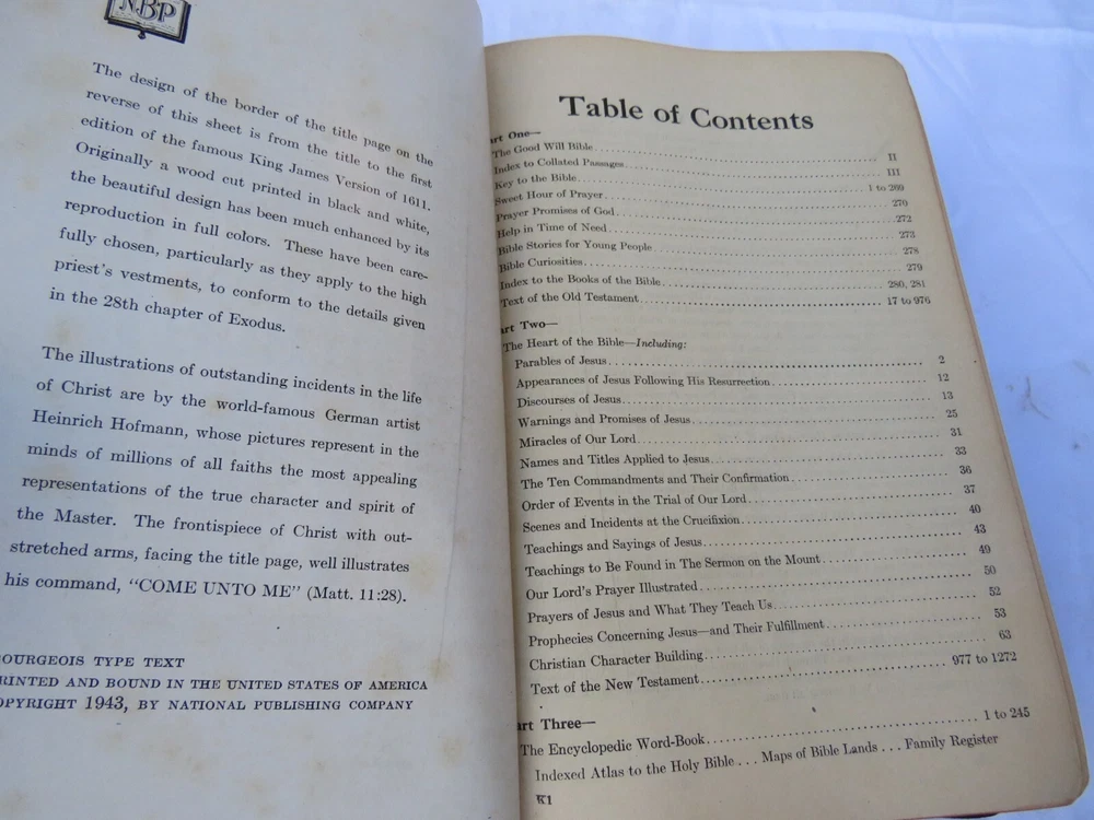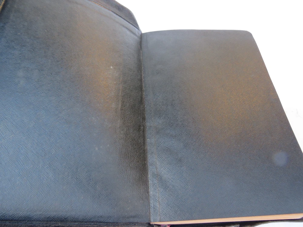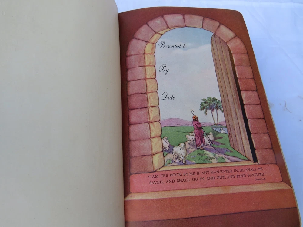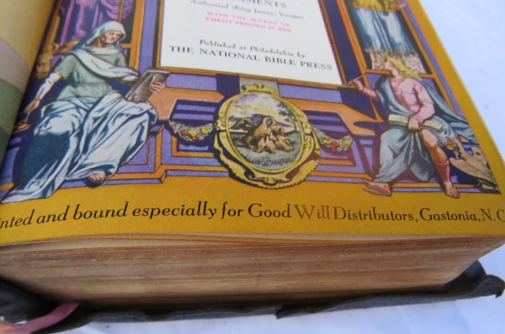 This exquisite Bible edition features a leather binding and gilded edges, perfect for collectors or those looking for a special addition to their library. The index along the edge and illustrations add to its charm and functionality. Published in 1943 by National, this Bible includes the full text of the Holy Bible, and is a great reference for those interested in Christianity and religious studies. The book is written in English and features various authors, covering a range of topics and subjects. This original edition is a must-have for any book collector or enthusiast. You will be receiving the item shown in the pictures. We can combine shipping.