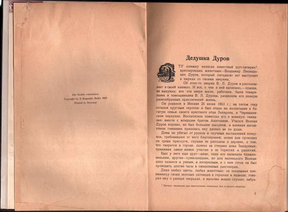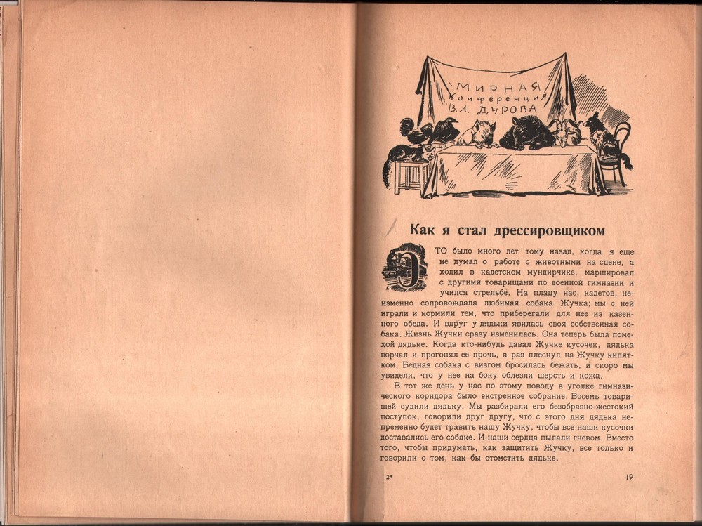 Vladimir Durov Autobiography Circus Animal Theater 1929 Мои Звери (My Animals) – In the Russian language. By Vladimir Durov, *** Berlin, Z. Kaganski, 1929. *** An antique book about the animals of Durov Theater , written by its founder, Vladimir Durov, a well-known animal trainer and zoologist. He developed his system of training that did not involve any punishment of the animals. His theatre also included a natural history museum and a science laboratory. This autobiography comes with numerous illustrations and a preface by Alexander Almaev. The book is illustrated by V.A. Milesevski. *** Pp .: 266 Size : 27 x 19 cm *** Binding: Fine leather binding over original wrappers. A gilt-stamped spine cover. Original wrapper stained. Condition: Some minor stains, occasional signs of paper restoration, in very good condition. *** For the item’s condition and details, see the scans. For any additional questions, feel free to contact us. We are eager to answer all of your questions! *** Shipping Shipping method: All items are shipped via Express Mail Service (EMS) or private couriers such as DHL and UPS. You will receive a tracking number with whom you can trace the item's location at any given time. All items will be packed safely and properly to avoid any damage during their voyage. Combined Shipping: We offer free shipping for books. For other items, it is possible to combine purchases. You just need to make a request for a separate invoice. Please note: If you have ordered more than one item from a different category, please wait for the combined shipping invoice . Shipping time: We send all the items within 24h of payment being received on a working day. In case we are on holiday the item will be shipped the first next working day. The estimated delivery time is 3-7 working days. Customs office: You may be charged by the customs office in your country. There are no hidden expenses like sales or export taxes unless specified in the item’s description. Please familiarize yourself with the import laws of your country before purchasing in case you are not entirely sure if an item is subject to customs taxes. For some items, an export license is needed and additional fees and time to get the export permit will be clearly stated in the item description. Some items may end up at customs inspections in Serbia so we will kindly ask you to be patient while such inspections take place because they can cause a delay in the delivery time. Payment Payments will be processed via: Paypal eBay Managed Payments Credit and debit cards will be processed via the mentioned processors as well. We kindly ask our buyers to pay within three working days of the order. After that, the buyers will be sent a reminder. If the payment is not received even after that, a case will be opened. Returns and refunds In case you would like to return/exchange the item for any reason you are free to do so. We ask all our buyers to contact us prior to sending an item back. The moment the item arrives back the buyer will be entitled to a refund. Exchange for another item from the store is also an option. It is possible to return an item within 30 days from the date of arrival. Feel free to contact us if you have any additional questions, we will be happy to answer them!