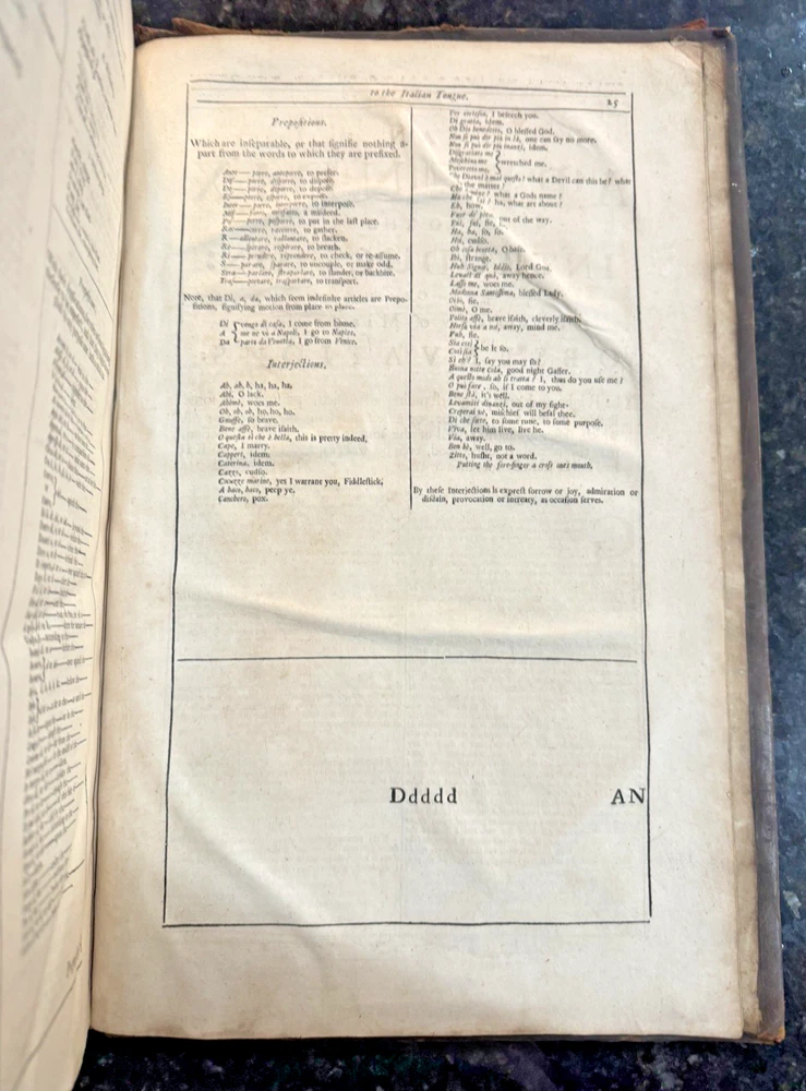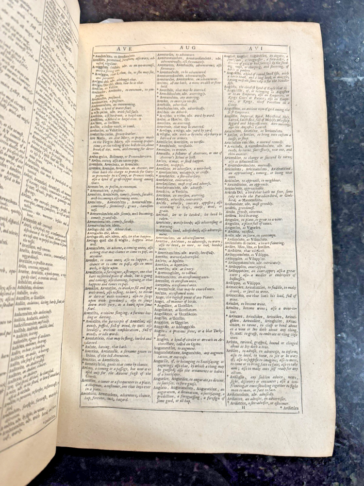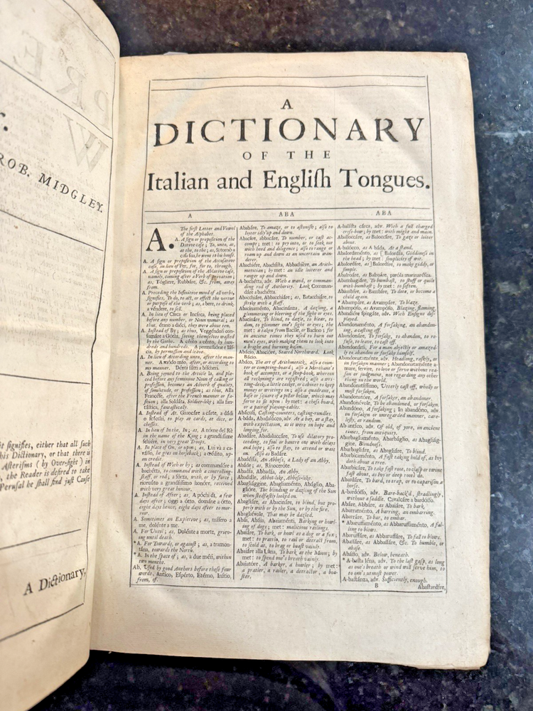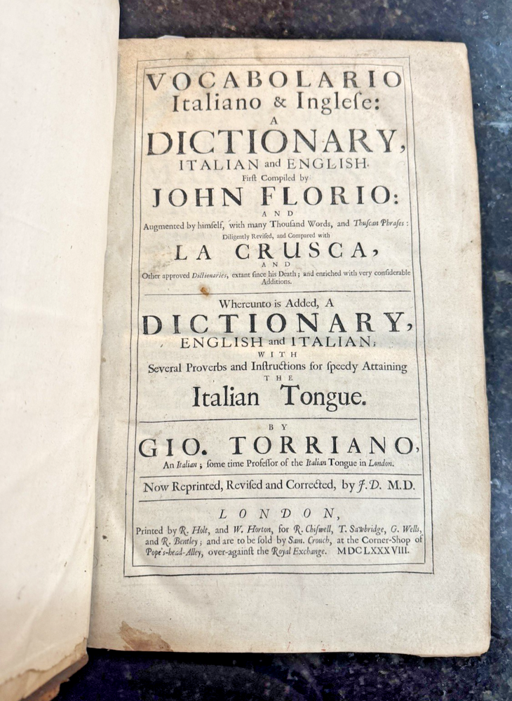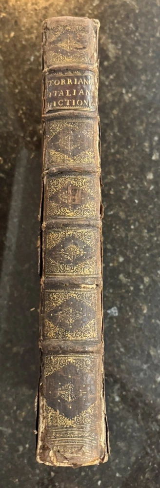 Vocabolario Italiano & Inglese: A Dictionary, Italian and English. First compiled by. Whereunto is Added, A Dictionary, English and Italian; with Several Proverbs and Instructions for speedy Attaining the Italian Tongue. By Gio. Torriano. Now reprinted, Revised and Corrected, by J.D. [John Davis] FLORIO, John Published by London: Printed by R. Holt, and W. Horton, for R. Chiswell, T. Sawbridge, G. Wells, and R. Bentley, 1688 Cracking along spine and both boards, still attached. Some damage to boards. One fly page at front and back of text. Library stamp in front cover from the Croxteth Library. A few stains on title through preface, remaining pages are very clean. Title piece and gilt decor on spine.