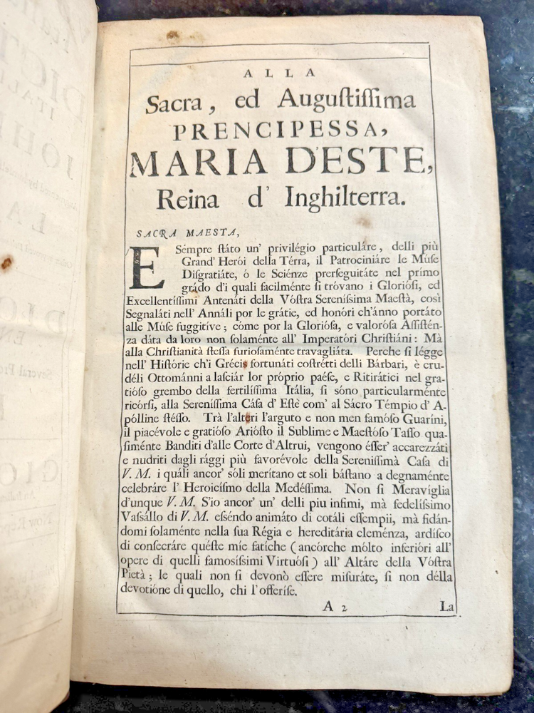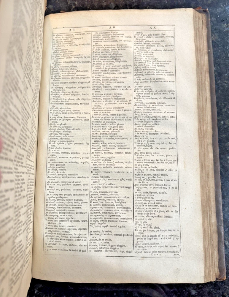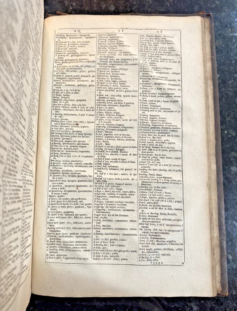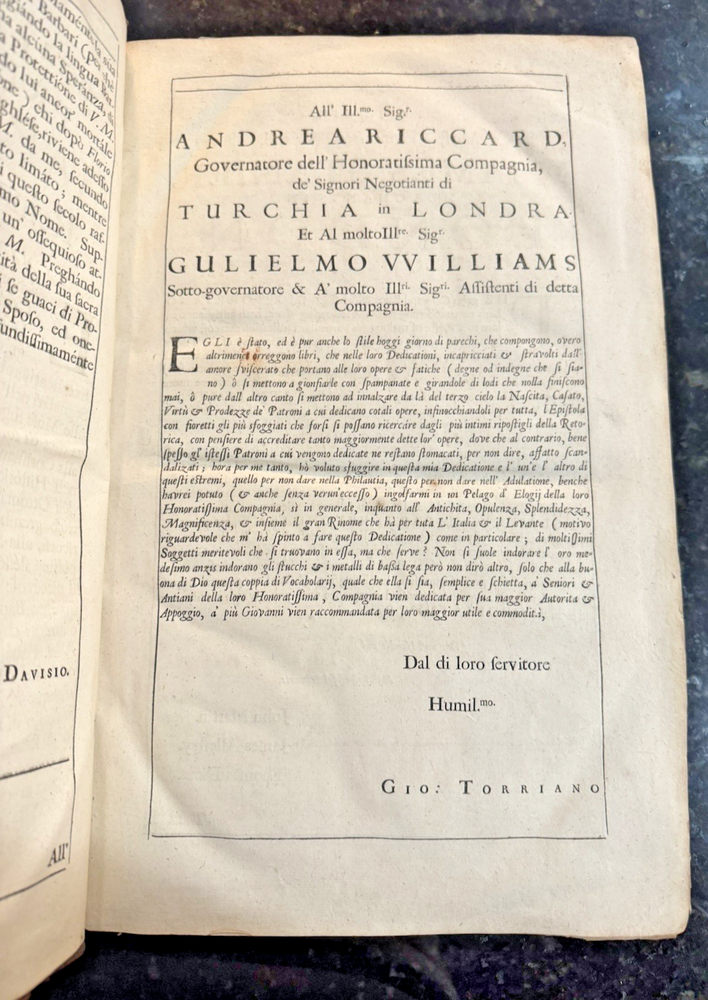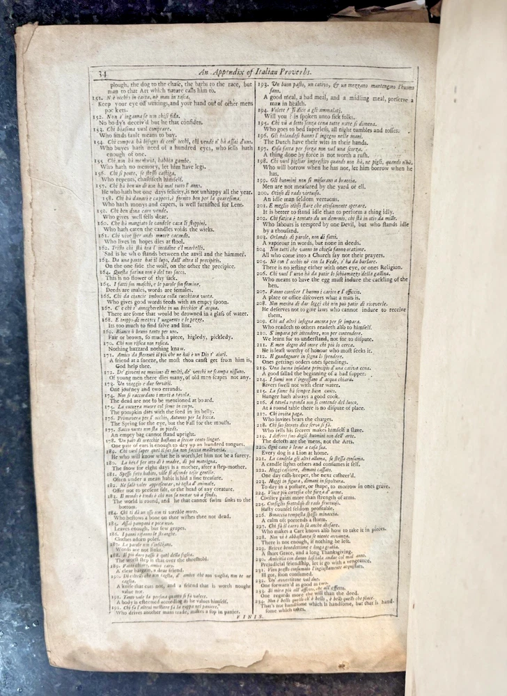 Vocabolario Italiano & Inglese: A Dictionary, Italian and English. First compiled by. Whereunto is Added, A Dictionary, English and Italian; with Several Proverbs and Instructions for speedy Attaining the Italian Tongue. By Gio. Torriano. Now reprinted, Revised and Corrected, by J.D. [John Davis] FLORIO, John Published by London: Printed by R. Holt, and W. Horton, for R. Chiswell, T. Sawbridge, G. Wells, and R. Bentley, 1688 Cracking along spine and both boards, still attached. Some damage to boards. One fly page at front and back of text. Library stamp in front cover from the Croxteth Library. A few stains on title through preface, remaining pages are very clean. Title piece and gilt decor on spine.