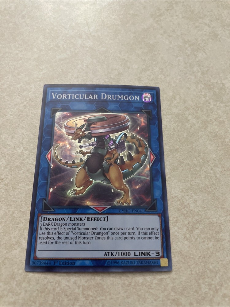 Elevate your Yu-Gi-Oh! TCG collection with the formidable Vorticular Drumgon from the Cybernetic Horizon set. As a 1st Edition Super Rare card, this dragon-themed Effect, Link card is a must-have for both players and collectors. Its dark attribute enhances its unique abilities, making it a powerful addition to any deck. Card number CYHO-EN041 features a striking design by Konami and boasts an impressive attack power of 1000. The English language card is sure to be a standout in any collection, promising to bring a touch of darkness to your game. Whether for play or display, Vorticular Drumgon is a true gem for enthusiasts of the Yu-Gi-Oh! universe.