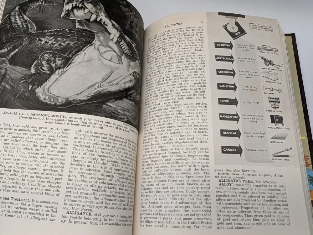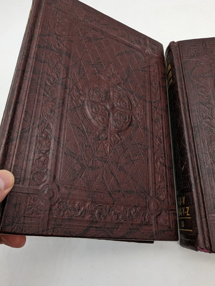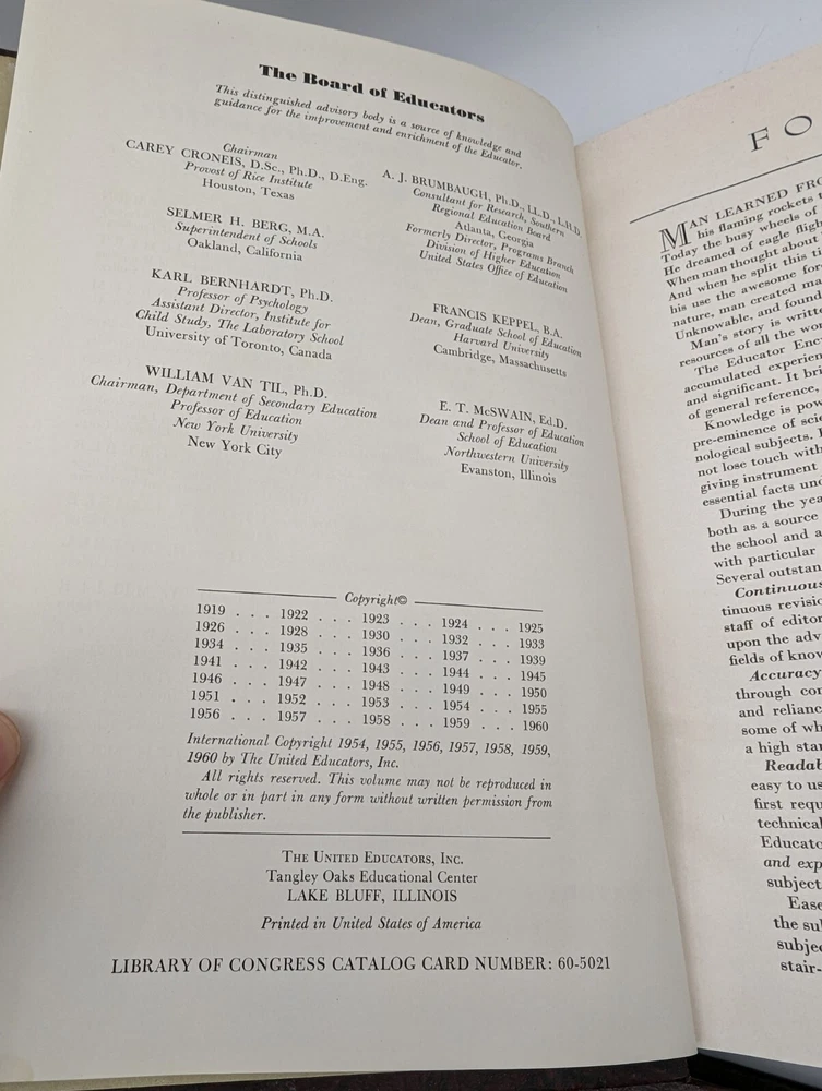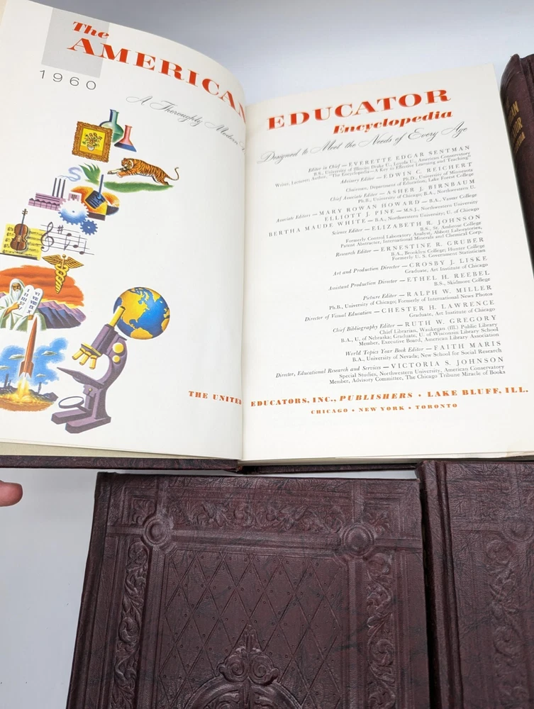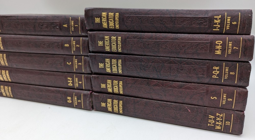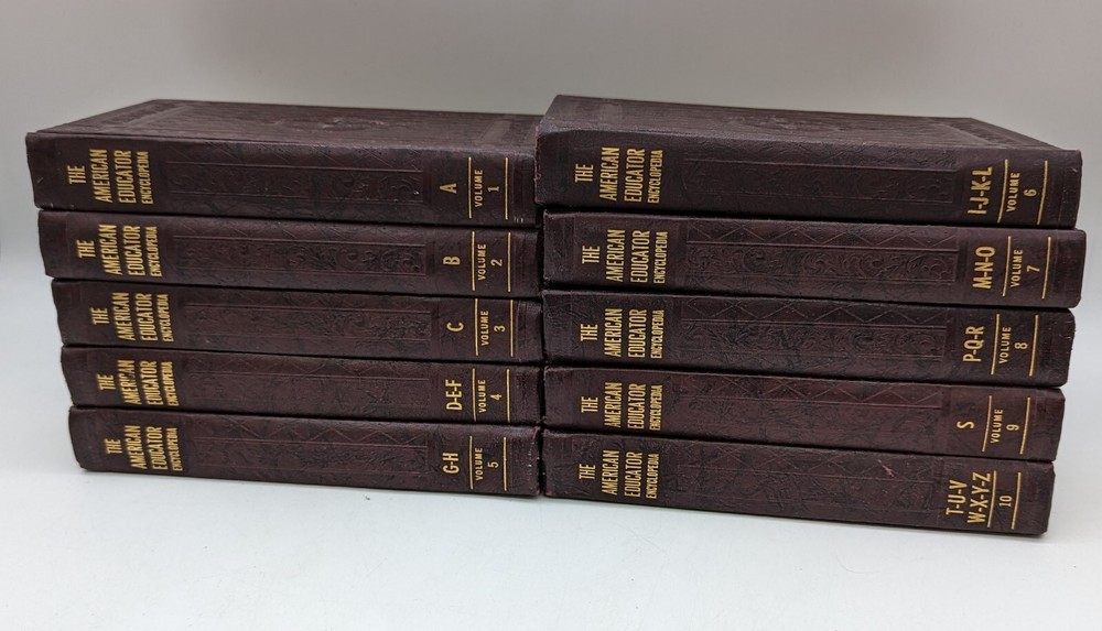 Up for sale is a complete set of 10 American Educator Encyclopedias from 1960. They are in a rich tooled leather - they look beautiful on a shelf. Books are in good condition with some wear and discoloration. See photos.