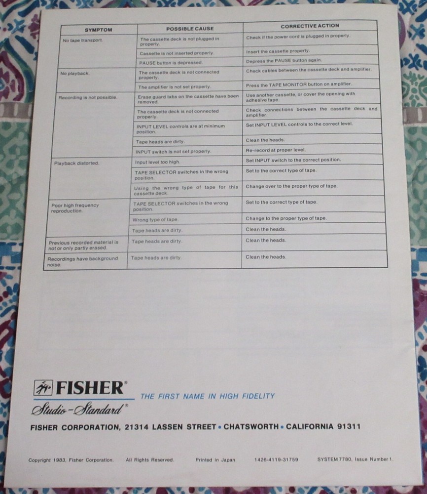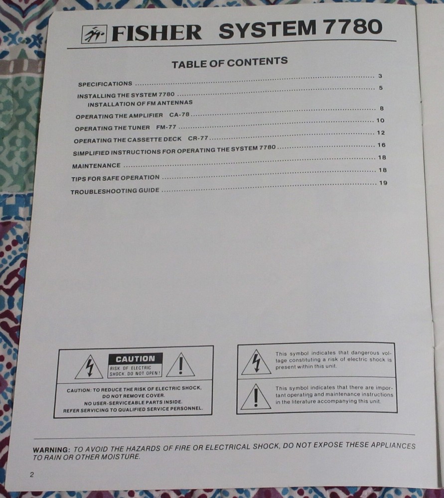 Pre-Owned Vintage 1983 "FISHER" Stereo SYSTEM 7780 Operating Instructions Manual Book I acquired this instruction manual a from a estate sale. All pages clean and intact. FREE SHIPPING IN THE USA! Thanks for viewing my auctions.