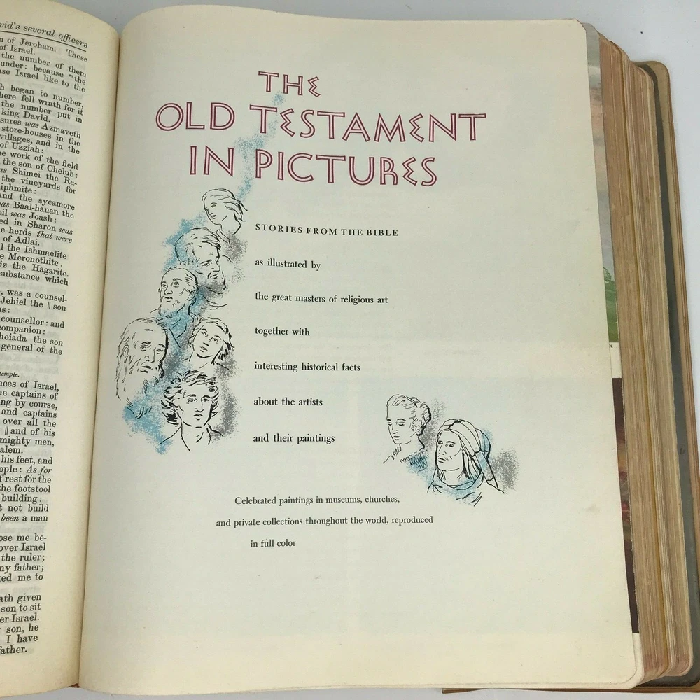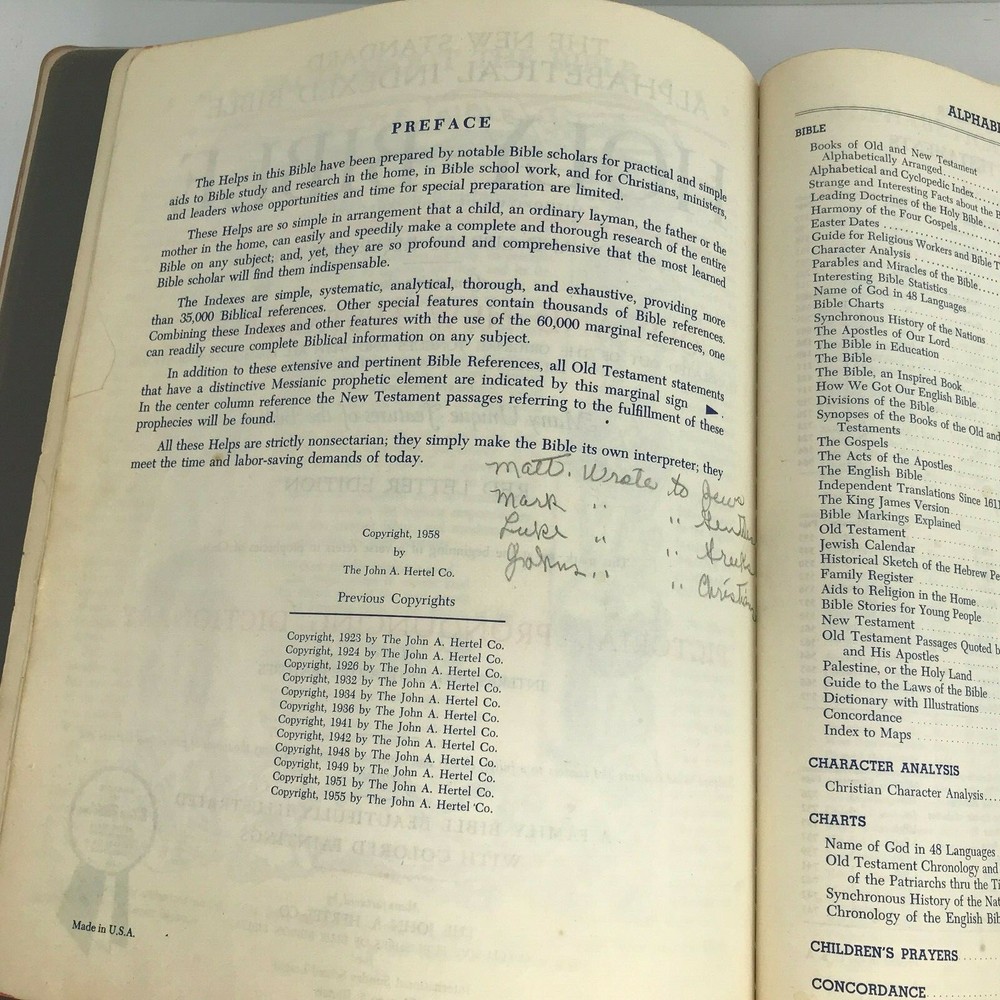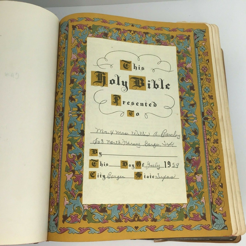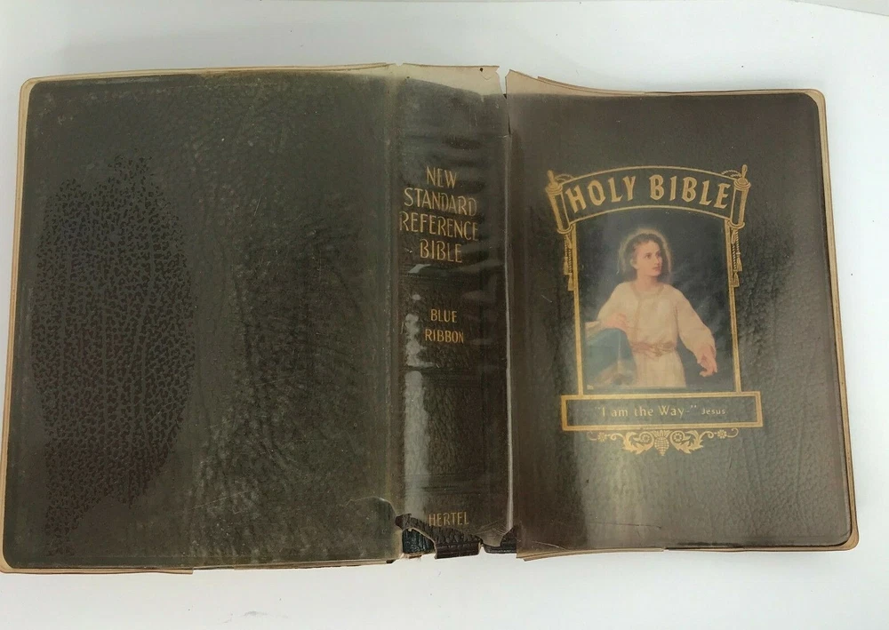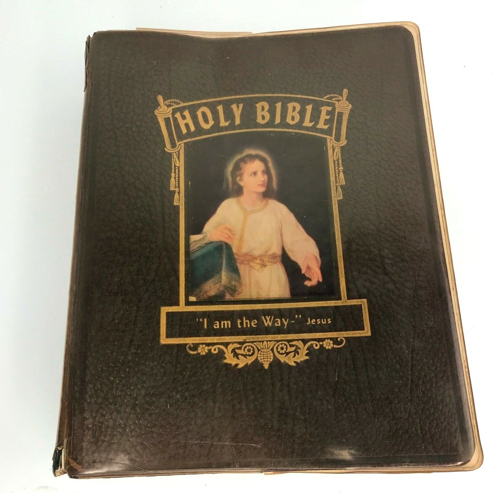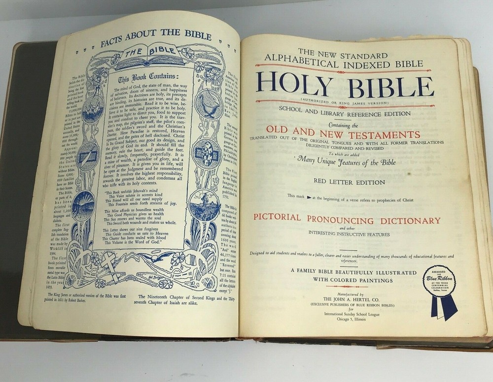 Vintage 1958 "The New Standard Alphabetical Indexed Holy Bible" Authorized or King James Version Spine and plastic cover damage, page wear, writing/personal information written on several pages inside, at least one index page separated from spine/loose, some staining on a few pages (still readable) School and Library Reference Edition Contains the Old and New Testaments Red Letter Edition Pictorial Pronouncing Dictionary Alphabetical and cyclopedic index of the Holy Bible from Genesis to Revelation (one page that has separated from spine/loose) Strange and interesting facts and figures about the Bible Alphabetical harmony of the Four Gospels A guide for religious workers and bible teachers Character analysis from the mental, spiritual and physical side Parables and miracles of the Bible (Old and New Testament) The name of God in 48 languages Old Testament Chronology (Bible Charts) Synchronous history of the Nations A family bible beautifully illustrated with colored paintings Manufactured by The John A Hertel Co Awarded the Blue Ribbon at the Texas Centennial Celebration - Dallas, Texas Weighs nearly 7.5 lbs