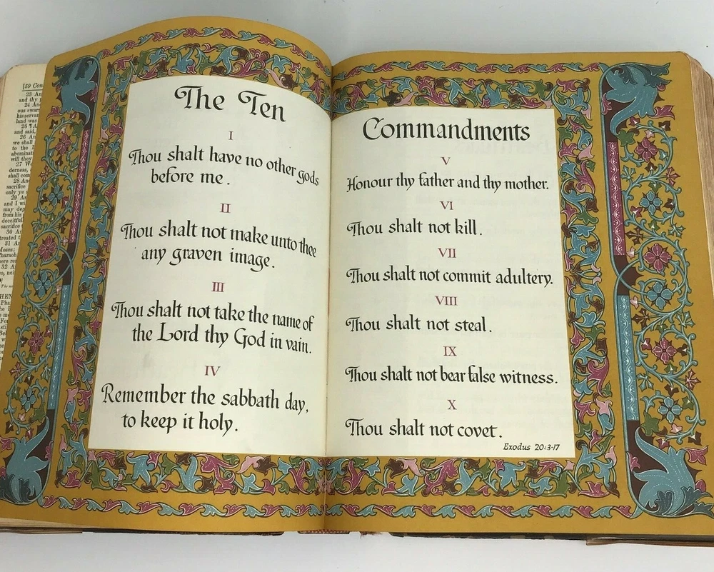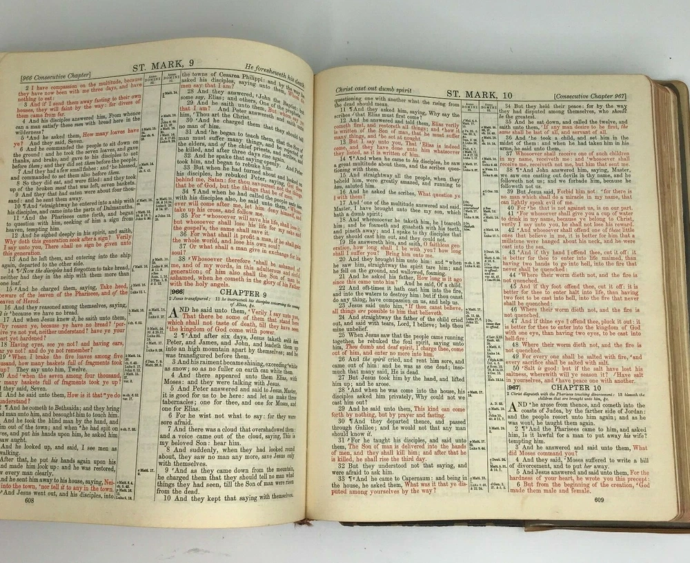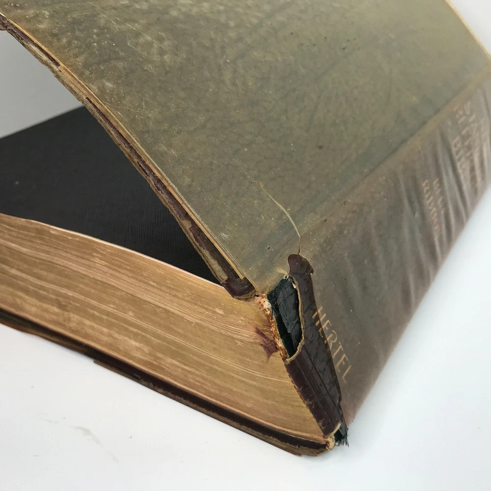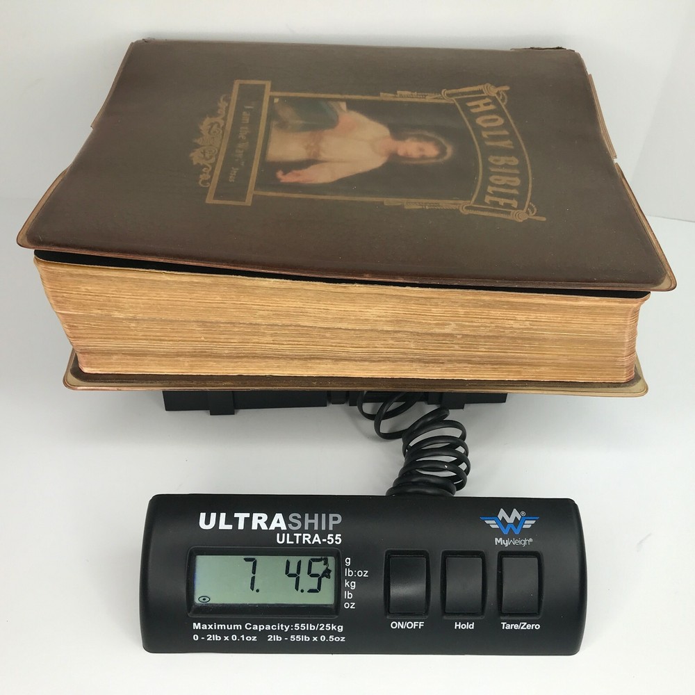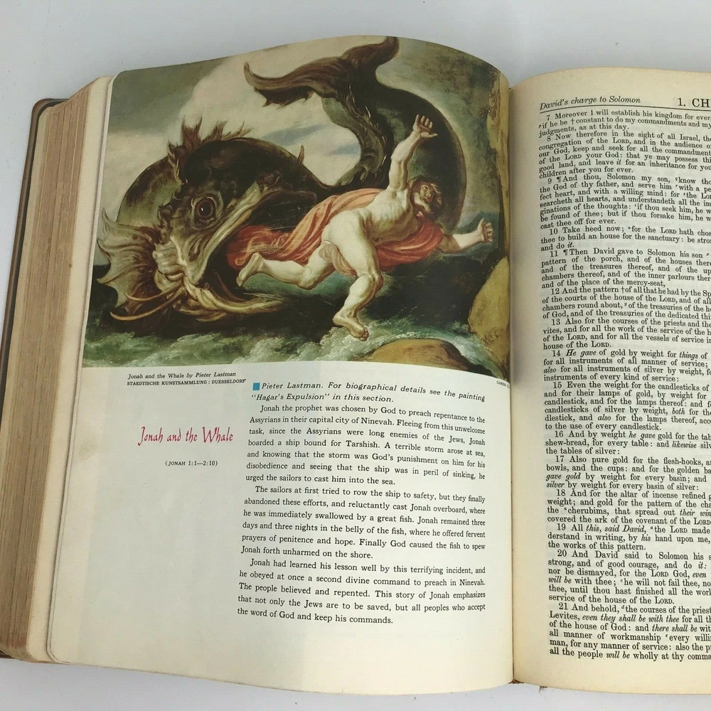 Vintage 1958 "The New Standard Alphabetical Indexed Holy Bible" Authorized or King James Version Spine and plastic cover damage, page wear, writing/personal information written on several pages inside, at least one index page separated from spine/loose, some staining on a few pages (still readable) School and Library Reference Edition Contains the Old and New Testaments Red Letter Edition Pictorial Pronouncing Dictionary Alphabetical and cyclopedic index of the Holy Bible from Genesis to Revelation (one page that has separated from spine/loose) Strange and interesting facts and figures about the Bible Alphabetical harmony of the Four Gospels A guide for religious workers and bible teachers Character analysis from the mental, spiritual and physical side Parables and miracles of the Bible (Old and New Testament) The name of God in 48 languages Old Testament Chronology (Bible Charts) Synchronous history of the Nations A family bible beautifully illustrated with colored paintings Manufactured by The John A Hertel Co Awarded the Blue Ribbon at the Texas Centennial Celebration - Dallas, Texas Weighs nearly 7.5 lbs