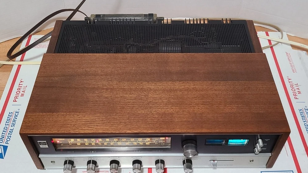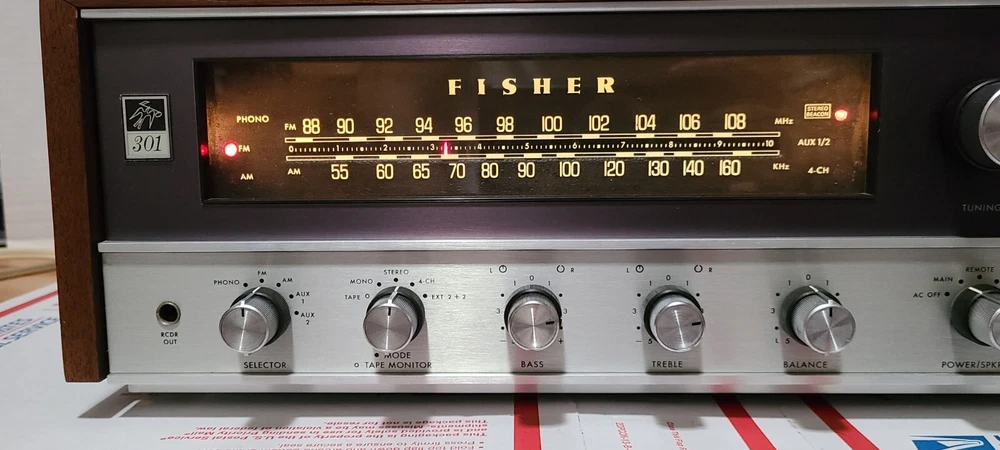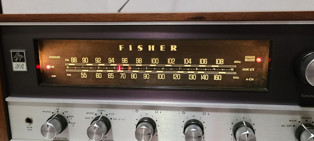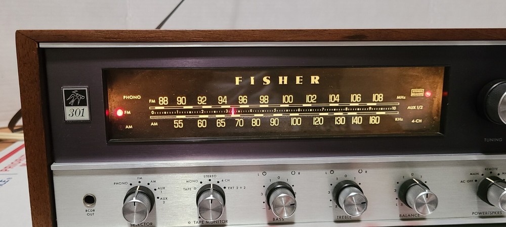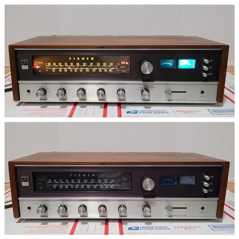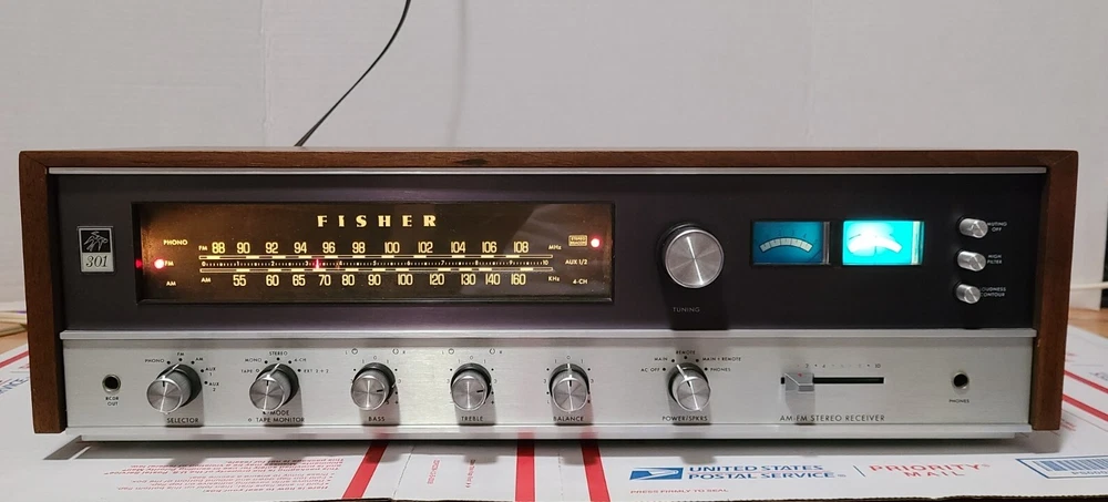Vintage 70's Fisher 301 AM/FM Stereo Receiver with Real Wood Cabinet & Original User Manual. Also comes with the original FM wire antenna. Receiver is in excellent cosmetic condition. Real walnut cabinet is super clean. Face has no major noticeable blemishes. Please see photos for exact condition. Receiver works well. AM/FM was tested and pulls in a good signal in my area. Phono input works when I hooked it up to a more modern Rega Planar 1 turntable. The only thing is that the Bulb for the left signal meter is out but functionality wise the meter does work. Unit weighs around 28 lbs so with packing material and box, shipping package will weigh at least 31 lbs. I have a lot of experience packing heavy delicate audio equipment. Please see my feedback. Receiver will be packed with extreme care using bubble wrap and packing peanuts to ensure safe delivery.