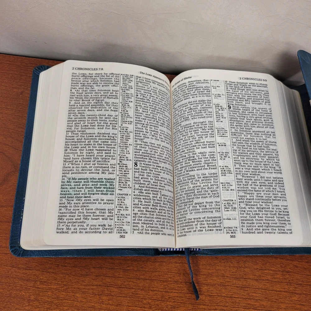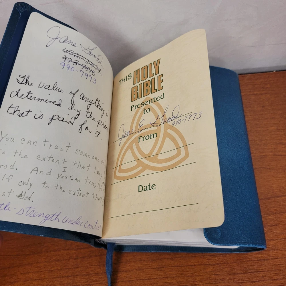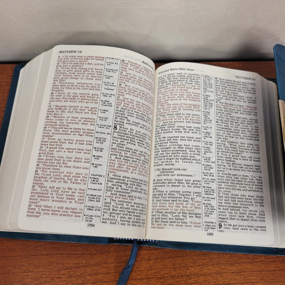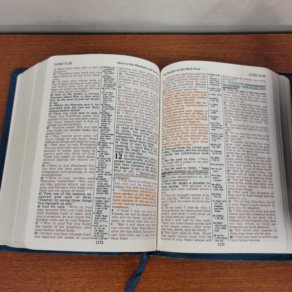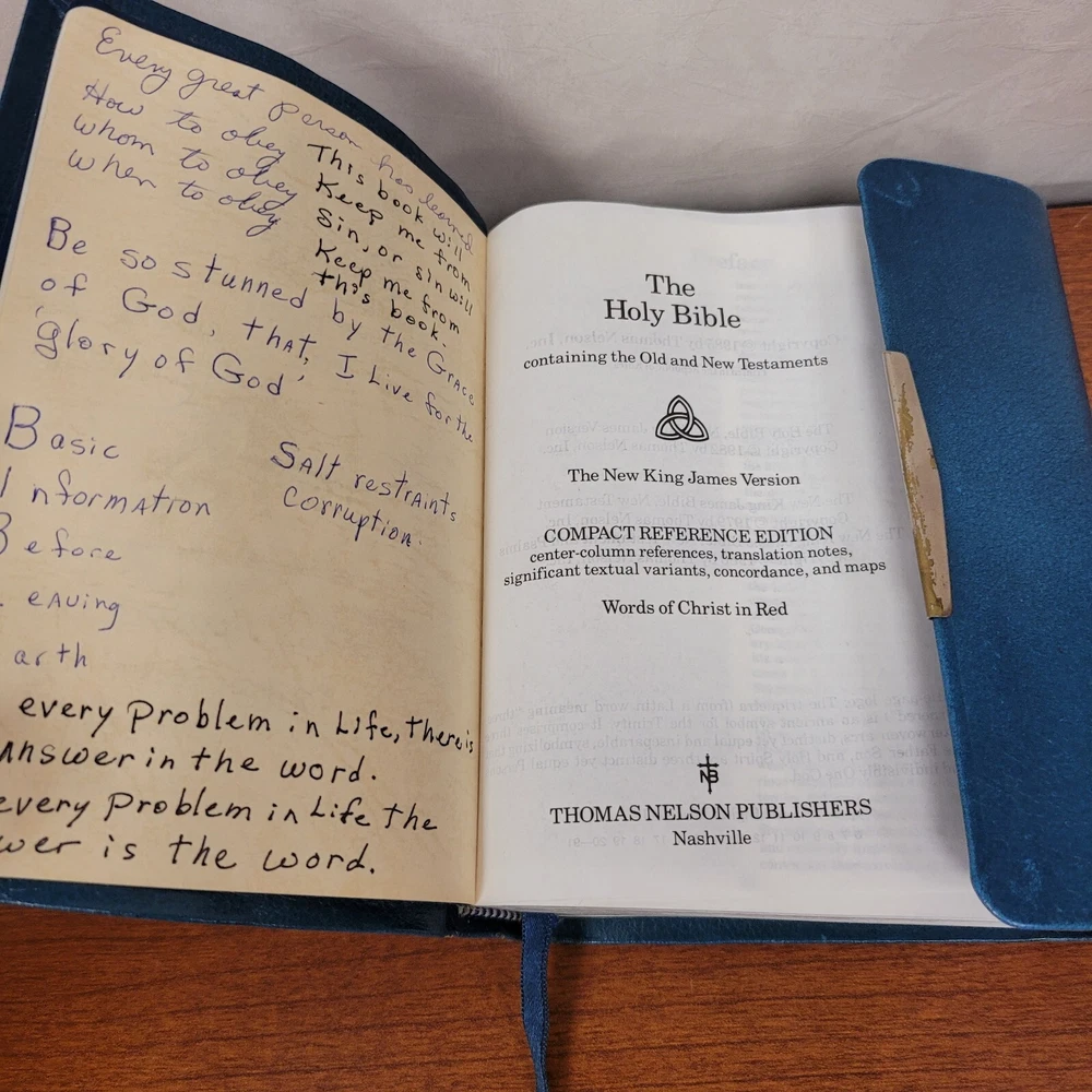 Vintage Holy Bible King James Version Red Letter Nelson 244SB Aqua Bonded Leather Snap Cover has some wear on the edges. There is writing on the presentation page. And some highlighting/underlining throughout. But nothing to detract from usability. Please see pictures
