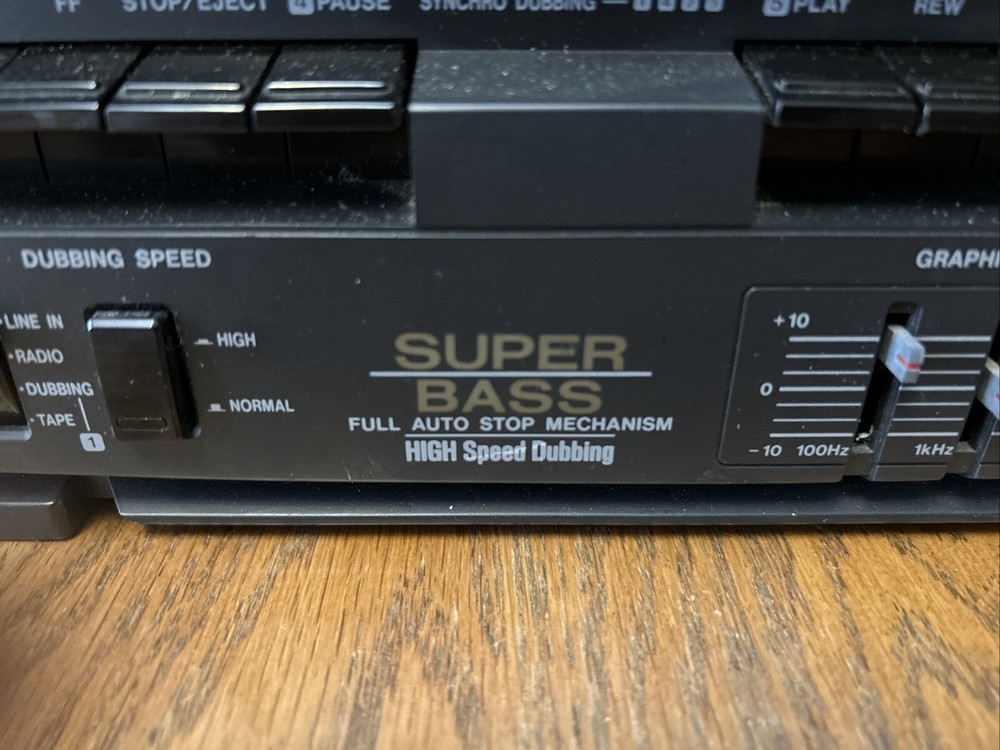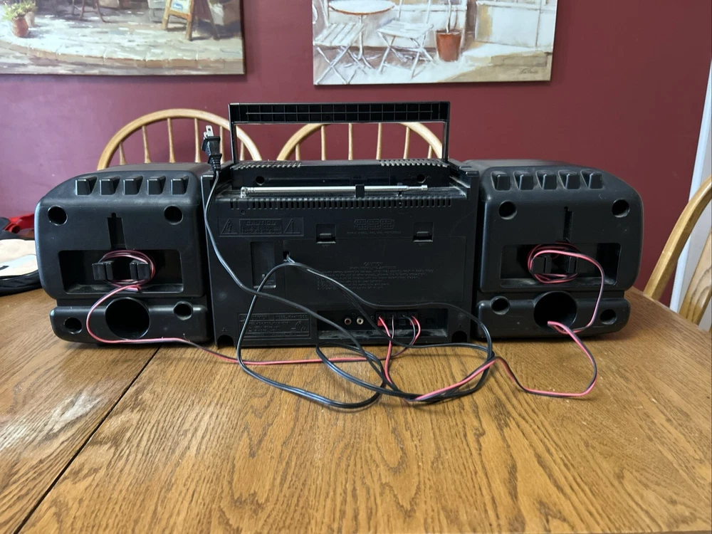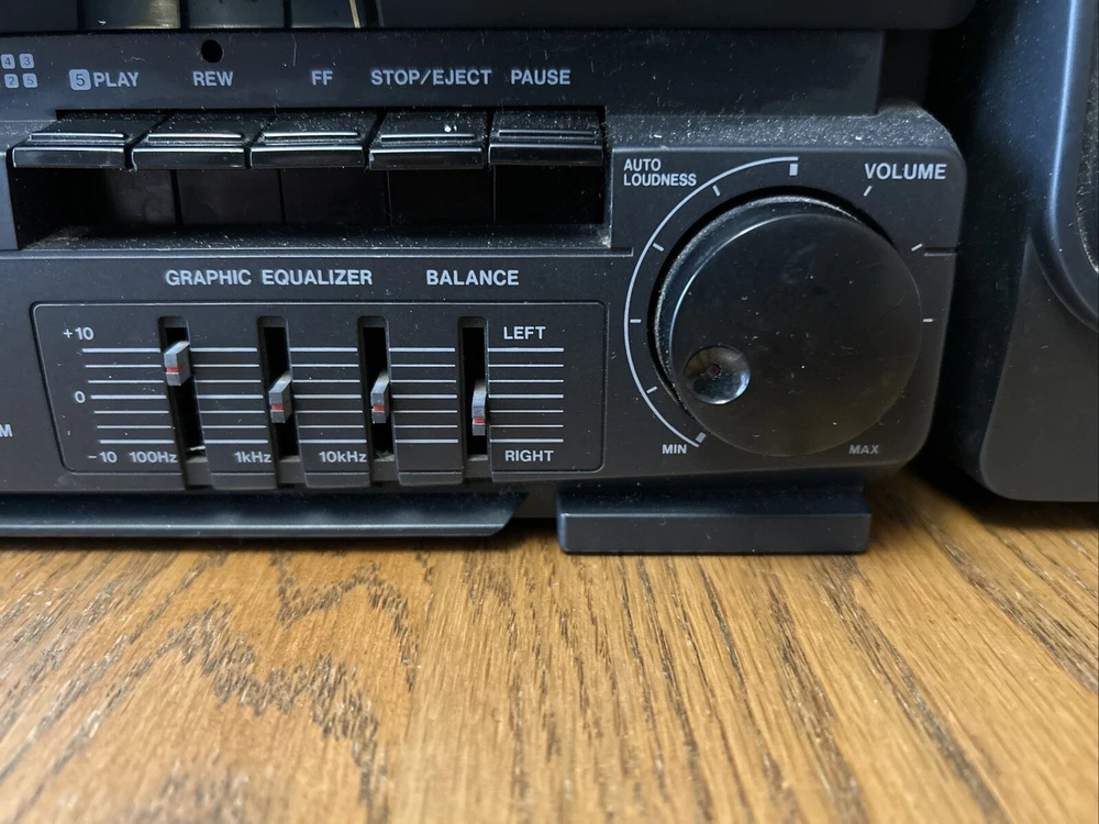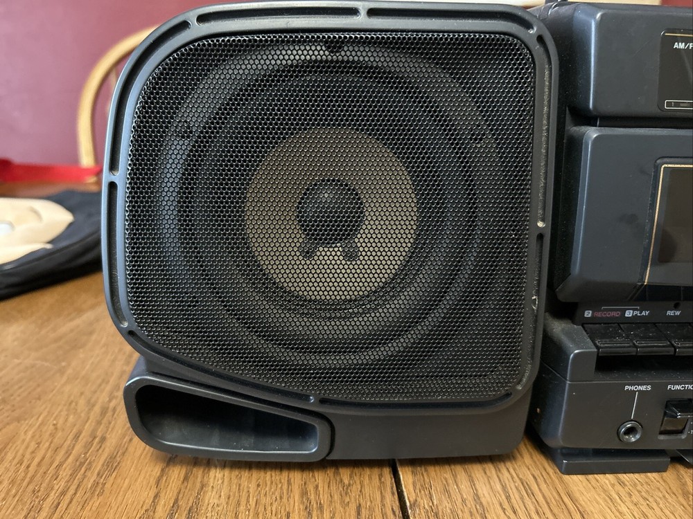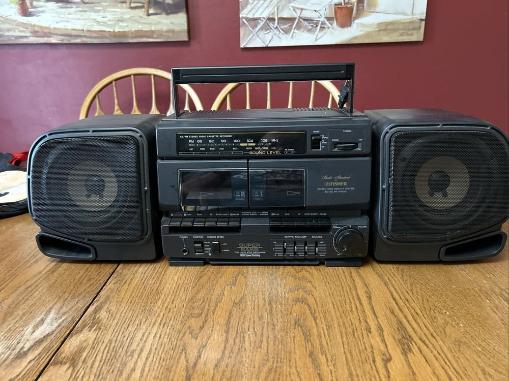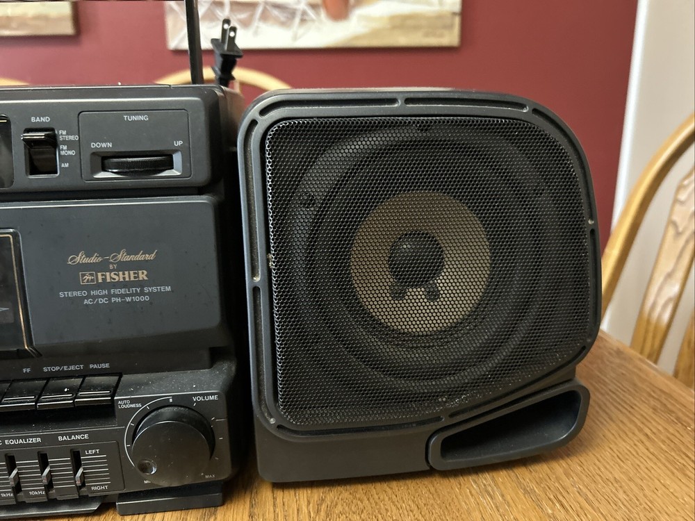 Take your music on-the-go with this vintage Fisher PH-W1000 AM/FM portable boombox stereo. This classic black unit is perfect for any music lover and features detachable speakers for a versatile listening experience. The boombox is designed for cassette tape playback and has a built-in AM/FM tuner for those who prefer to listen to radio. The Fisher PH-W1000 is a high-quality unit that is perfect for both home and outdoor use. It is a great addition to any music collection and is sure to impress with its impressive sound quality. This unit is a must-have for anyone who loves music and wants to enjoy it in style. Includes 33 cassette tapes One side of cassette plays both speakers and the other only one. Sounds great