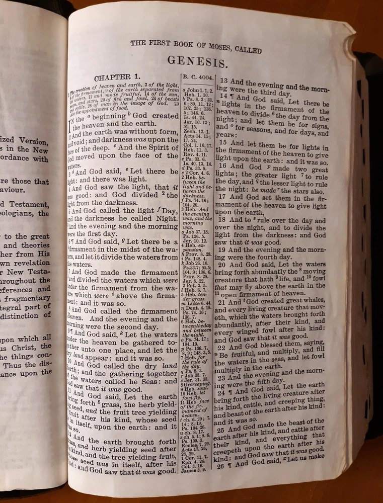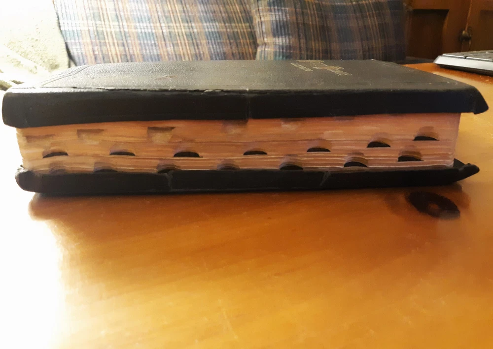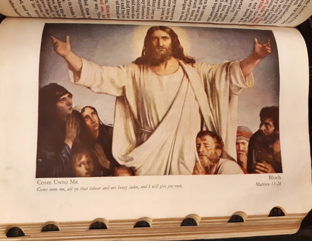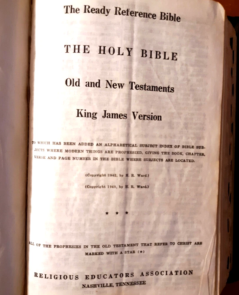 Copyright 1948, H.R. Ward, this Ready Reference Bible was published by the Religious Educators Association (REA) out of Nashville, TN. This is a King James Version of the Holy Bible. Features include prophesies in the Old Testament referring to Christ marked with stars, and words of Christ in the New Testament in red letters . There are also thumb index tabs for quickly accessing each book. Illustrations are reproductions of classical religious paintings by artists such as Franck, Poussin, Rembrandt, Bloch, Reni, and more -- some in color, some in black & white. Sixteen pages of color maps fill the back, and there are also some B&W photographs & drawings of the Holy Land. For those who love genealogy, this Bible has family register pages including marriage record, births, family marriages, and deaths. (All are blank and ready for your entries except that there are two baptisms written at the bottom of the Births page -- see photos.) Also, please read full details provided in Condition field. This Bible has an amazing array of Readers' Aids , including: Subject index Synopsis of books of the Bible Numerous essays from Biblical scholars Information on Jewish feasts & festivals, divisions of time, weights, money, & measures Harmony of the Gospels Concordance Truly, this has just about every feature one would want in a Bible -- all found in a vintage collectible. From research & location found, this Bible is believed to have belonged to a veteran of the U.S. Air Force who also served as commander of his area's American Legion post. Packaged in a box (not poly mailer) to protect the leather edges, and ready to ship immediately from our smoke-free home. Thank you for shopping with us.