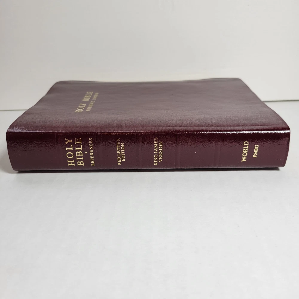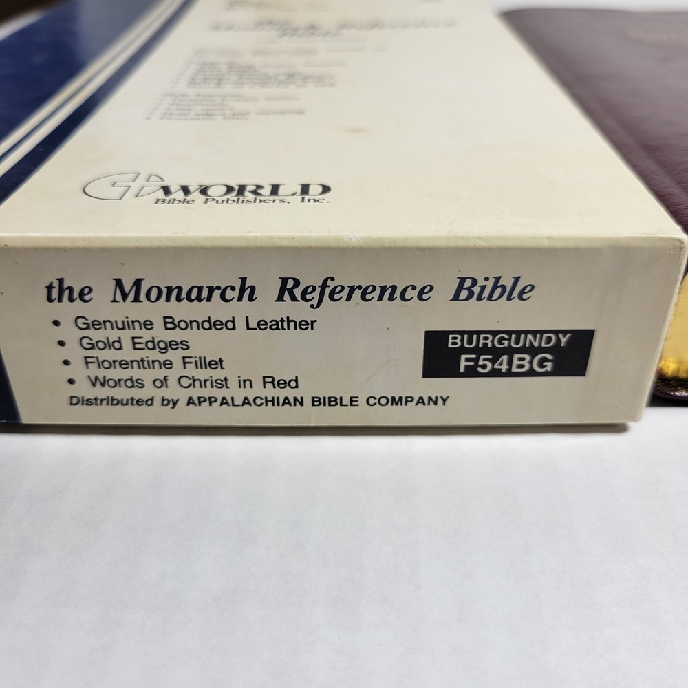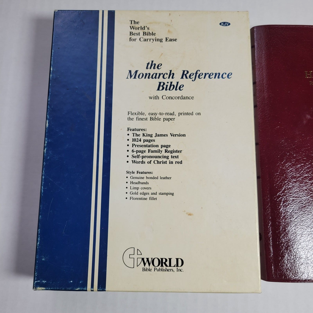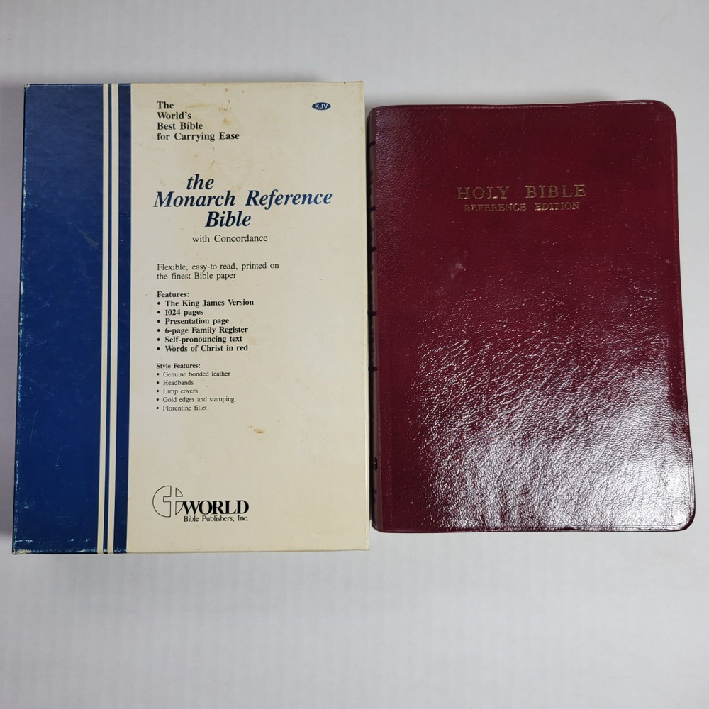 This listing is for a vintage Monarch Reference Bible King James Version red letter edition with concordance. Box has wear and discoloration. Bible itself is in good condition with some minor cover marks. No writing inside or missing pages.
