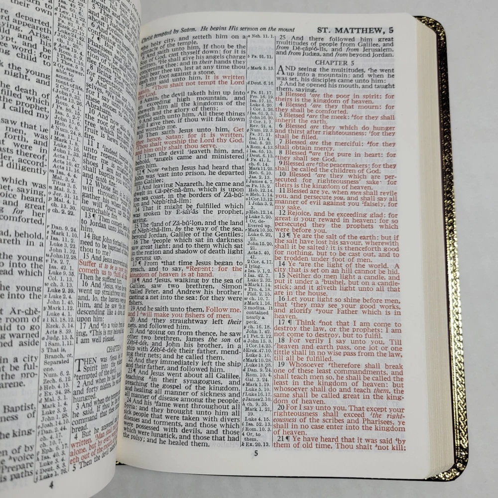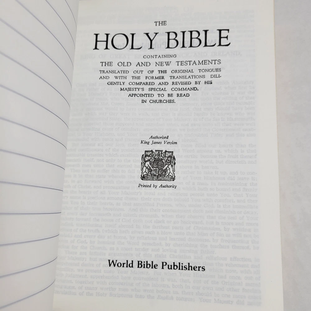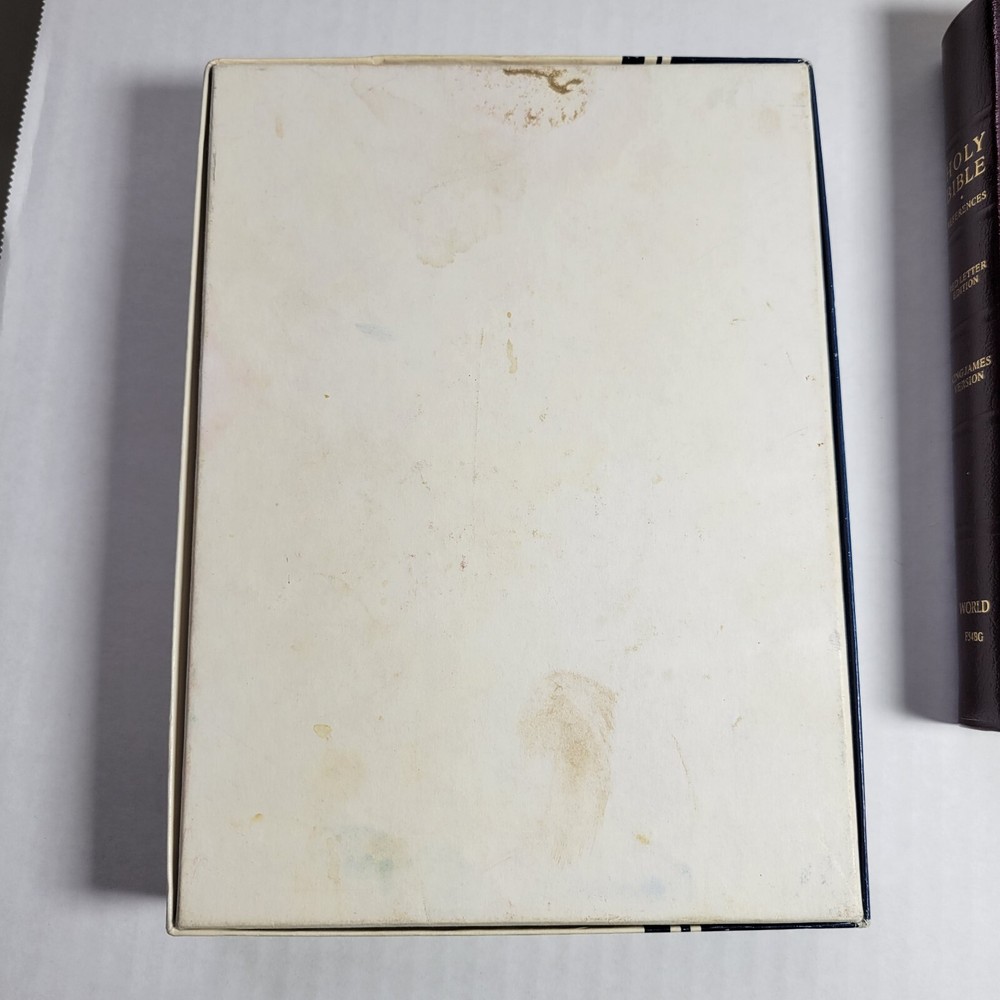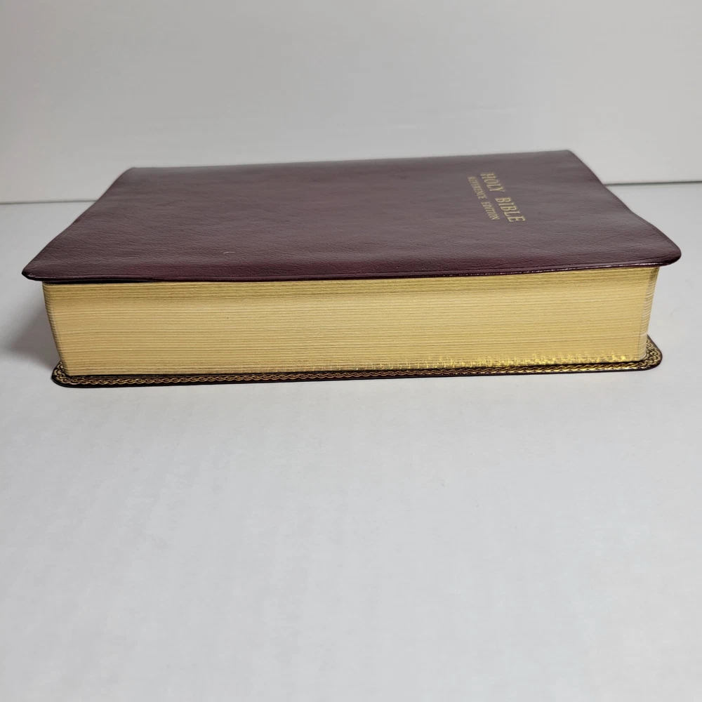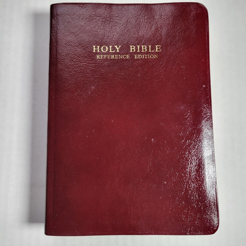 This listing is for a vintage Monarch Reference Bible King James Version red letter edition with concordance. Box has wear and discoloration. Bible itself is in good condition with some minor cover marks. No writing inside or missing pages.