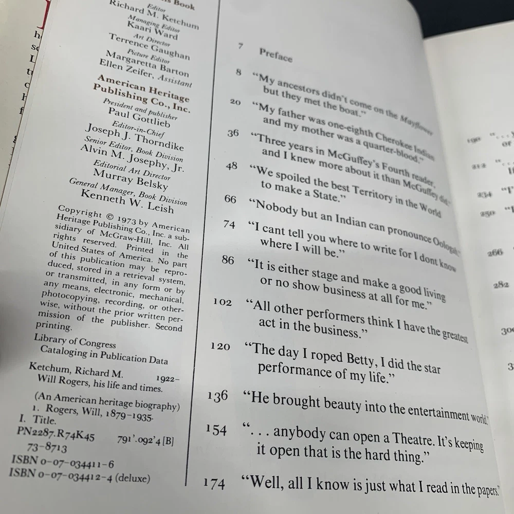 This vintage hardcover book titled "Will Rogers, His Life and Times" by Richard M. Ketchum is a limited/special edition memorial published by McGraw-Hill International Publishing Group in 1973. The book is 10 inches long and 7.25 inches wide, with 415 pages that cover the life and career of the legendary entertainer and performing artist, Will Rogers. The book is illustrated and features a faux leather bound cover, making it a perfect addition to any collection of biographies and true stories. It is suitable for young adults and adults, and is written in English, the original language of publication. This book is a must-have for anyone interested in the entertainment and performing arts industry, and the life of one of its most iconic figures.