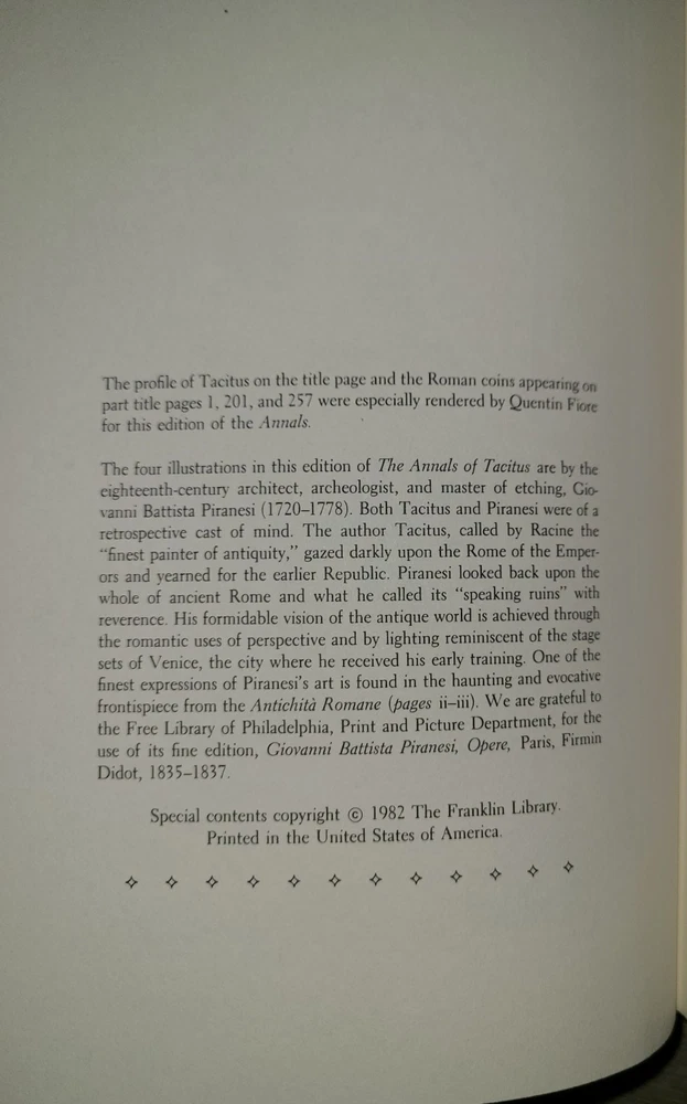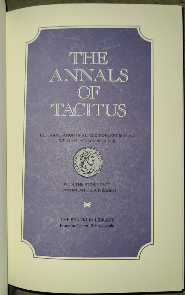 Vintage leatherbound book, The Annals of Tacitus: The Translation of Alfred John Church & William Jackson Brodribb, with the etchings of Giovanni Battista Piranesi, 1982. Published by The Franklin Library. Measures 6 1/4" x 9 1/2". Minor wear as shown in photos. Sent to you from my smoke and pet free household in the US. No returns except in cases of incorrect info (I do my best to list all defects clearly, but I do occasionally miss things). Please see my other listings - now with FREE domestic shipping on all items! Please note that all my orders ship within ONE business day after payment is received (no Saturday shipping).
