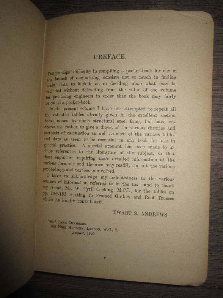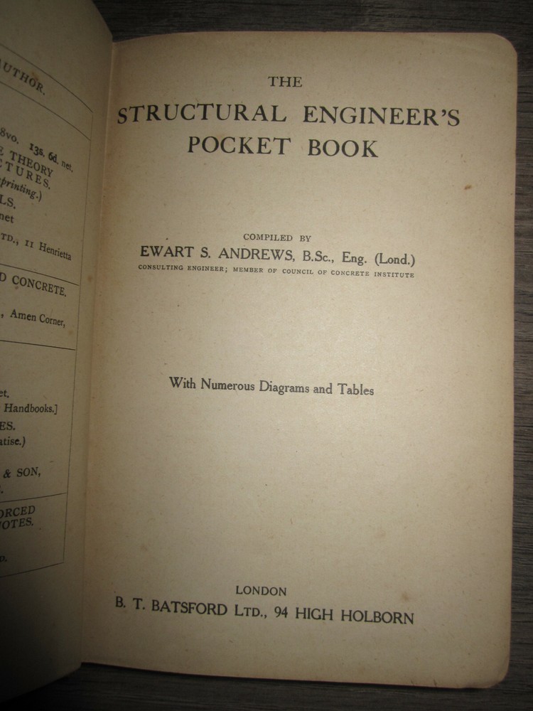 Vintage leather bound book, The Structural Engineer's Pocket Book by Ewart S. Andrews, 1920. Published by B.T. Batsford, London. Rare! Measures 5" x 7 1/8". Heavy wear, some tanning as shown in photos. Sent to you from my smoke and pet free household in the US. No returns except in cases of incorrect info (I do my best to list all defects clearly, but I do occasionally miss things). Please see my other listings - now with FREE domestic shipping on all items! Please note that all my orders ship within ONE business day after payment is received (no Saturday shipping). ***If you would like to pay for expedited shipping, I typically use USPS Priority Mail by default. If you prefer FedEx / UPS, just let me know. Please wait to pay until you receive an updated invoice with the shipping charge.***