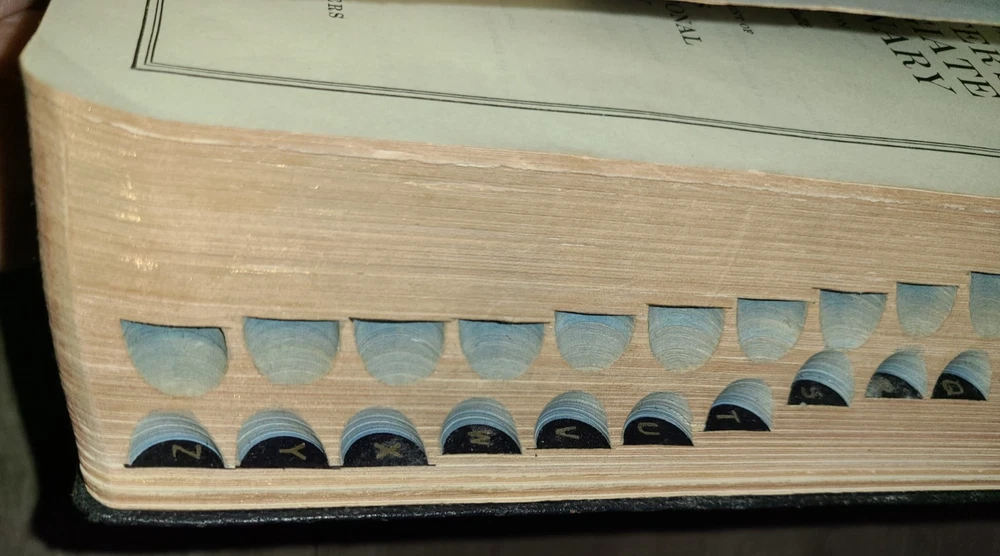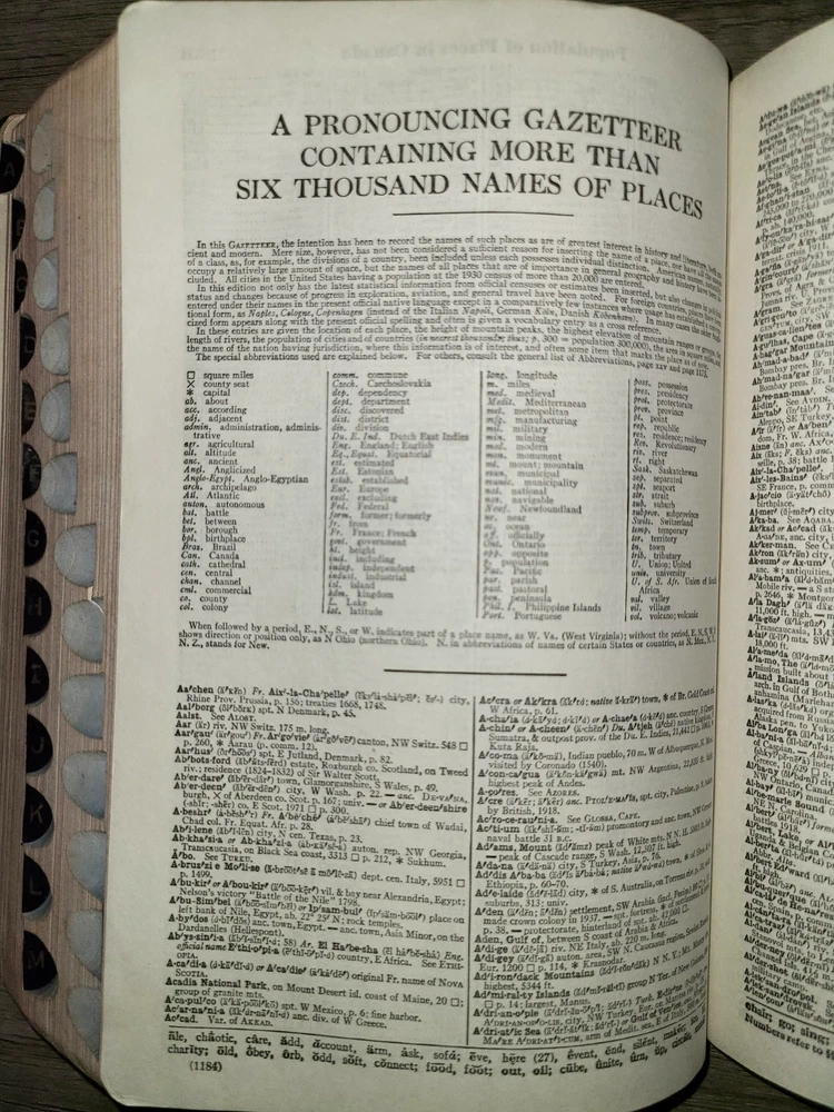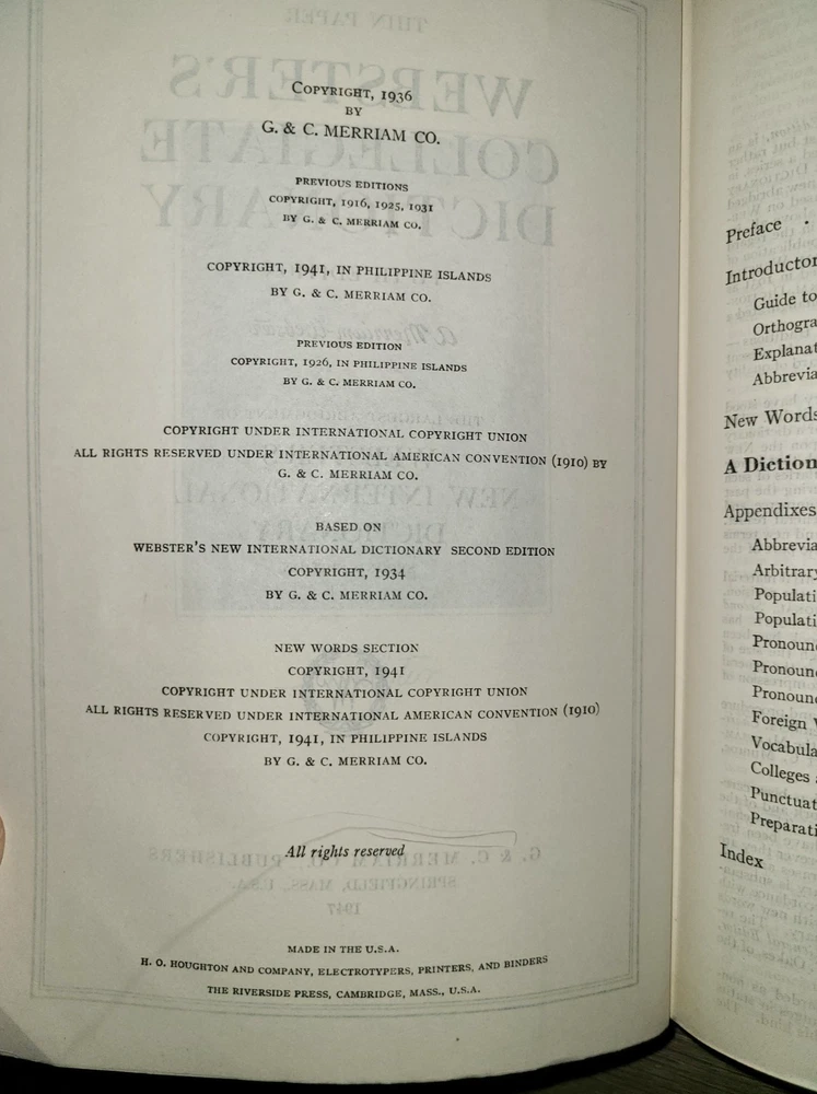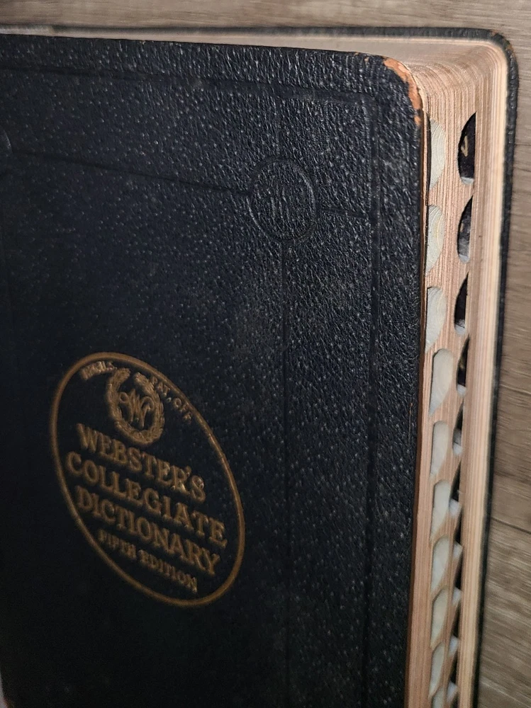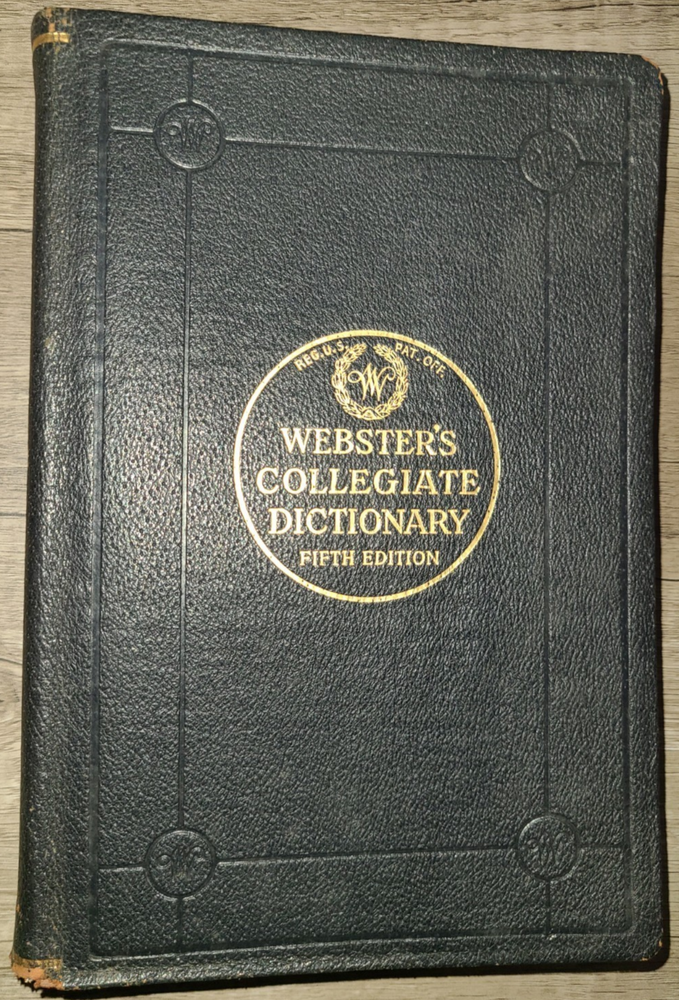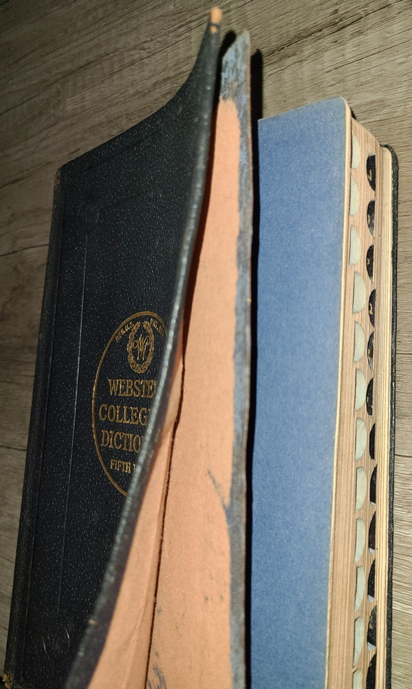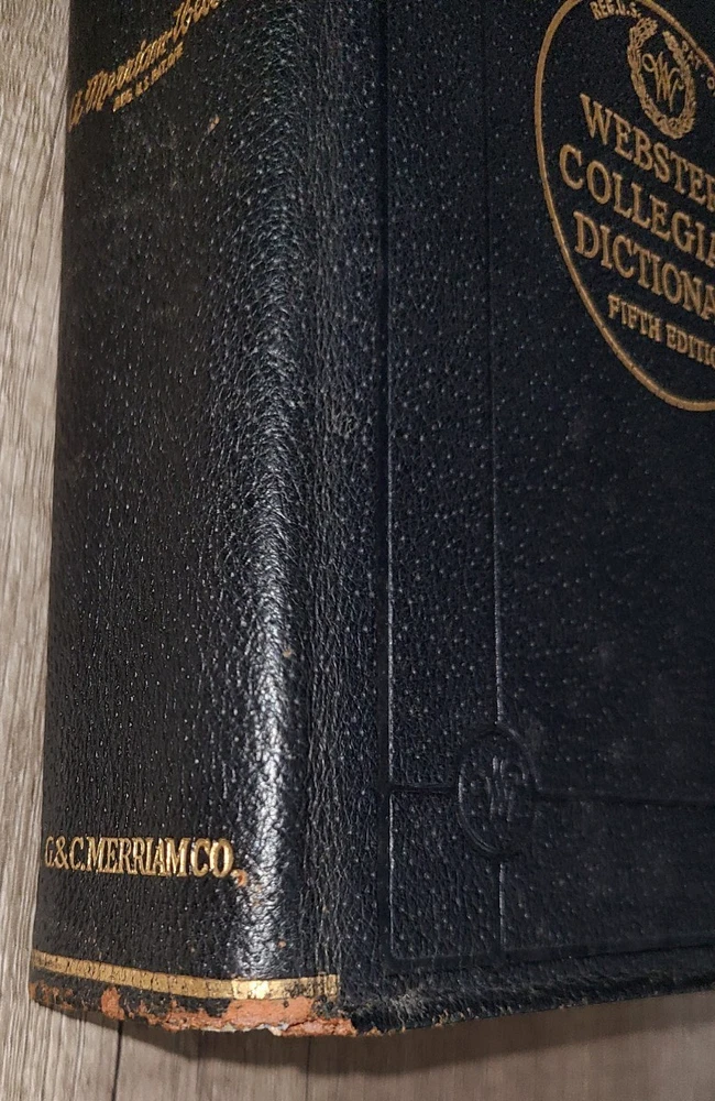Vintage leartherbound book, Webster's Collegiate Dictionary, Fifth Edition (Thin Paper), 1947. The largest abridgment of Webster's New International Dictionary, Second Edition. Published by G. & C. Merriam Co., Springfield, Mass. Gilt edged pages with indented letter tabs. Measures 6" x 9". Some wear as shown in photos, front pastedown inside cover partially separated. Sent to you from my smoke and pet free household in the US. No returns except in cases of incorrect info (I do my best to list all defects clearly, but I do occasionally miss things). Please see my other listings - now with FREE domestic shipping on all items! Please note that all my orders ship within ONE business day after payment is received (no Saturday shipping).