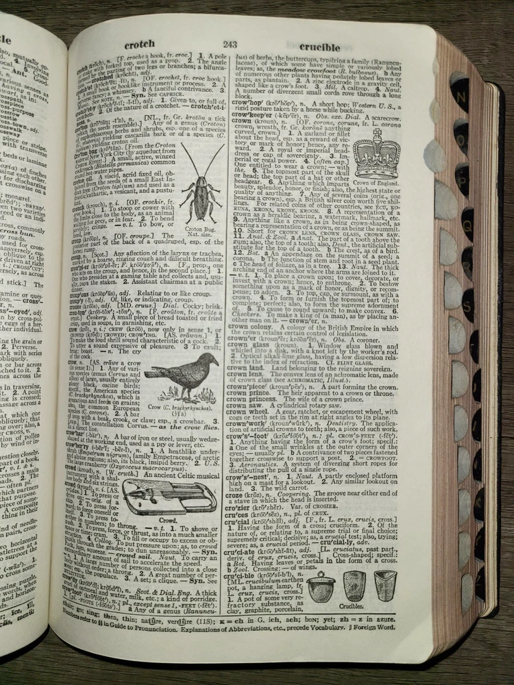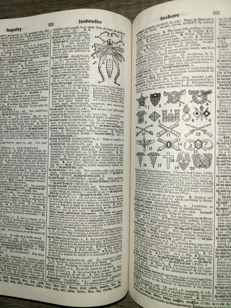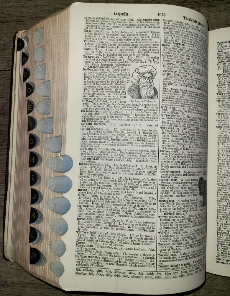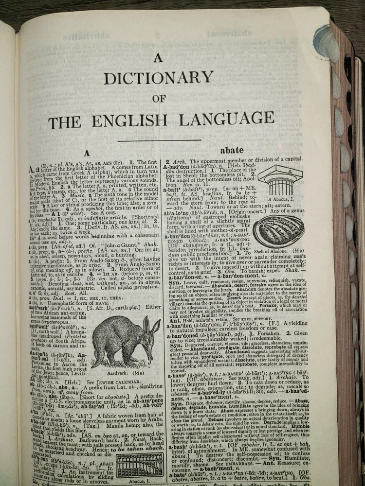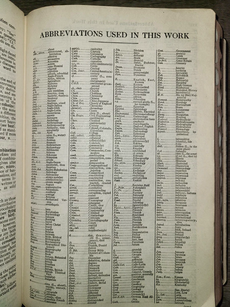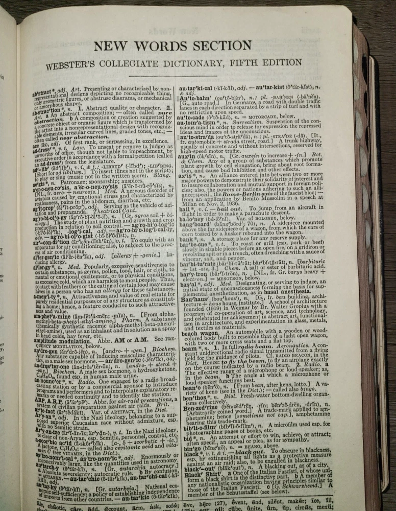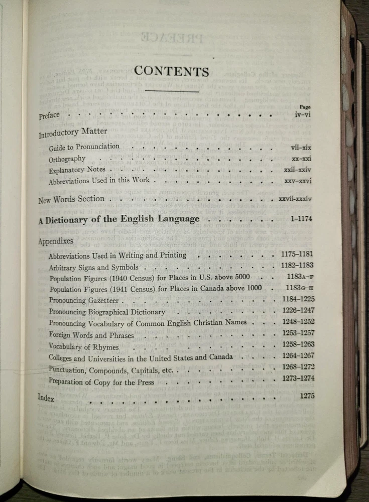 Vintage leartherbound book, Webster's Collegiate Dictionary, Fifth Edition (Thin Paper), 1947. The largest abridgment of Webster's New International Dictionary, Second Edition. Published by G. & C. Merriam Co., Springfield, Mass. Gilt edged pages with indented letter tabs. Measures 6" x 9". Some wear as shown in photos, front pastedown inside cover partially separated. Sent to you from my smoke and pet free household in the US. No returns except in cases of incorrect info (I do my best to list all defects clearly, but I do occasionally miss things). Please see my other listings - now with FREE domestic shipping on all items! Please note that all my orders ship within ONE business day after payment is received (no Saturday shipping).