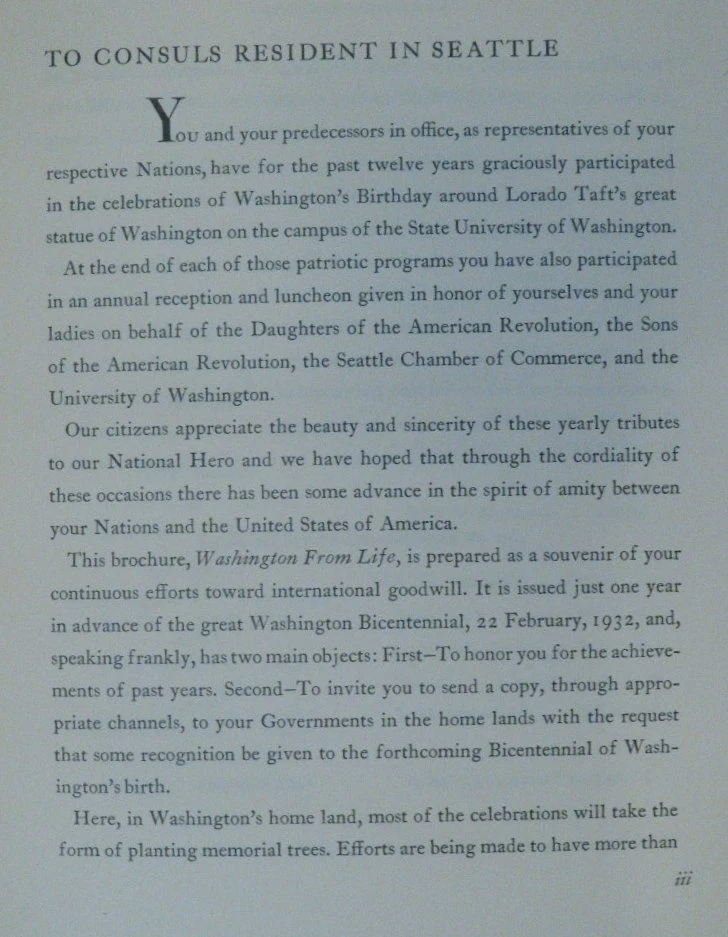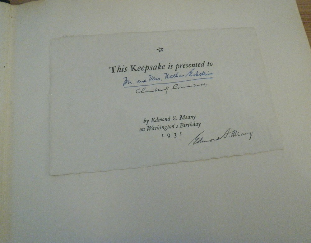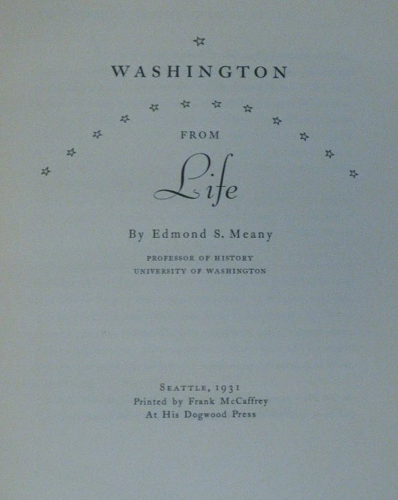 WASHINGTON FROM LIFE by Edmond S. Meany 1931 Houdon, Gilbert Stuart, Peale WASHINGTON FROM LIFE by Edmond S. Meany 1931 Houdon, Gilbert Stuart, Peale POB#49365 TITLE: Washington from Life AUTHOR: Edmond S. Meany PUBLISHER: Seattle: Printed by F. McCaffrey at his Dogwood Press DATE: 1931 DESCRIPTION: 2 preliminary leaves, iii-ix, [1], 15 pages, 1 leaf : 9 portrait ; 33 cm CONDITION NOTES: GOOD. Caps perished with some peeling to front joint. A library bookplate on front pastedown. BINDING: Black morocco quarter strip over white cloth. . A keepsake published on Washington's birthday, 1931, in preparation for the bicentennial celebration of 22 February, 1932." Nine portraits of Washington, busts and plaster casts by Houdon, the "Boston Athenaeum" portrait by Gilbert Stuart. Portrait of Houdon by Rembrandt Peale. Inscribed on a laid in greeting by author to Mr & Mrs Eckstein, Chamber of Commerce. Listing and template services provided by inkFrog