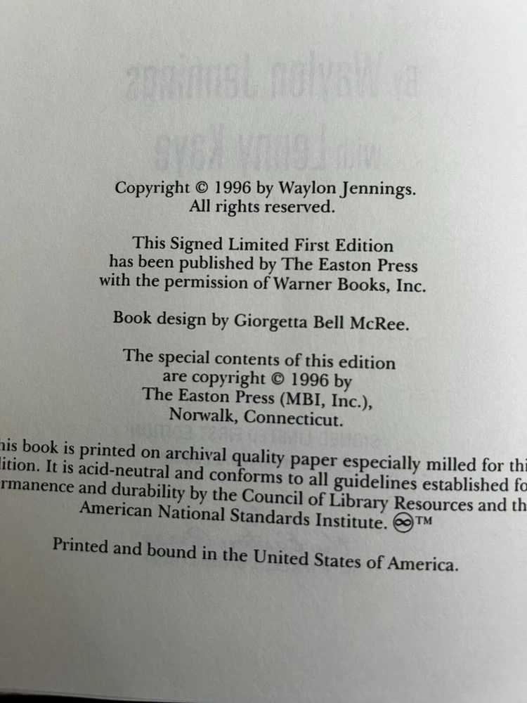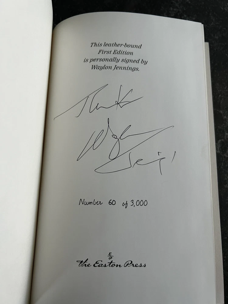 The product is a leather-bound, limited edition, collector's item book titled "WAYLON" by Waylon Jennings. It is a signed first edition autobiography of the country music legend, published by The Easton Press in Norwalk, CT in 1996. The book is illustrated and numbered, with English language and original printing. It falls under the category of Antiquarian & Collectible books and is related to the topic of Music, specifically North American country music. Signed copy 60 of 3000. Great condition. Unread.