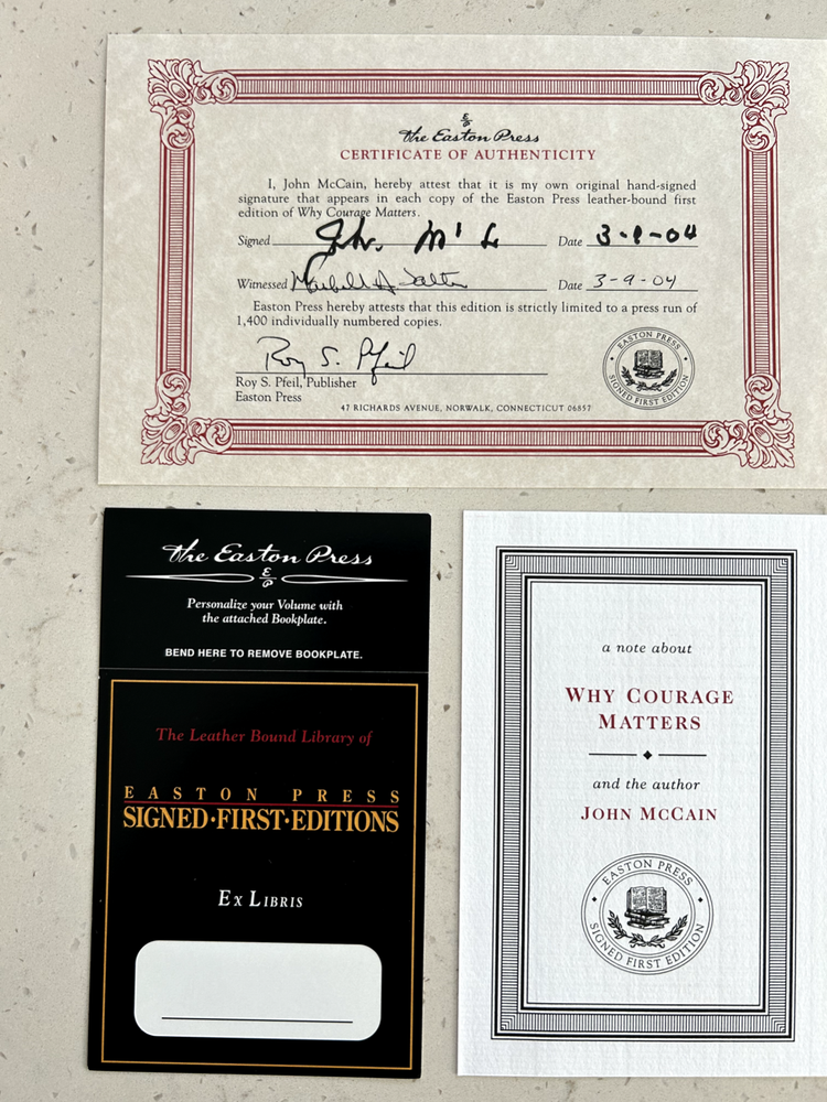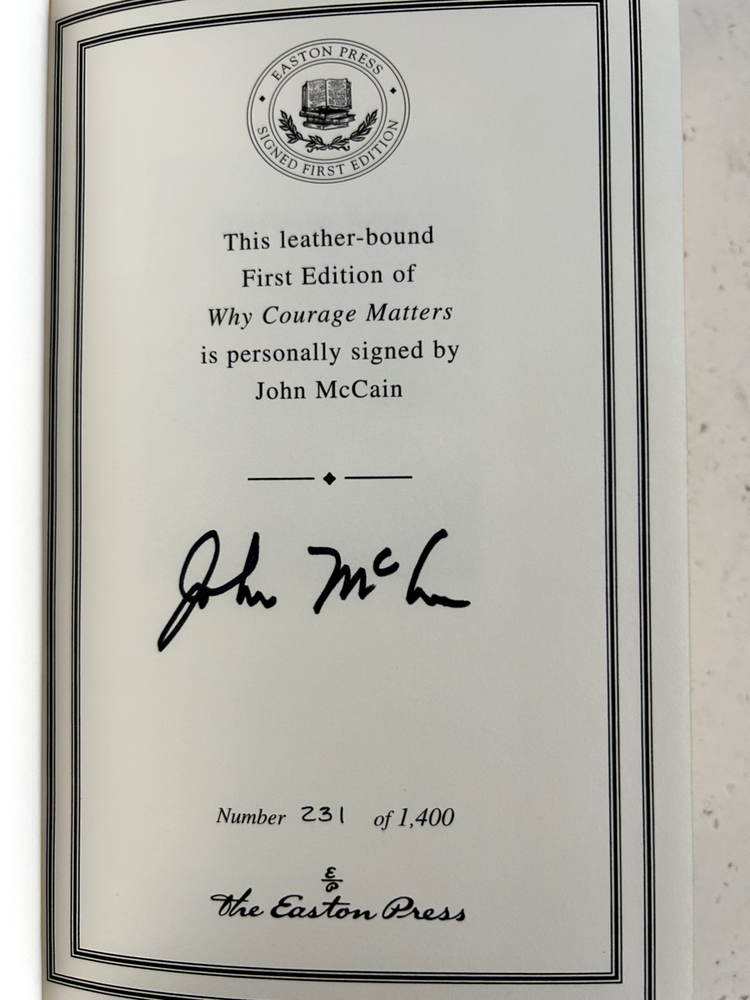 Why Courage Matters by John McCain Signed leather bound 1st edition w/ COA, numbered 231 of 1,400 Like New - book has not been read, no bent pages Easton Press "Signed First Editions" (2004) Bound in fine genuine leather with 22K gold page edges Archival quality acid-free paper Domestic shipping only Returns accepted within 30 days