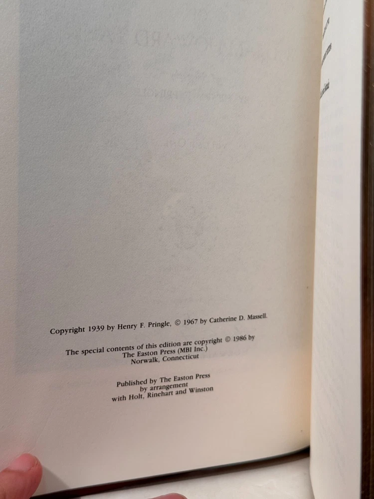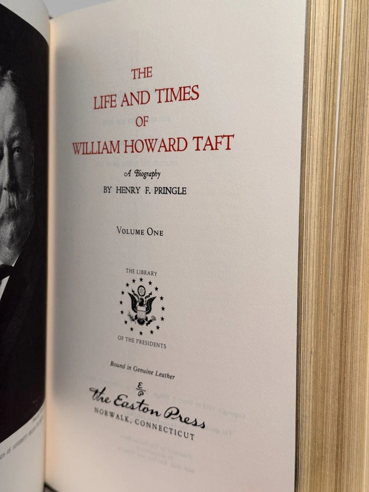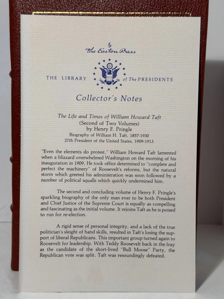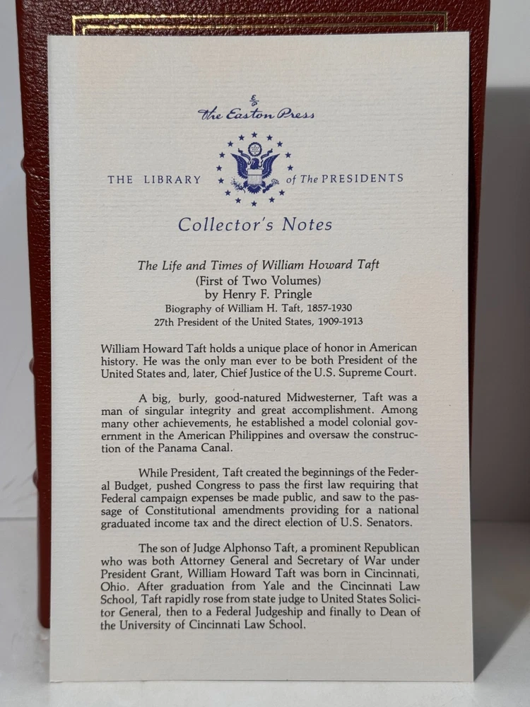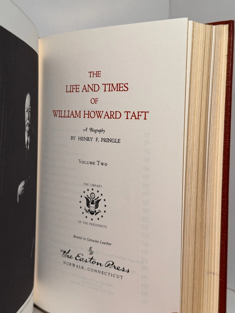 You are bidding on a very fine copy of a 1st Edition, 1st Printing of the Easton Press' THE LIBRARY OF THE PRESIDENTS series edition of Henry F. Pringle's 2 VOLUME SET of THE LIFE AND TIMES OF WILLIAM HOWARD TAFT - A Biography. This is a 2 Volume set edition about the life and work of the 27th President of The United States, William Howard Taft. Bound in beautiful genuine moroccan cowhide leather, the book features raised bars on the spine, gold tooling on the cover and spine, End-pages decorated with the seals of the U.S. Presidents, satin silk sewn-in bookmark, 22k gold dust on page ends on all 3 sides. Printed on archival quality acid-neutral paper, that will last for generations without diminishing in quality or looks. INCLUDES ORIGINAL, LIBRARY OF THE PRESIDENTS INSERT FOR BOTH VOLUMES. LIMITED, COLLECTOR'S EDITION FROM THE SERIES OF THE LIBRARY OF THE PRESIDENTS. Free Shipping in all of Continental United States. All other buyers, please check with me for shipping rates before bidding. ***NOTE: If you are dissatisfied with your purchase for any reason, please contact me first directly, and I will do all in my power to make sure you are satisfied with your purchase. *** See my other listings. I have a large collection of rare and collectible books, most leatherbound, others of first edition, first printing, even unpublished manuscripts. I will combine them during shipping so you can receive them together. Just message me your intent to buy more than one book, and I will hold them to be shipped together. Abell Happy Buying!