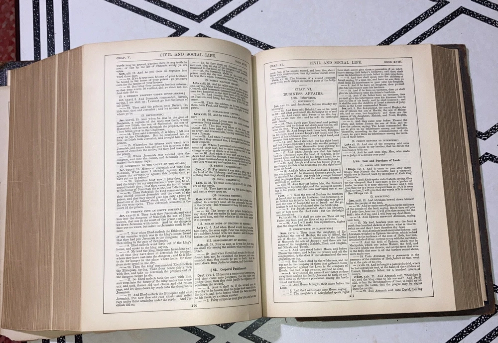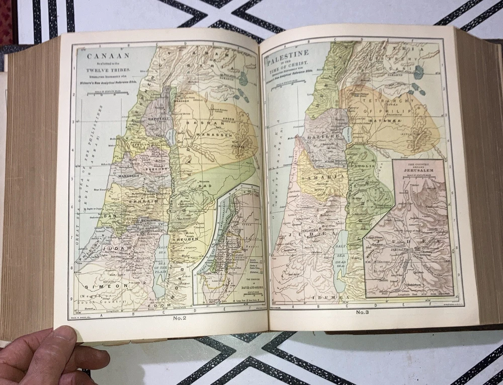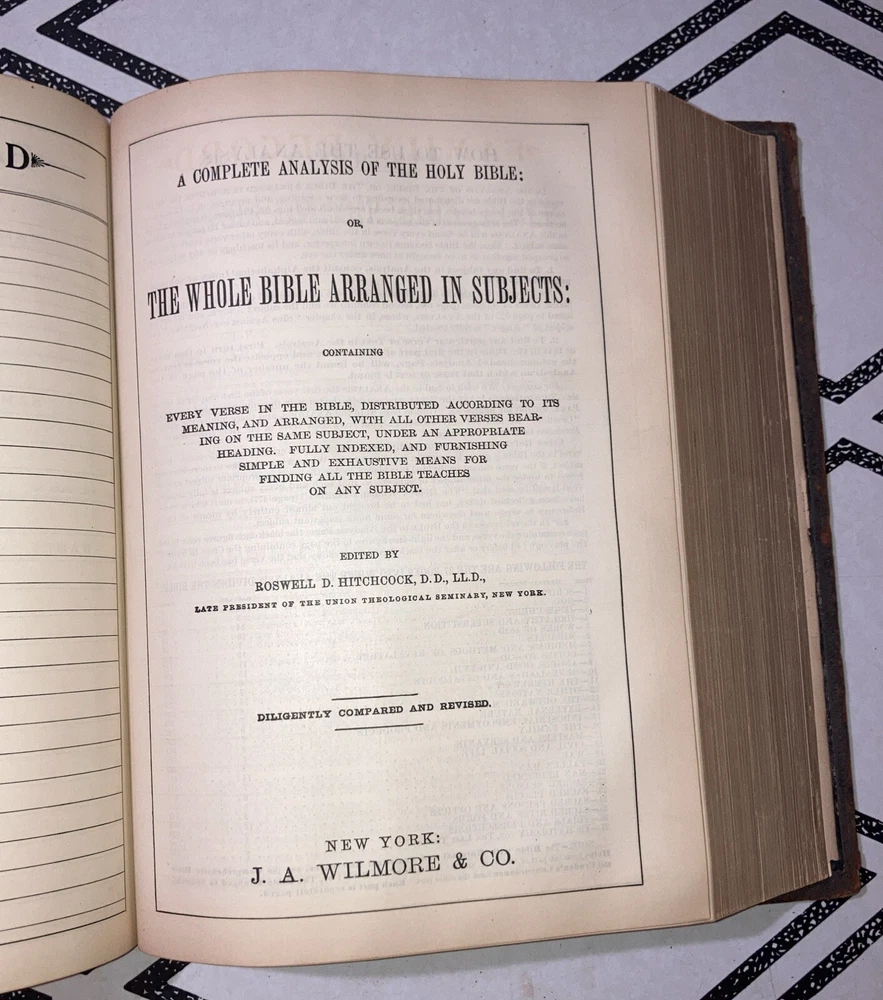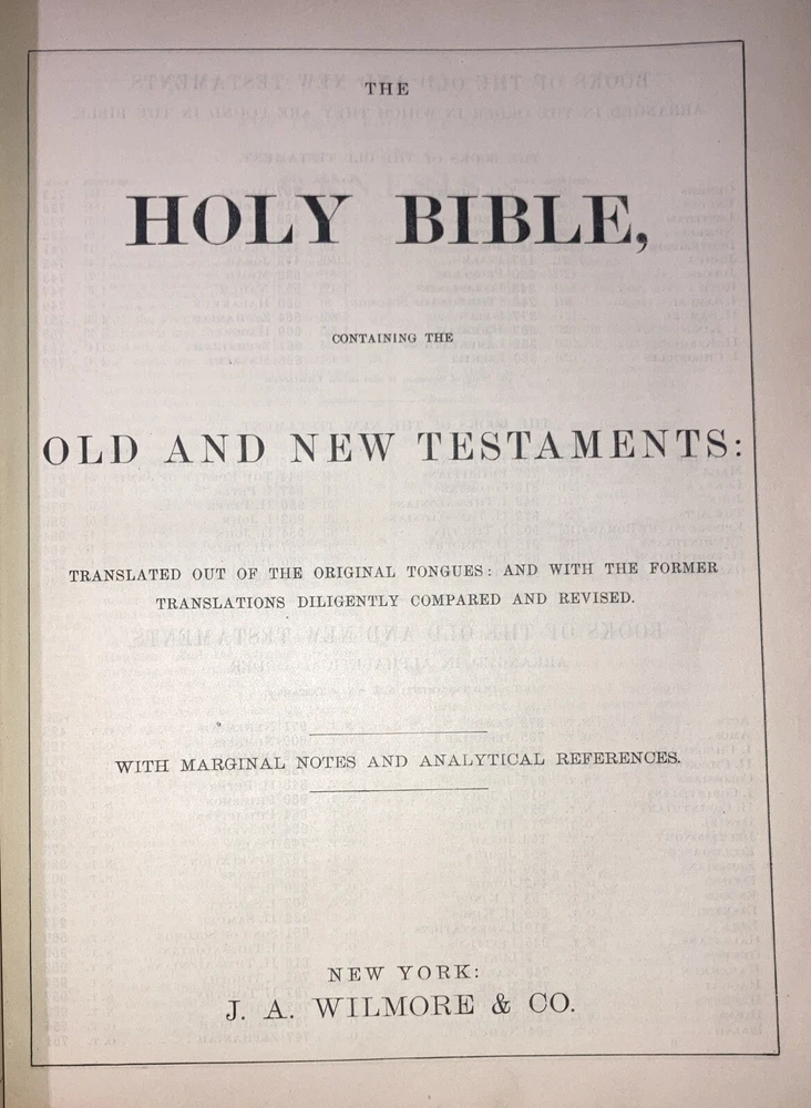 Wilmore ’s new analytical reference Bible : Containing the following four invaluable aids to the proper study of the word of God ; The holy Bible with marginal notes and analytical references Comprehensive Bible helps arranged in alphabetical order, revised and edited by Philip Schaff ( see photo. Actual title is longer. ) Published in 1900 by JA Wilmore and Company, New York This leather bound Bible is in generally good condition. The front and back boards are connected to the spine, the spine is connected to the binding securely. Front and back hinges are attached. Pages are bound well and turned easily. The only loose page is the beginning title page Inside the front cover . All other pages appear well bound. No marks. Minimal yellowing. Beautiful gold guilt leaf on all three page and sides . This Bible also comes with its own custom-made acid free cardboard sleeve cover. This Bible was part of the evangelical and reform historical society, Lancaster PA. Questions are welcome. Packed carefully with loving care and shipped via USPS media mail at no cost to buyer. Posted 8/27/24 Nick books Evangelical and reformed to historical society