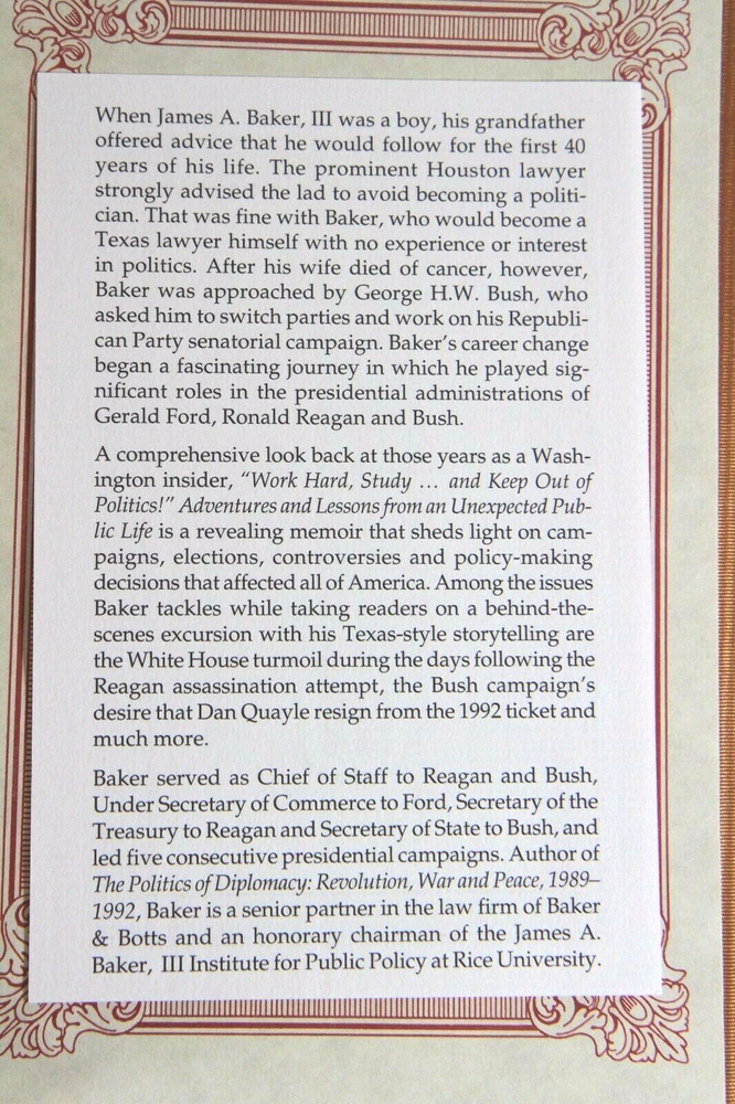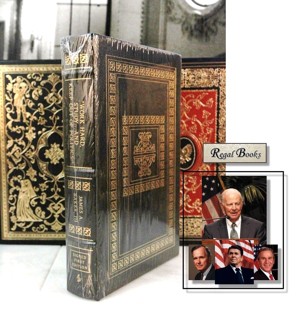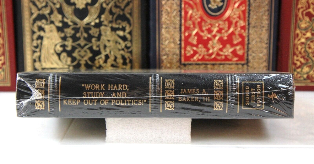 ***Copy of photos, personal formats, graphics, or text is prohibited . Ebay may drop listings with infractions. I review content regularly. Signed First Editions "Work Hard, Study... and Keep Out of Politics!" Author: James A Baker III Illustrations by Description: A True First Edition and SIGNED! James A. Baker III, a remarkable politician and statesman who represents a time when a divided Congress got things done, and when presidents and congress worked together. He was Ronald Reagan's Chief of Staff, and later Secretary of State for President Bush. Baker masterminded the Reagan Revolution and got much of Reagan’s hugely ambitious agenda through a hostile Congress. To this day he is considered the very prototype of an effective and strong presidential chief-of-staff. As Secretary of the Treasury he later negotiated the Tax Reform Act of 1986, a legislative feat no one believed possible in a divided government, and arguably the last time the U.S. saw significant tax code revisions all sides could agree on. As Secretary of State, Baker was key to bringing the Cold War in for a soft landing — working alongside Mikhail Gorbachev and Eduard Shevardnadze to maintain stability in Eastern Europe. You don't have to share the same politics to glean life lessons and historical value from this read. I am also offering his other title "Politics of Diplomacy". Condition : SEALED in original plastic. ***Stock photos are from an open copy I also have for sale. This Fine Leather Book Features: Top grade, gold embossed/ornamented leather Gilded page ends to protect against dust and moisture Decorative end papers Acid neutral archival paper to last generations