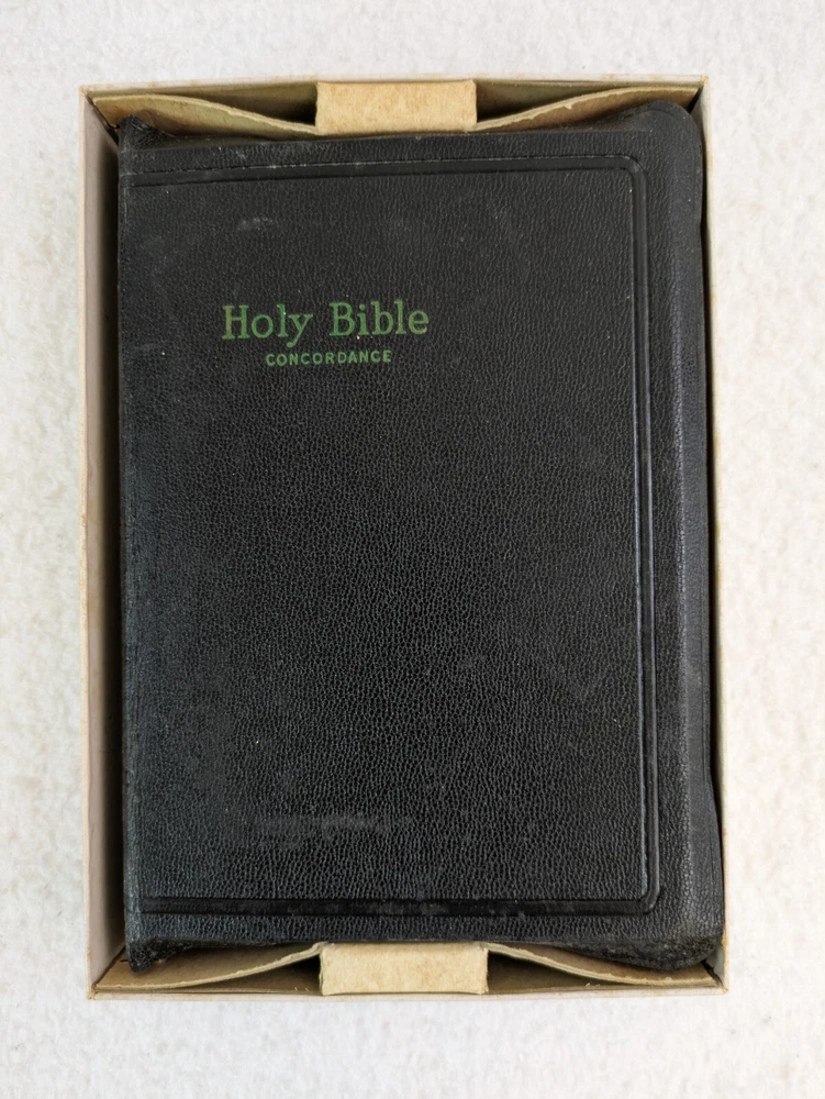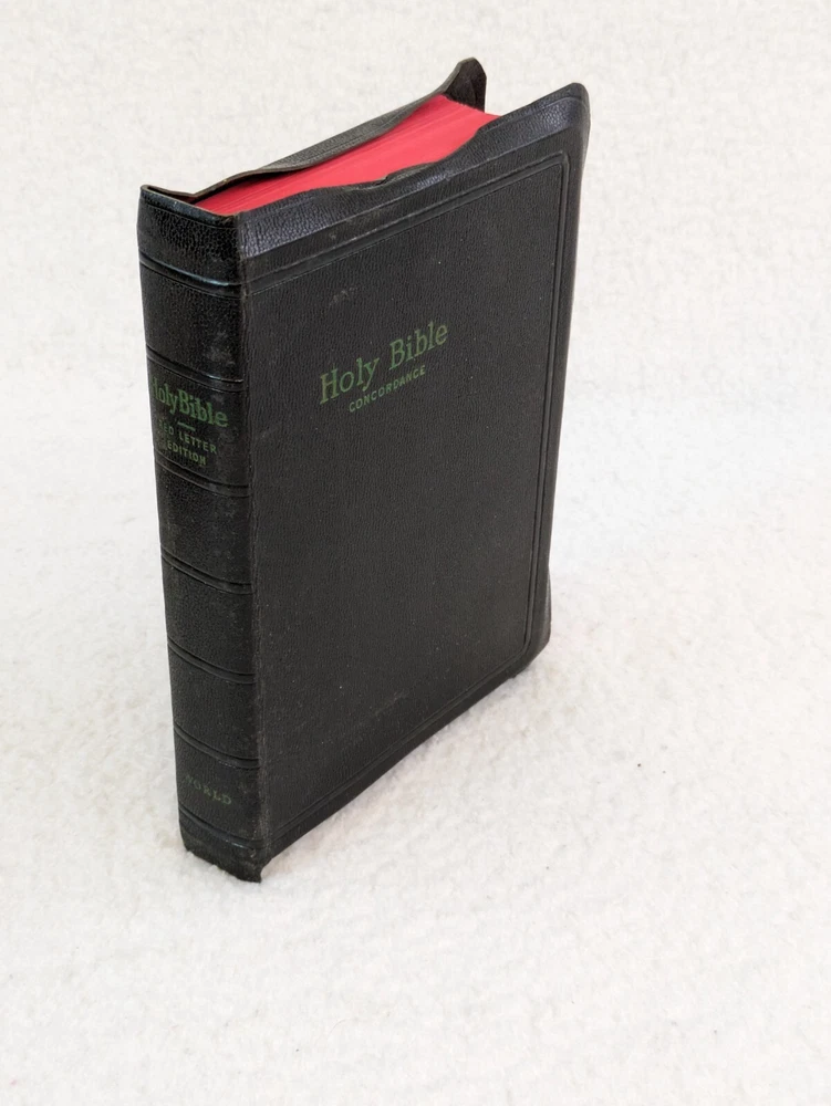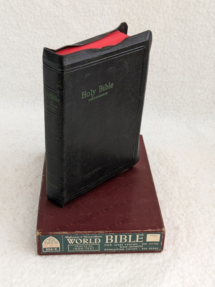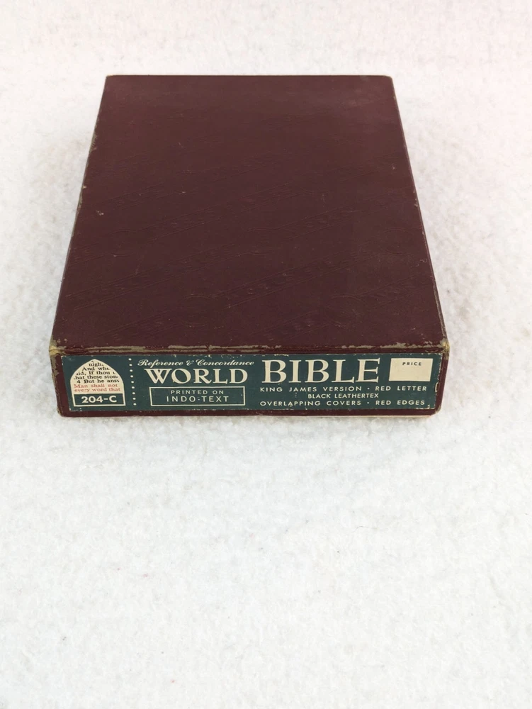 WORLD BIBLE KING JAMES VERSION Red Letter Edition Black Leathertex Overlapping Covers Red Edges World Publishing Company No printing dates. Measures approximately 8.75 in by 6 in. An Imitation Leather Bible in Original Box in Very Good Condition. Box has moderate shelfwear. Name in front. Binding is very tight. Please examine photos for details. Condition: We strive to describe and photograph the condition of every item as accurately as possible. Photos are of the actual item that is being sold. Please examine the photos carefully for any condition details and possible flaws. Best Offers: We consider all offers in relation to current market values. We try to respond almost immediately to most offers. Most of our counteroffers are firm but we are open to bargaining. Shipping: We combine shipping. When ordering multiple items from us please request a total before paying. We charge postage based on weight plus $1 for each eBay listing. All of our orders are packed carefully to prevent damage during shipment. We ship most of our items within 24 hours. Contact Us: We are available 7 days a week and are happy to answer any questions you may have.