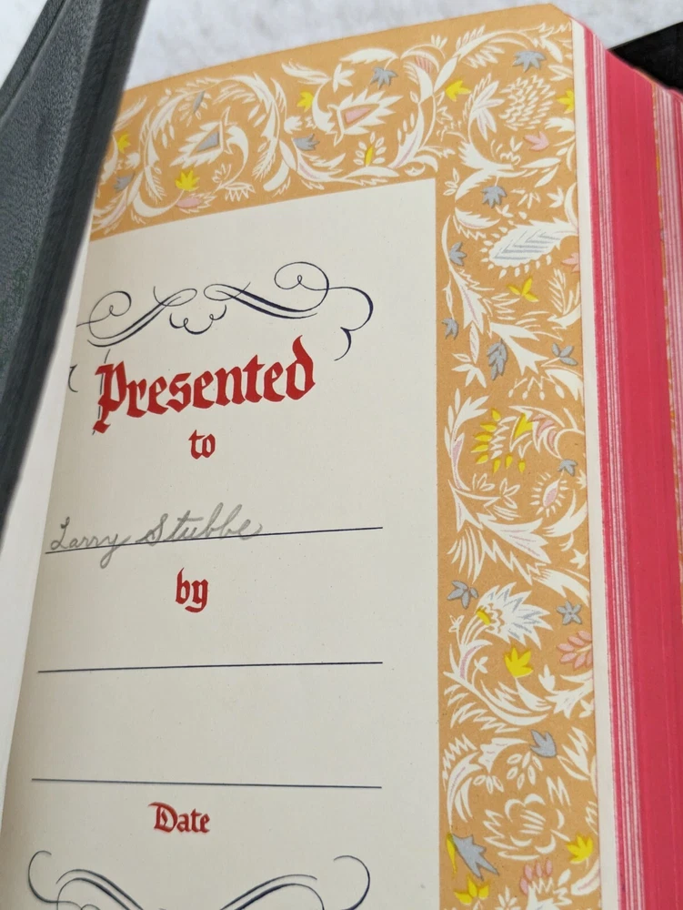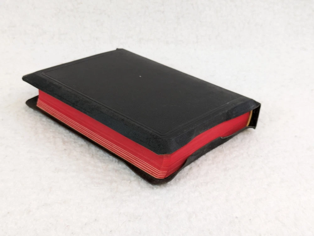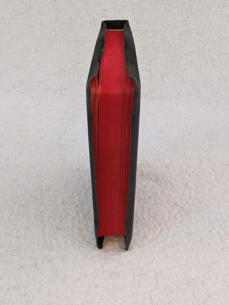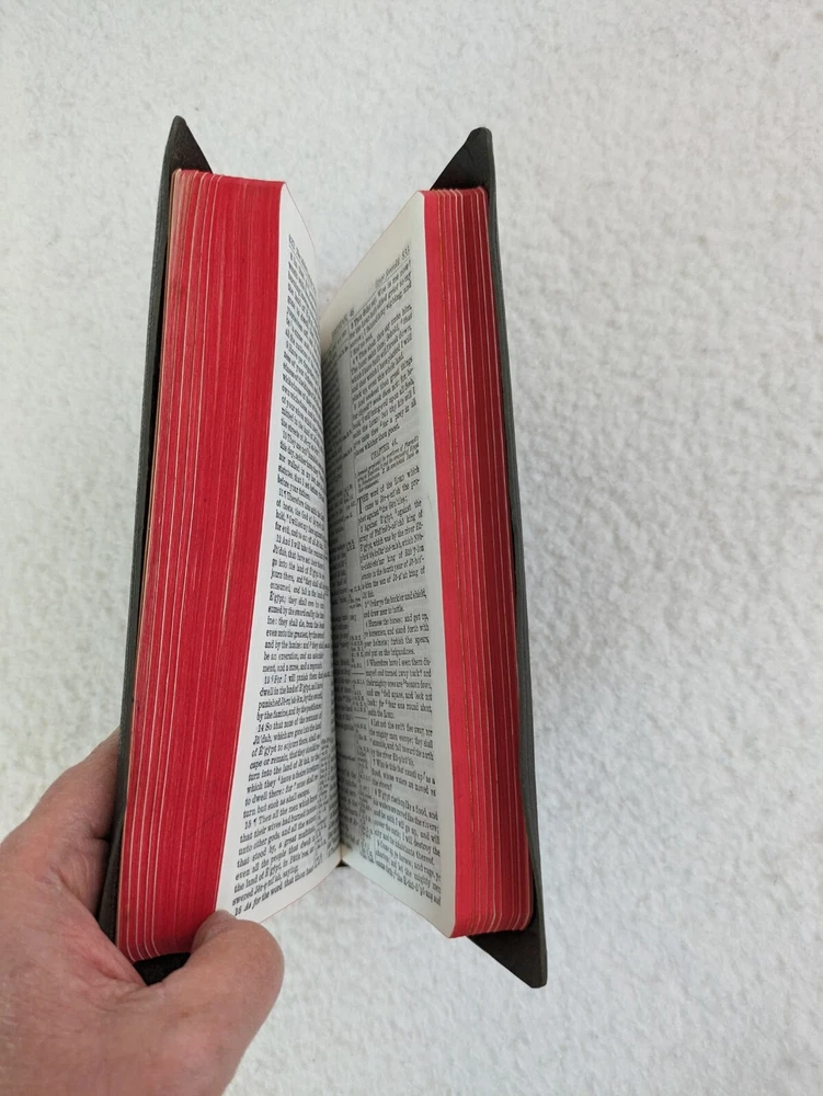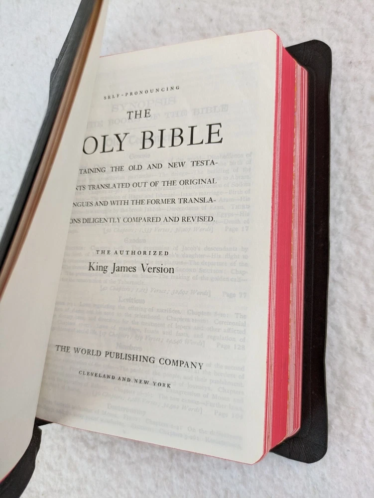 WORLD BIBLE KING JAMES VERSION Red Letter Edition Black Leathertex Overlapping Covers Red Edges World Publishing Company No printing dates. Measures approximately 8.75 in by 6 in. An Imitation Leather Bible in Original Box in Very Good Condition. Box has moderate shelfwear. Name in front. Binding is very tight. Please examine photos for details. Condition: We strive to describe and photograph the condition of every item as accurately as possible. Photos are of the actual item that is being sold. Please examine the photos carefully for any condition details and possible flaws. Best Offers: We consider all offers in relation to current market values. We try to respond almost immediately to most offers. Most of our counteroffers are firm but we are open to bargaining. Shipping: We combine shipping. When ordering multiple items from us please request a total before paying. We charge postage based on weight plus $1 for each eBay listing. All of our orders are packed carefully to prevent damage during shipment. We ship most of our items within 24 hours. Contact Us: We are available 7 days a week and are happy to answer any questions you may have.