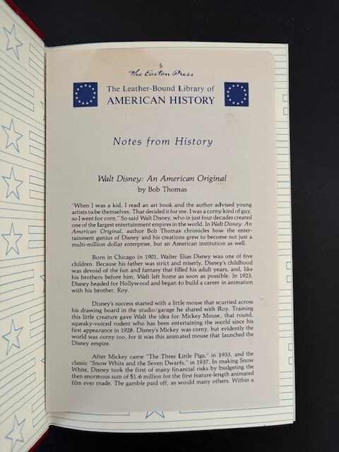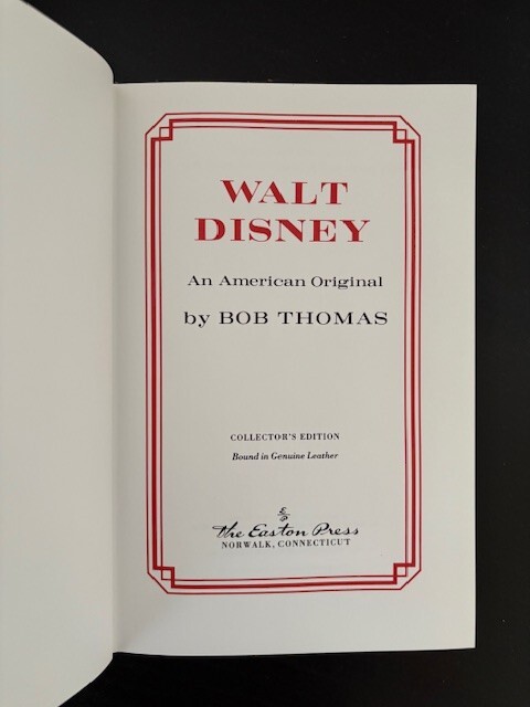 Walt Disney: An American Original by Bob Thomas. Published by The Easton Press in 1990. Collector's Edition Bound in Genuine Leather. The condition is Fine.