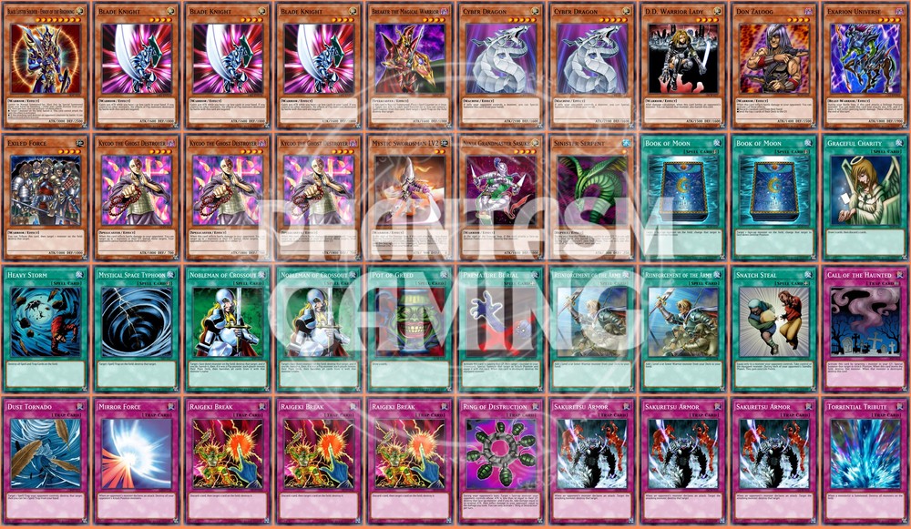 Deck Name: Warrior (Cyber) (B) # Main Deck (40) 1 - Black Luster Soldier - Envoy of the Beginning 3 - Blade Knight 1 - Breaker the Magical Warrior 2 - Cyber Dragon 1 - D.D. Warrior Lady 1 - Don Zaloog 1 - Exarion Universe 1 - Exiled Force 3 - Kycoo the Ghost Destroyer 1 - Mystic Swordsman LV2 1 - Ninja Grandmaster Sasuke 1 - Sinister Serpent 2 - Book of Moon 1 - Graceful Charity 1 - Heavy Storm 1 - Mystical Space Typhoon 2 - Nobleman of Crossout 1 - Pot of Greed 1 - Premature Burial 2 - Reinforcement of the Army 1 - Snatch Steal 1 - Call of the Haunted 1 - Dust Tornado 1 - Mirror Force 3 - Raigeki Break 1 - Ring of Destruction 3 - Sakuretsu Armor 1 - Torrential Tribute You will receive all of the following cards listed above. Most cards will will be in near mint condition. In the case of certain older cards we will do our best but some cards may be light or even moderatly played in extreme condtions. Those conditions being the card has not been reprinted in a number of years and con no longer be easily purchased in light or near mint condition. Set, Rarity, and Edition will vary and cannot be special requested. These lists are constructed with least expensive rarities we have available in stock. All cards are play legal copies. Note: If purchasing a Yugioh Deck all Speed duel cards are 100% legal at all levels of play. Store Policies Here at PMG_LLC , we pride ourselves on having the best customer service around. If you have any questions or can't seem to find something that you want please do not hesitate to contact us. We will do our best to respond to all questions within one business day. Hours of Operation: Monday-Friday: 2:30pm - 10:00pm Saturday- 10:00am - 8:00pm Sunday 11:00am - 5:30pm Note: We are closed all national holidays. Info: Thank you for choosing PMG_LLC . We appreciate your business. We ship Monday through Friday to make sure you get your deck as quickly as possible. All orders priority orders can use combined shipping. In order to use the combined shipping your whole purchase needs to be checked out as one order. We ship once we have received your payment and payment has cleared. As always if you have any questions or concerns please feel free to contact us via email. Shipping Information: We ship Monday through Friday, barring national holidays during which the United States Postal Service is closed. If you purchase a card on Friday or Saturday please bear in mind it will not ship until Monday. US Shipping: First Class Mail : Free. Comes with tracking information. Priority Mail with Delivery Confirmation : $9.99 All orders are shipped in appropriate protective material inside bubble mailers. International Shipping: We do not offer international Shipping Return Policy: You must return items sold and fulfilled by PMG_LLC within 30 days of delivery to be eligible for a refund. Returns which are damaged in the mail due to improper return packaging will receive partial refunds. We will process a full refund for all items returned in their original condition. In order for us to process your full refund you must include the full name associated with the order as well as the eBay order number inside the return packaging. We will not process returns which do not include the buyer's name and order number. Requirements: Please return items with the original plastic packaging. Failure to do so may result in a partial refund. Also you must inform us of any returns you may wish to process before sending them back. Any items simply send back to us without prior contact will not be eligible for refunds. Important Notes Remember that to benefit from our domestic combined shipping on priority orders you must to pay in a single payment. If you place two separate priority orders you will be charged the $7.50 shipping fee for both orders. If you place multiple orders for Priority shipping you will be charged the corresponding shipping costs for each order, even if you place the orders on the same day. We do not refund shipping costs as we tend to package orders throughout the day and may not notice that you would otherwise have qualified for combined shipping. We want to provide you with 5 Star service and earn your Positive Feedback, so if for any reason you are not happy with your transaction, contact us before leaving feedback. Business Day - Our business day runs from Monday to Friday from 9am to 4pm, excluding US national holidays. Any orders placed or payments cleared less than 4 hours before the close of business will be considered orders from the following business day.