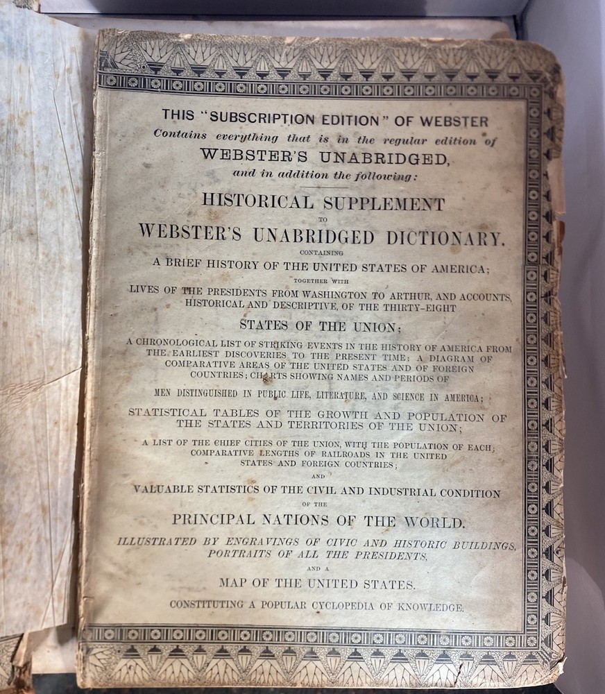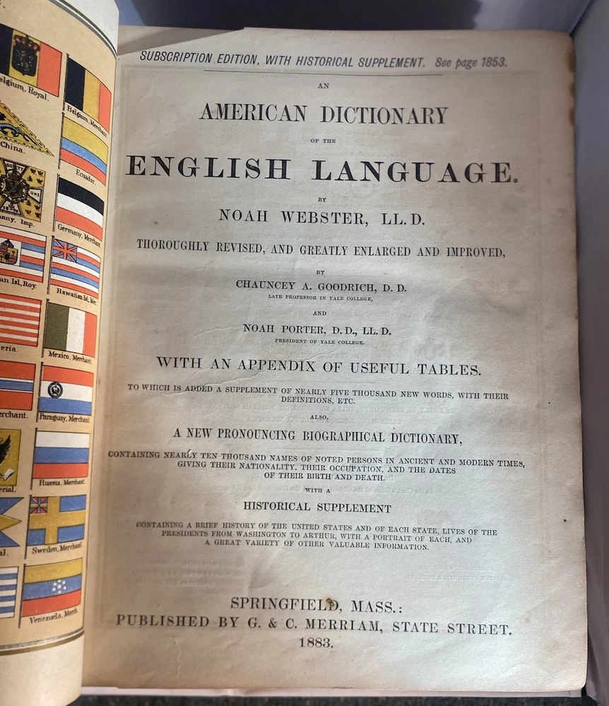 This is a rare and valuable antique edition of Webster’s Dictionary, Unabridged, from 1883. It is a collector's edition with special attributes such as being a first edition, subscription edition, historical supplement, illustrated, and limited edition. The dictionary is in its original leather binding and was published in Springfield, Mass, in the United States. The dictionary is also a manuscript edition, making it even more unique. This dictionary is an excellent reference for anyone interested in North American English and its history. It is a great addition to any collection of antiques and collectibles, especially for those interested in dictionaries. Get your hands on this limited edition Webster’s Dictionary Unabridged "Subscription Edition" 1883 Antique today!