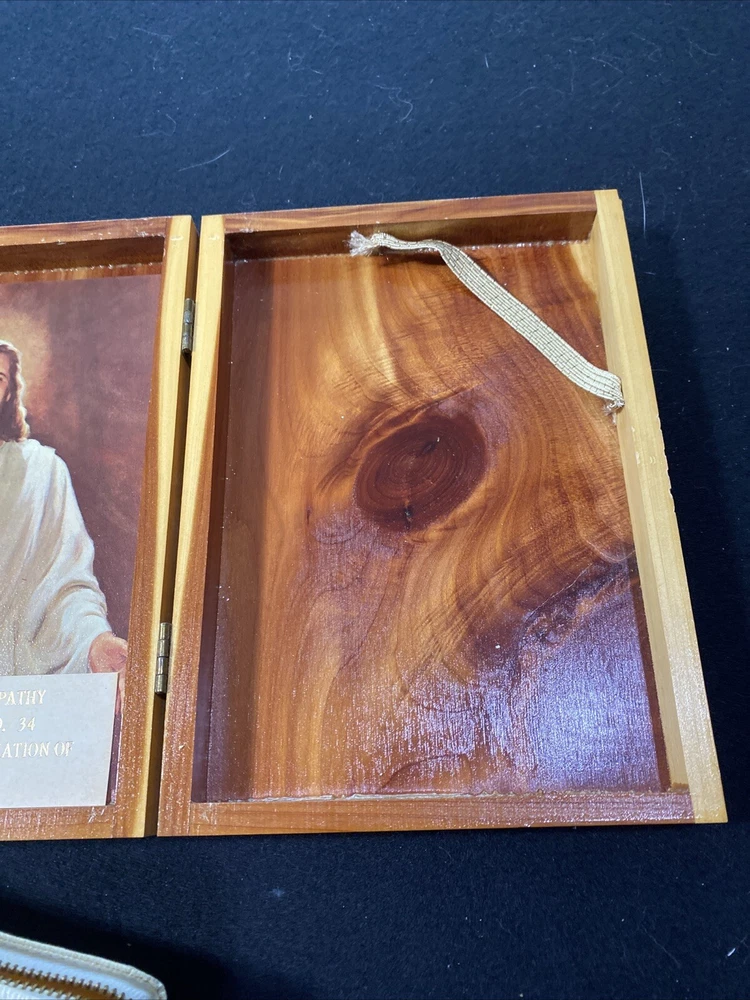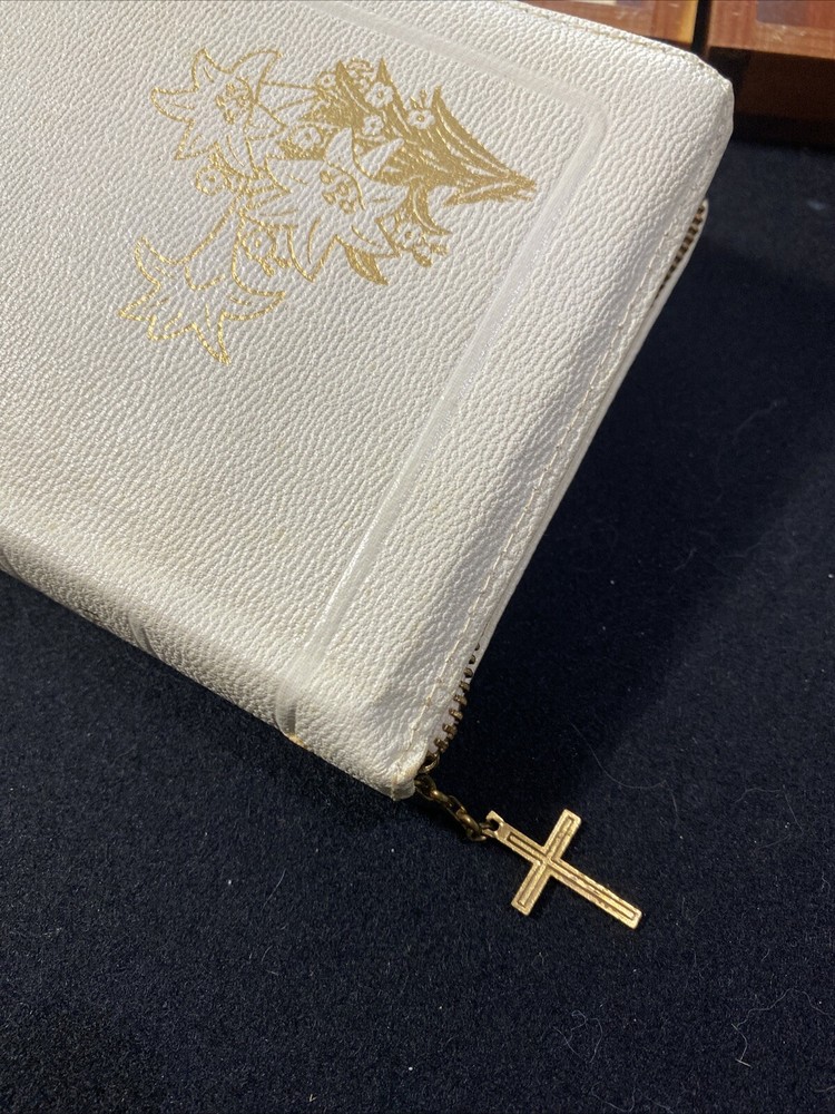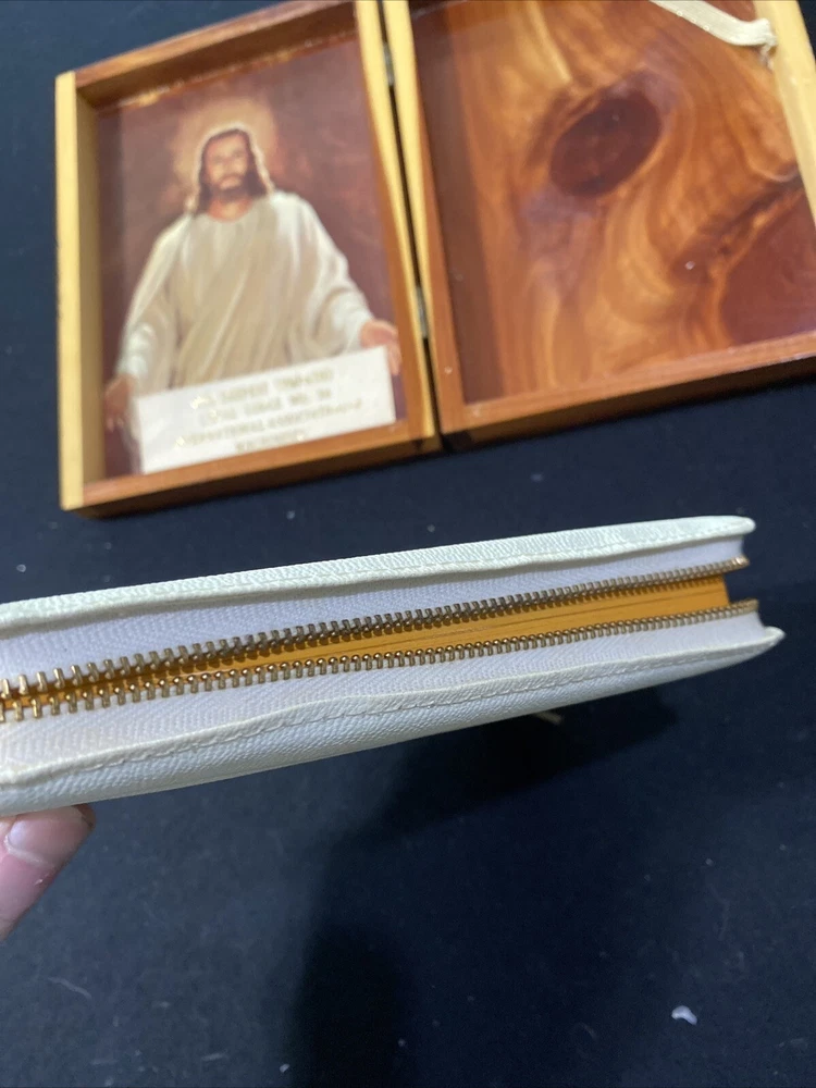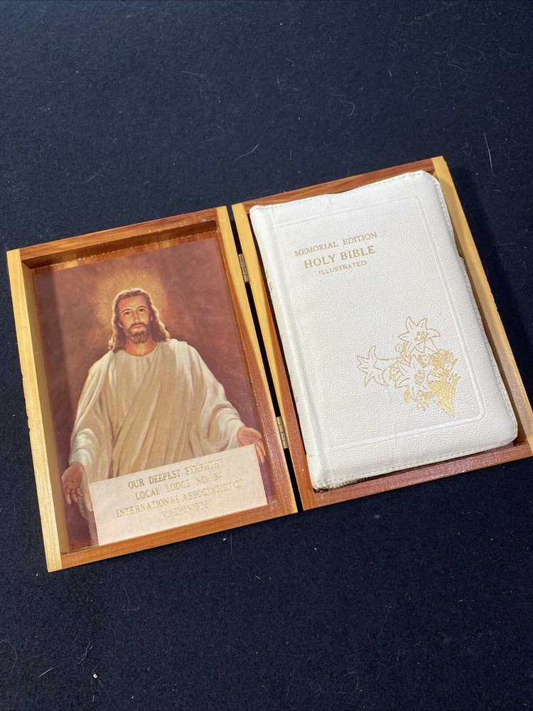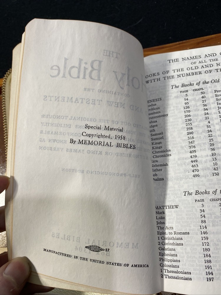 First page has been written in and hinge for wood case is missing This vintage 1958 Holy Bible Memorial Edition Concordance is a must-have for any collector or lover of religion. With beautiful color photos and illustrations, this leather-bound book is a true gem. The book is signed and has a zipper closure for safekeeping. The book was published by Memorial Bibles in Nashville and is an original copy printed in 1958. The book is written in English and has special attributes such as being illustrated and zippered. The author of this book is God, making it a one-of-a-kind piece. Don't miss out on adding this rare and special book to your collection.