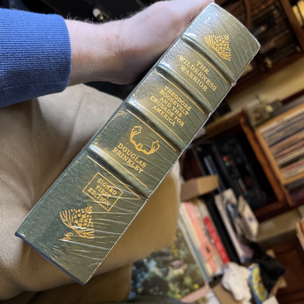 This is a SEALED first edition leather-bound book titled "Wilderness Warrior: Theodore Roosevelt and The Crusade for America" written by Douglas Brinkley and published by Easton Press. The book is signed by the author and is an original copy. It belongs to the Biography & Autobiography and History topics. The book's binding is in leather, and it is written in English.