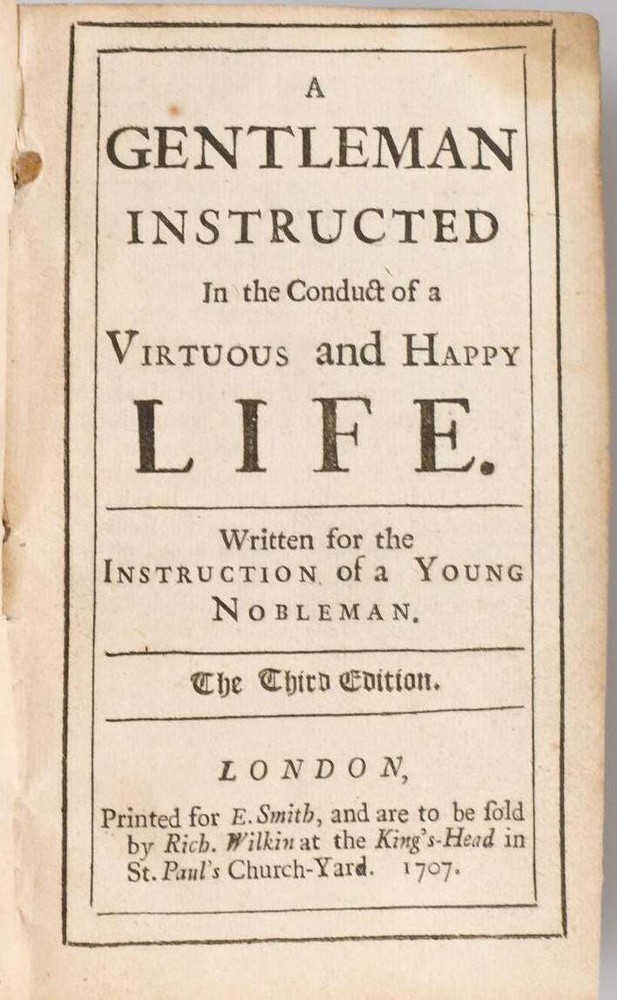[RELIGION] A GENTLEMAN INSTRUCTED IN THE CONDUCT OF A VIRTUOUS AND HAPPY LIFE. WRITTEN FOR THE INSTRUCTION OF A YOUNG NOBLEMAN Author: [William Darrell] Title: [RELIGION] A GENTLEMAN INSTRUCTED IN THE CONDUCT OF A VIRTUOUS AND HAPPY LIFE. WRITTEN FOR THE INSTRUCTION OF A YOUNG NOBLEMAN Publication: London: E. Smith, 1707 Edition: Third Edition Description: Full Leather. 8vo.; in full speckled calf, with a blank spine; 164 pages.~~This follows the 1704 Second Edition; the next edition in 1708 had a supplement, "A Word to the Ladies". The book was in its Tenth Edition by 1731.~~William Darrell was a Jesuit. amd was procurator of the province in Paris. He was prefect of studies in the college of St. Omer in 1696, and subsequently fillege the same office at Liege. He was also professor casuistry at Liege, and rector of the college from 1708 to 1712. In 1712 he again became procurator of the Province in Paris. He died at St. Omer in 1721. Very Good binding. Seller ID: 297595 Black Swan Books Richmond VA We specialize in antiquarian books, classic literature, the Civil War, Viriginiana, travel, art, children's books, and other subject areas, including religion and philosophy . Terms Payment via PayPal is preferred. All orders ship within two [2] business days, Monday through Friday by standard mail, USPS Media Mail. Combined orders and expedited shipping is available. Please contact us for a shipping quote before ordering. All items are guaranteed as listed and described. Any item may be returned within 30 days for any reason in the condition is which they were sent. This listing was created by Bibliopolis.
