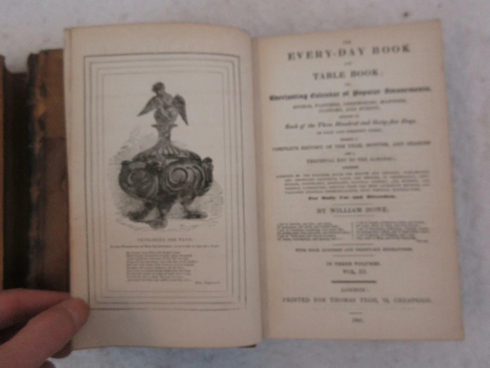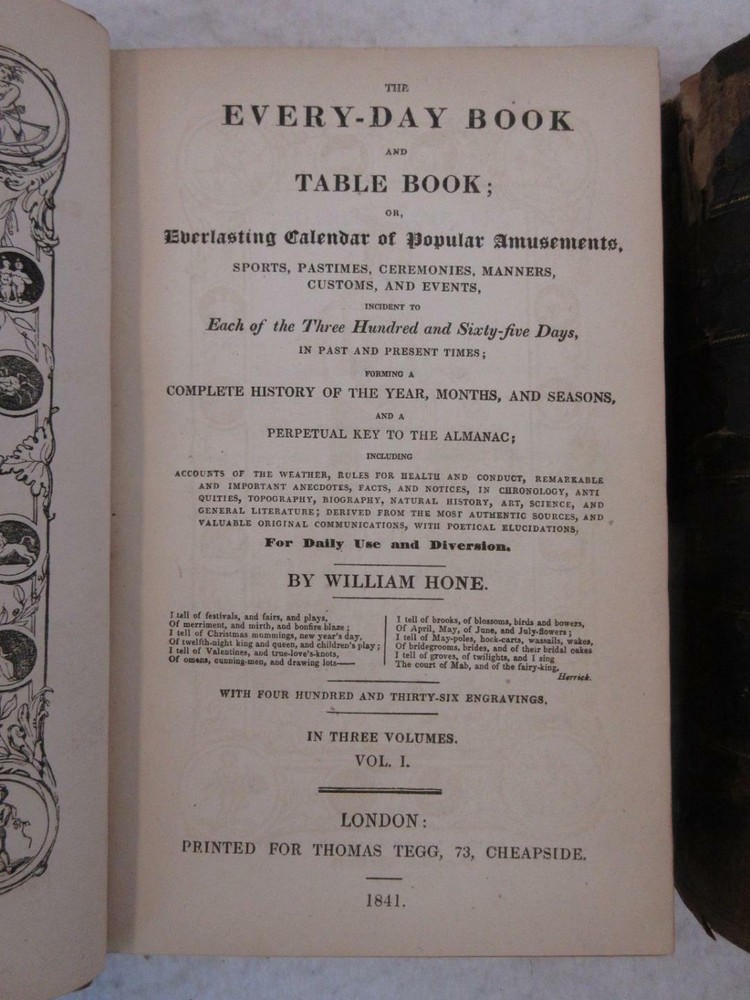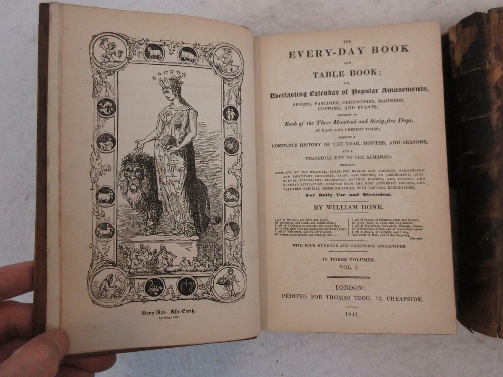 William Hone THE EVERY-DAY BOOK AND TABLE BOOK Three volumes, complete 1841, Thomas Tegg, London The bindings are in poor condition and appear to have been scorched by a fire many, many years ago. I cannot detect any odors other than that old book smell. A few pages in the rear of volume 2 have old moisture stains. Amazingly, the textblocks are clean and are worthy of new bindings. Please examine photos for details. Condition: We strive to describe and photograph the condition of every item as accurately as possible. Photos are of the actual item that is being sold. Please examine the photos carefully for any condition details and possible flaws. Best Offers: Items are available for offers only after being listed for 30 days. We consider all offers in relation to current market values. We try to respond almost immediately to most offers. Most of our counteroffers are firm but we are open to bargaining. Shipping: We combine shipping. When ordering multiple items from us please request a total before paying. We charge postage based on weight plus $1 for each eBay listing. All of our orders are packed carefully to prevent damage during shipment. We ship most of our items within 24 hours. Contact Us: We are available 7 days a week and are happy to answer any questions you may have. The complete eBay Selling Solution.